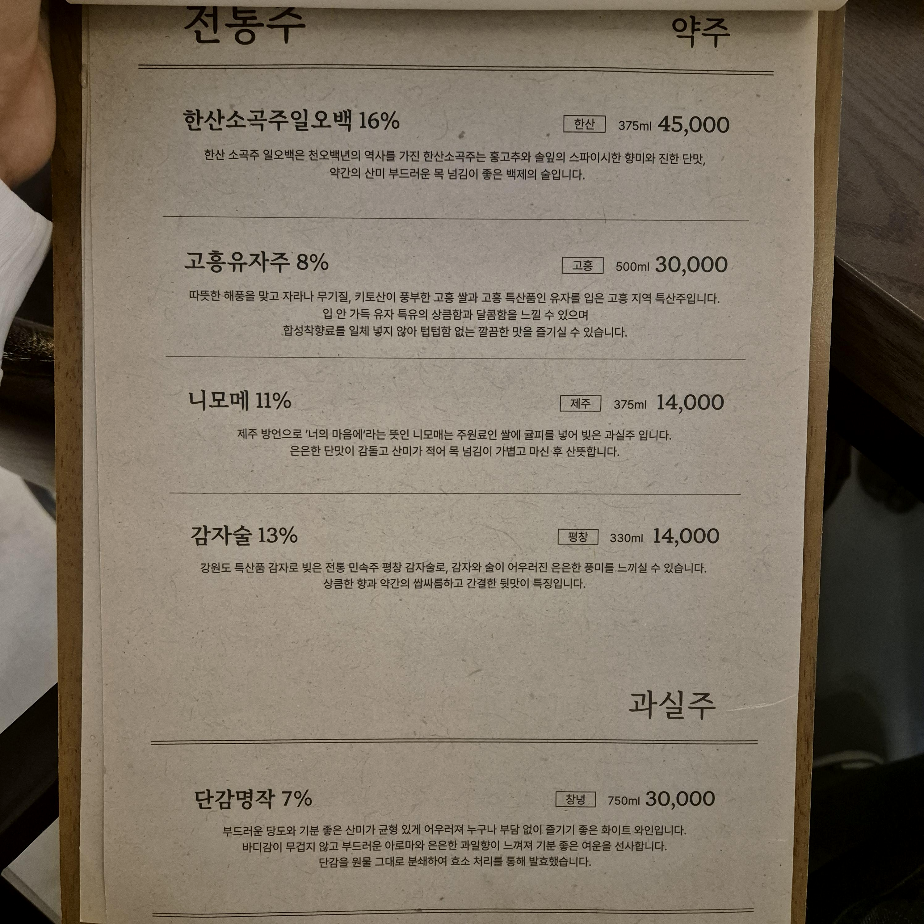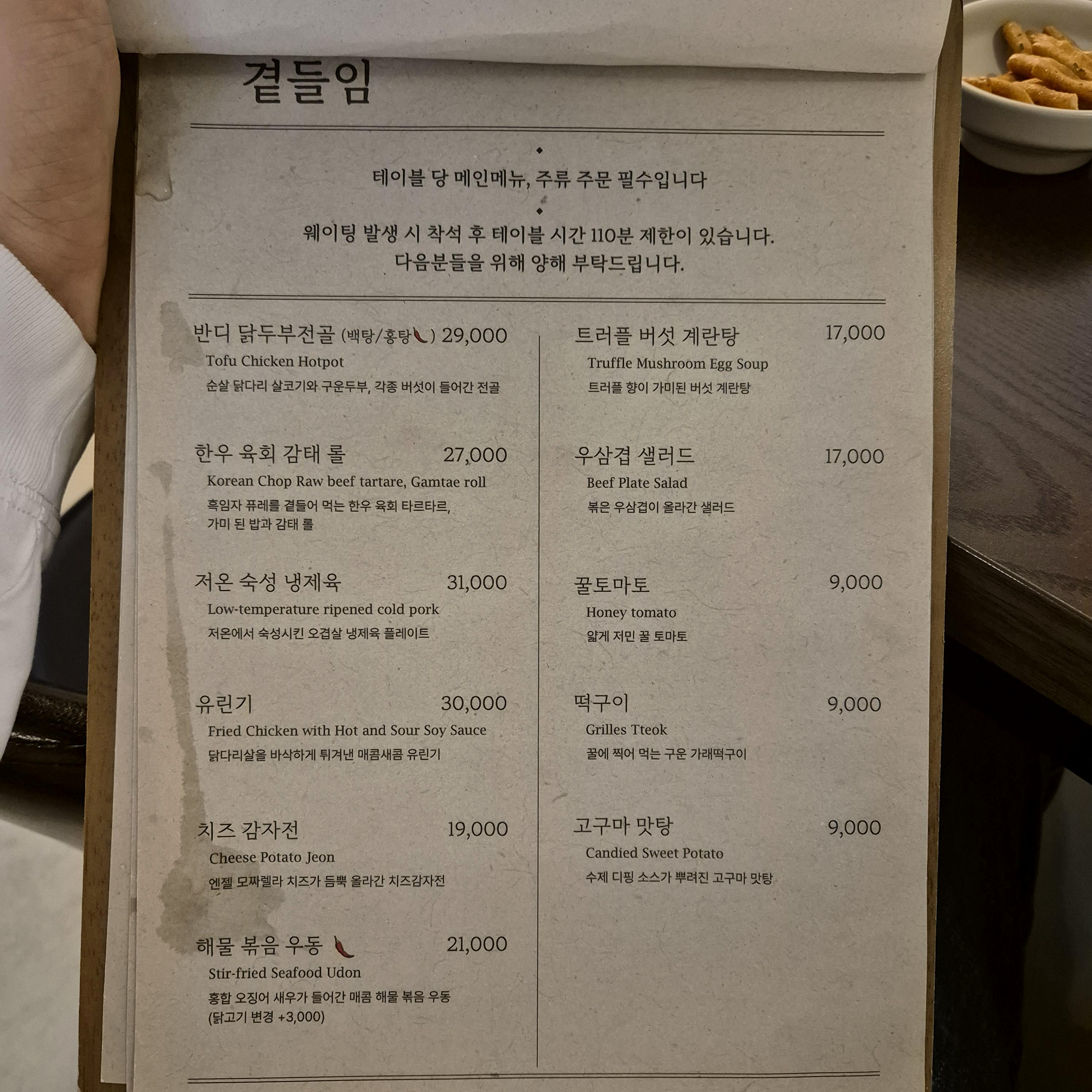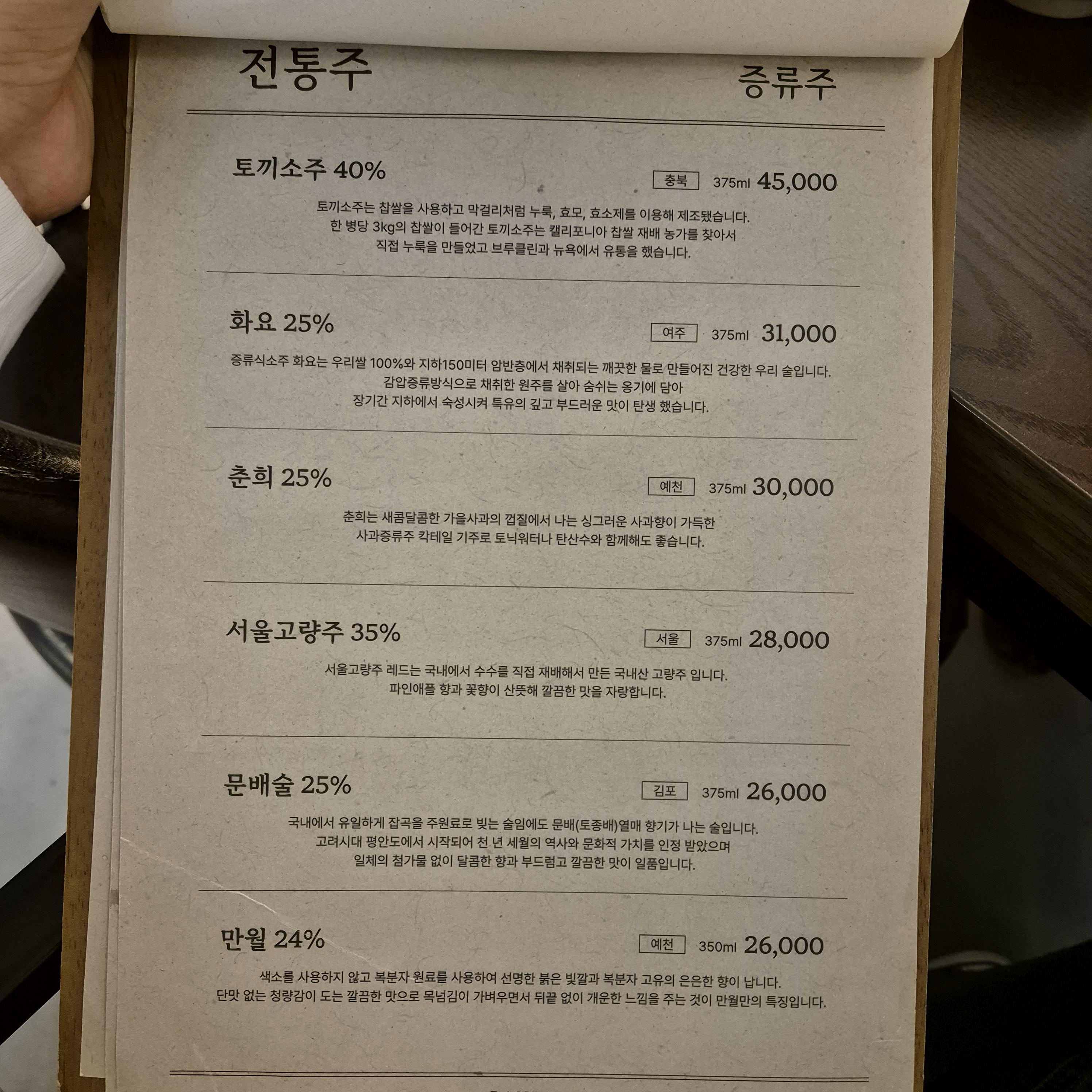 내부도 이미 사람이 꽉 차있었는데, 예약을 하지 않았다면, 우리는 아마 먹지 못했을 가능성이 높았겠다. 간단하게 파티를 하는 일행들도 있었고, 누가 봐도 소개팅을 하는 커플도 2~3 커플 보였다. 서순라길 소개팅 명소 같은 느낌도 들었다. 일행 한 명이 조금 늦어져서 먼저 시키기로 하였다.