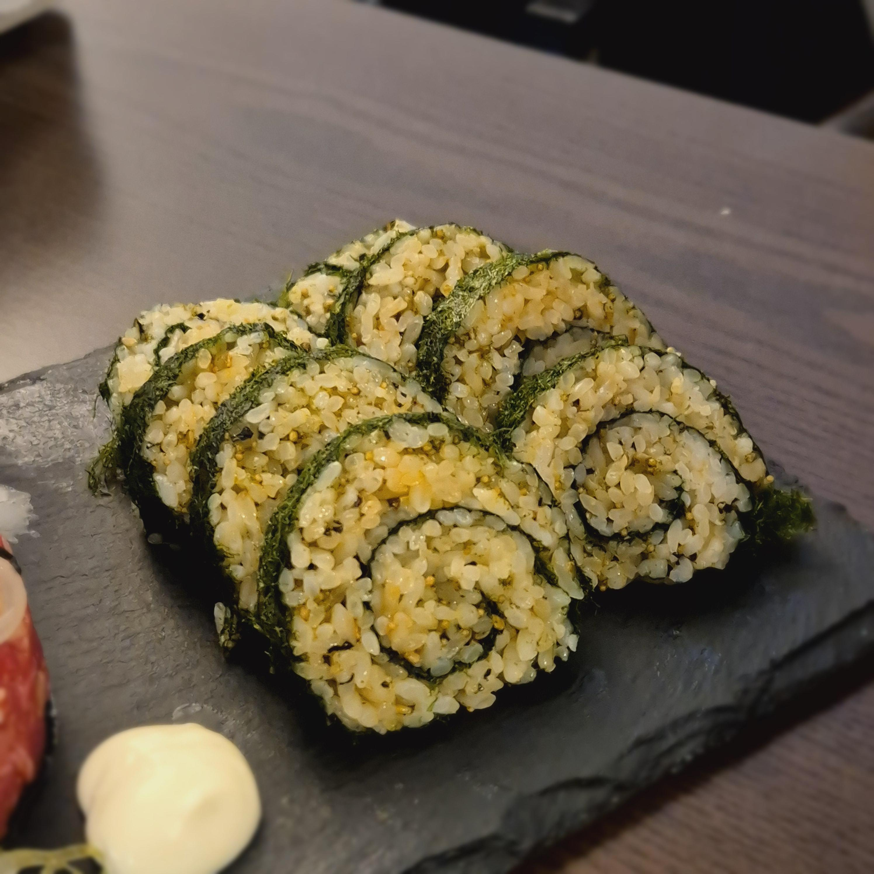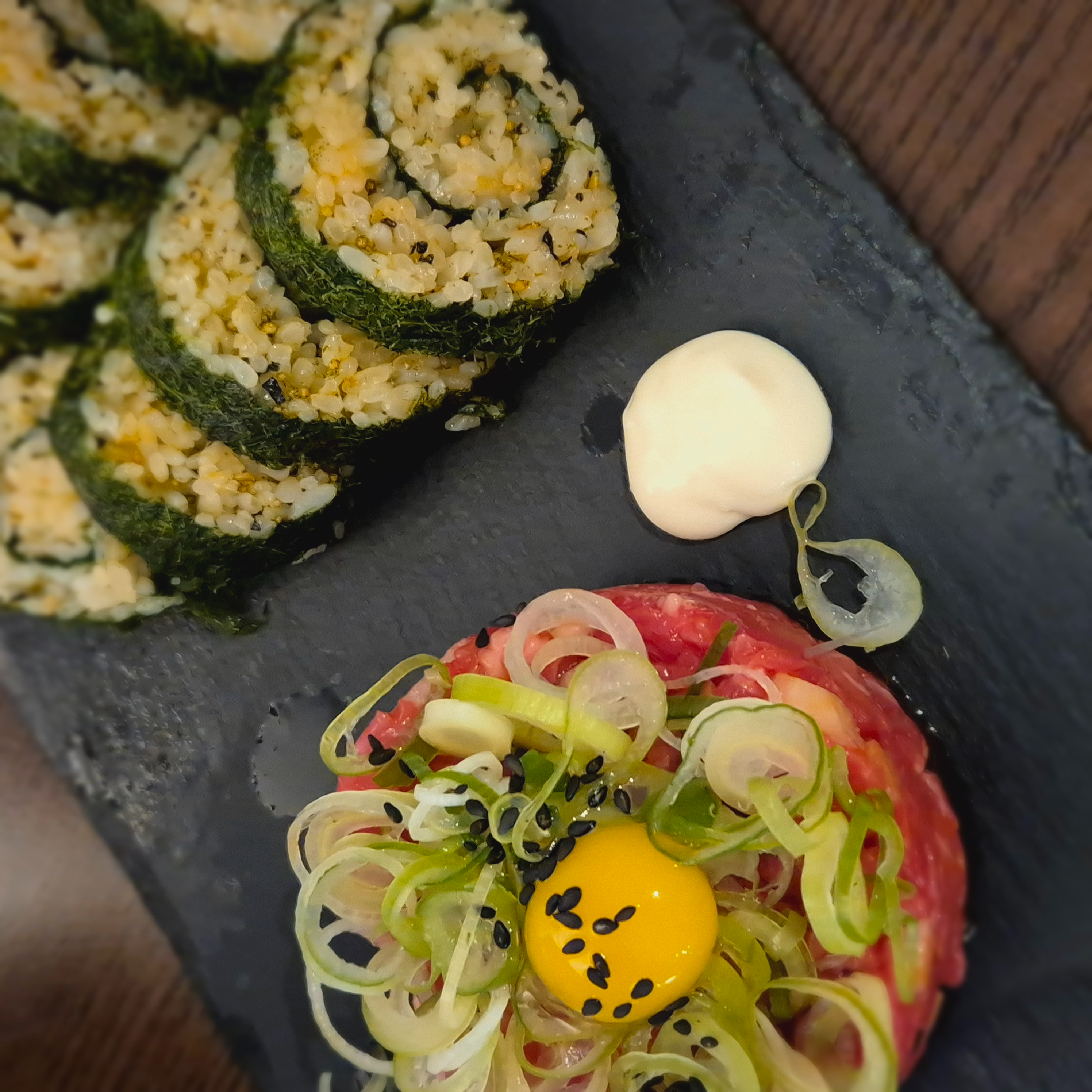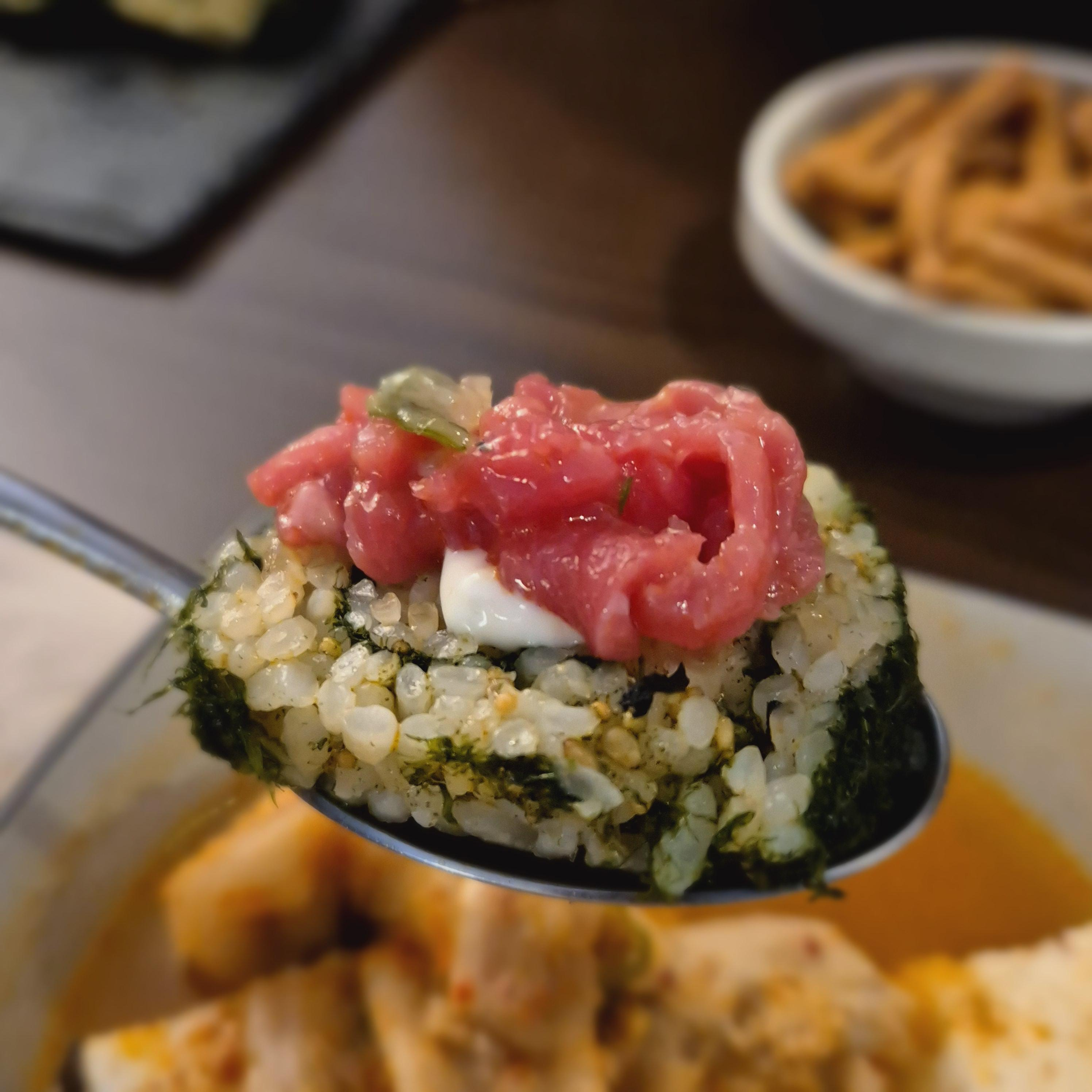 맛있었으나 양이 적어서 뭔가 아껴먹게 되는 그런 메뉴였다. 육회는 생각했던 맛이었고, 감태롤은 조금 독특해서 맛있었다. 일반 백미가 아닌 가미된 밥에 고소한 감태가 잘 어울렸고, 그 위에 한우육회를 살짝 얹고, 타르타르소스까지 딱 찍어먹으면 조화로운 맛에 '오우~' 리액션이 절로 나왔다.
