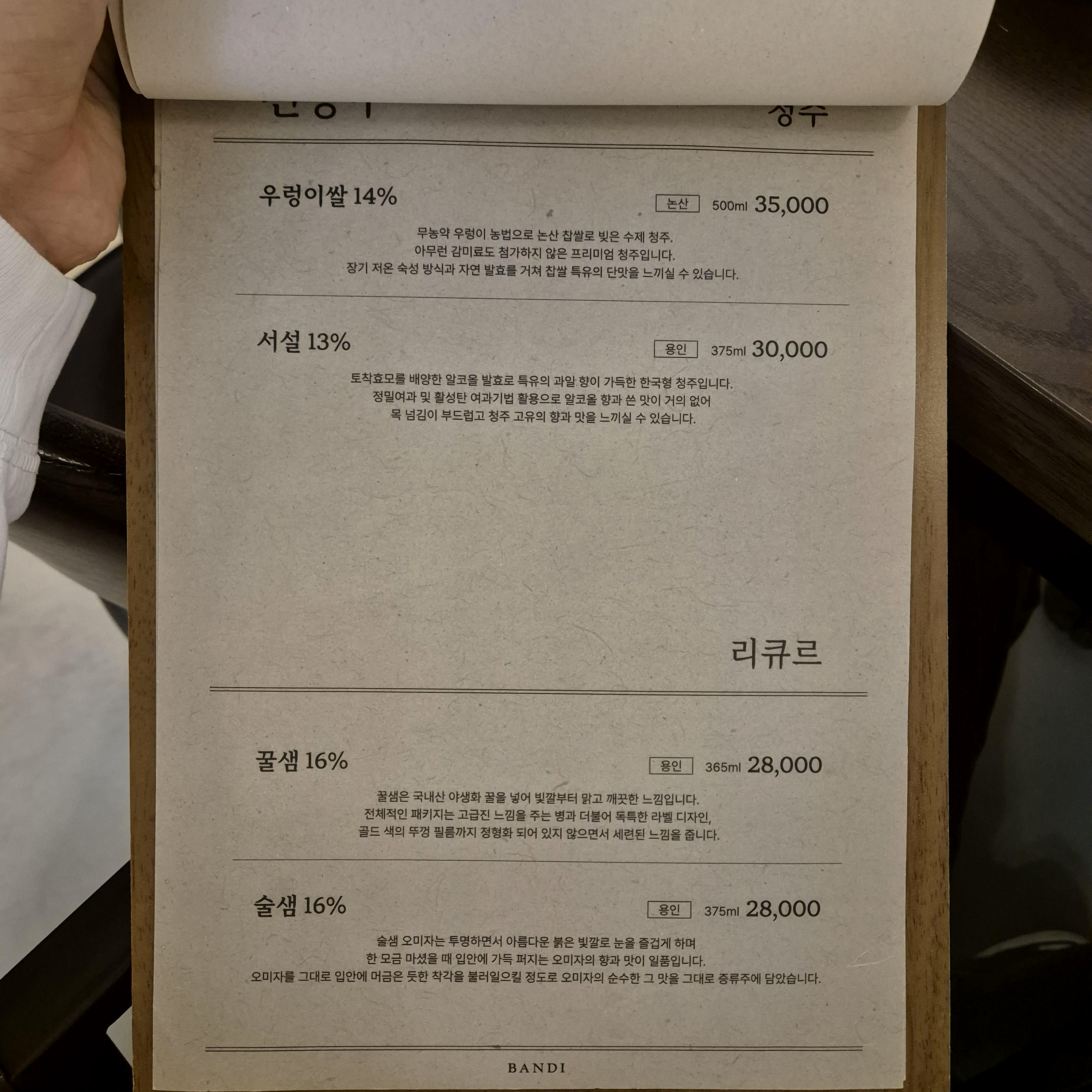 한식요리가 주를 이루는 것 같았고, 그 외 약간 퓨전식의 메뉴들이 눈에 띄었다. 그리고 무엇보다 다양한 술을 파는 반디였지만, 소주가 메뉴에 없어서 조금 의아하긴 했다. 일단 내부로 들어가 봤다.
