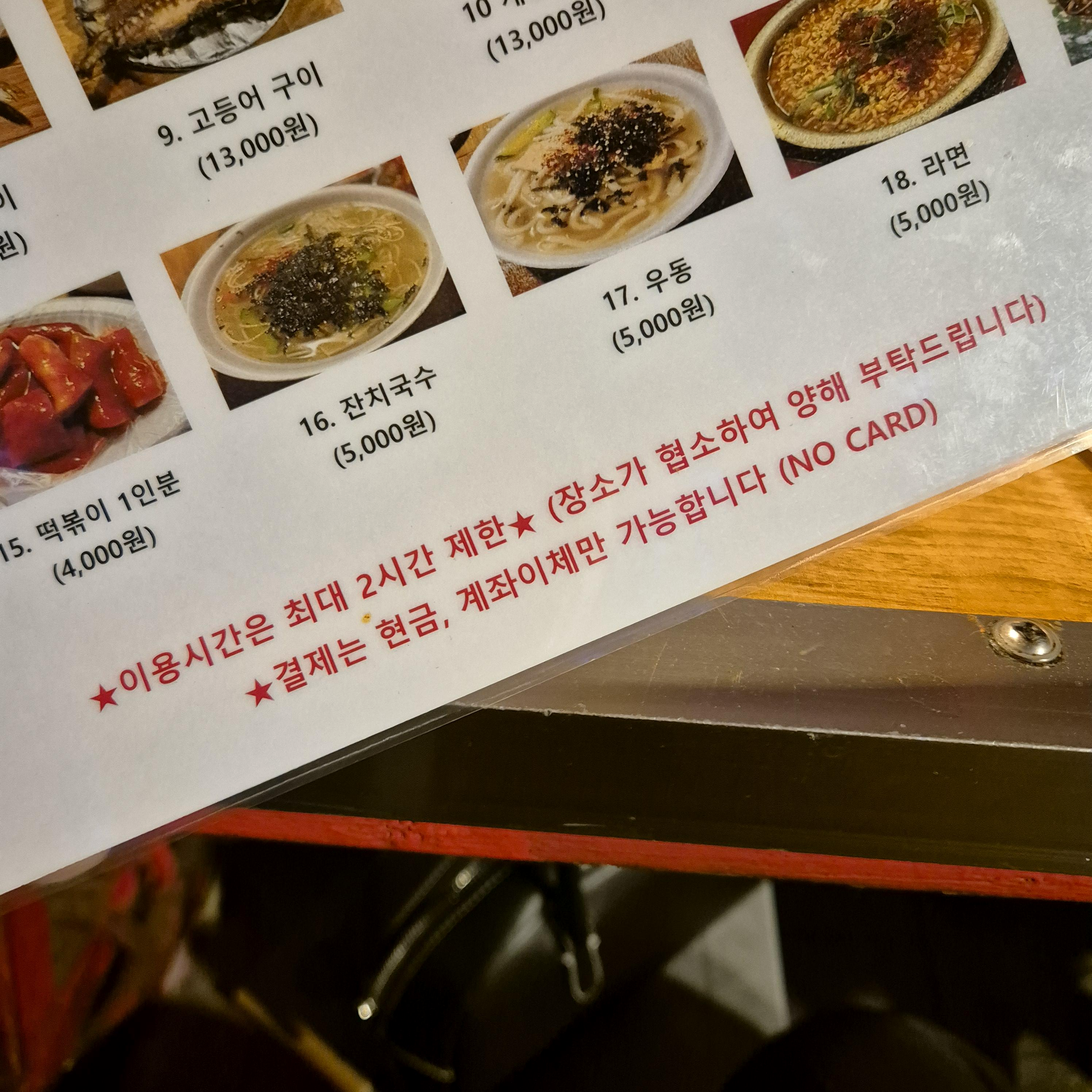 1번세트 오징어숙회 + 떡볶이 와 6번세트 곱창볶음 + 오뎅탕 을 시켰다. 생각보다 나쁘지 않은 가격에 "오 괜찮은데?" 라는 표정으로 서로 눈빛 교환을 했다. 당연히 술도 파는데, 소주가 4천원이라 더 마음에 들었다.^^ 그리고 포차의 특성(?)상 이용시간은 2시간으로 제한되어있고, 결제는 현금, 계좌이체만 받는다. 처음 주문할 때 시간을 적어두시고, 2시간 즈음 되면 손님들께 양해를 구한다.