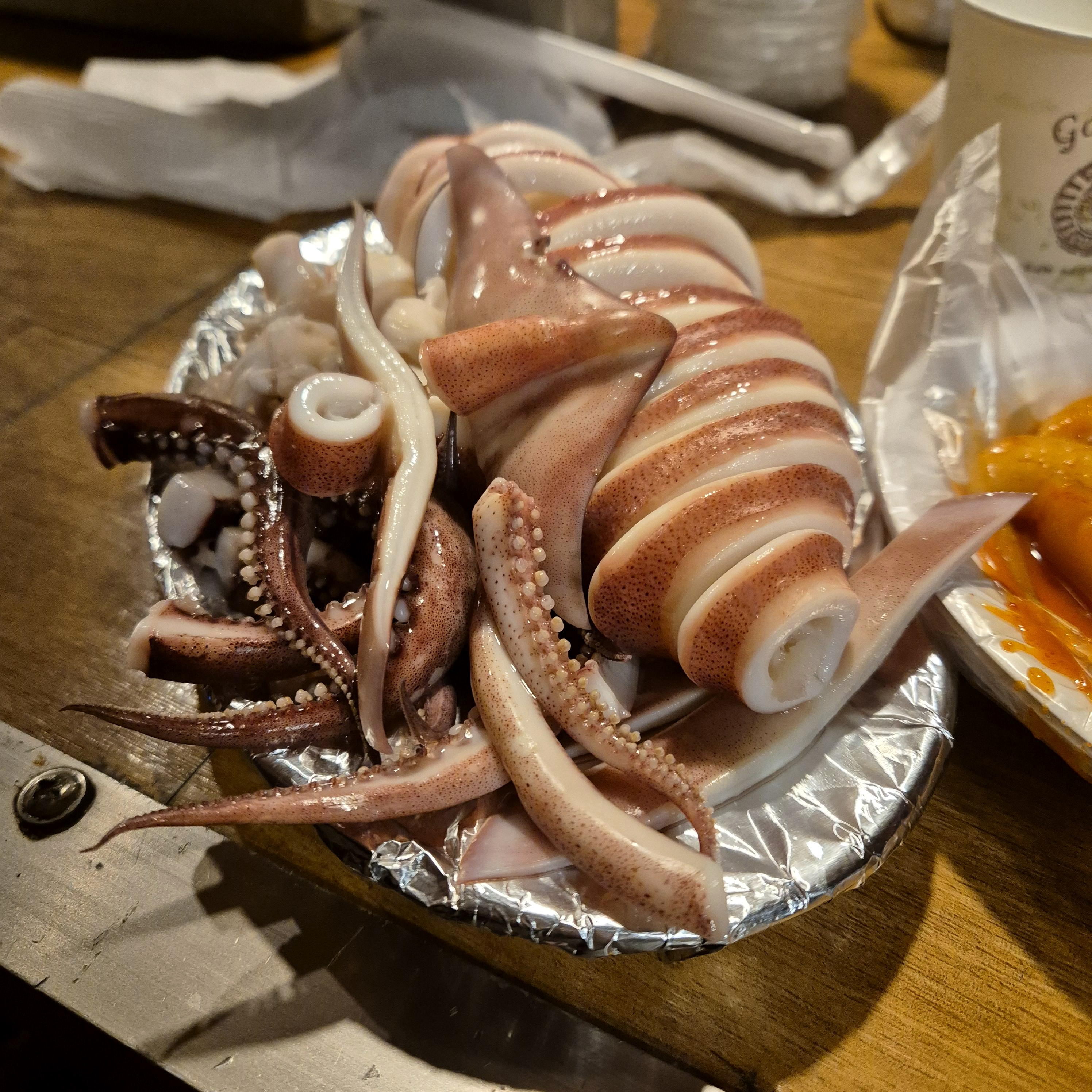 처음 딱 보고 "비주얼 장난 아니다"라는 생각을 했다. 요즘 오징어 값이 많이 올랐다고, 뉴스에서 난리였던거 같은데, 이게 떡볶이까지해서 18,000원 이면 상당히 합리적인 가격이라는 생각이 들었다. 포동포동, 탱글탱글 이라는 수식어가 전혀 아쉽지 않을 만족감 100프로의 오징어 숙회였다.