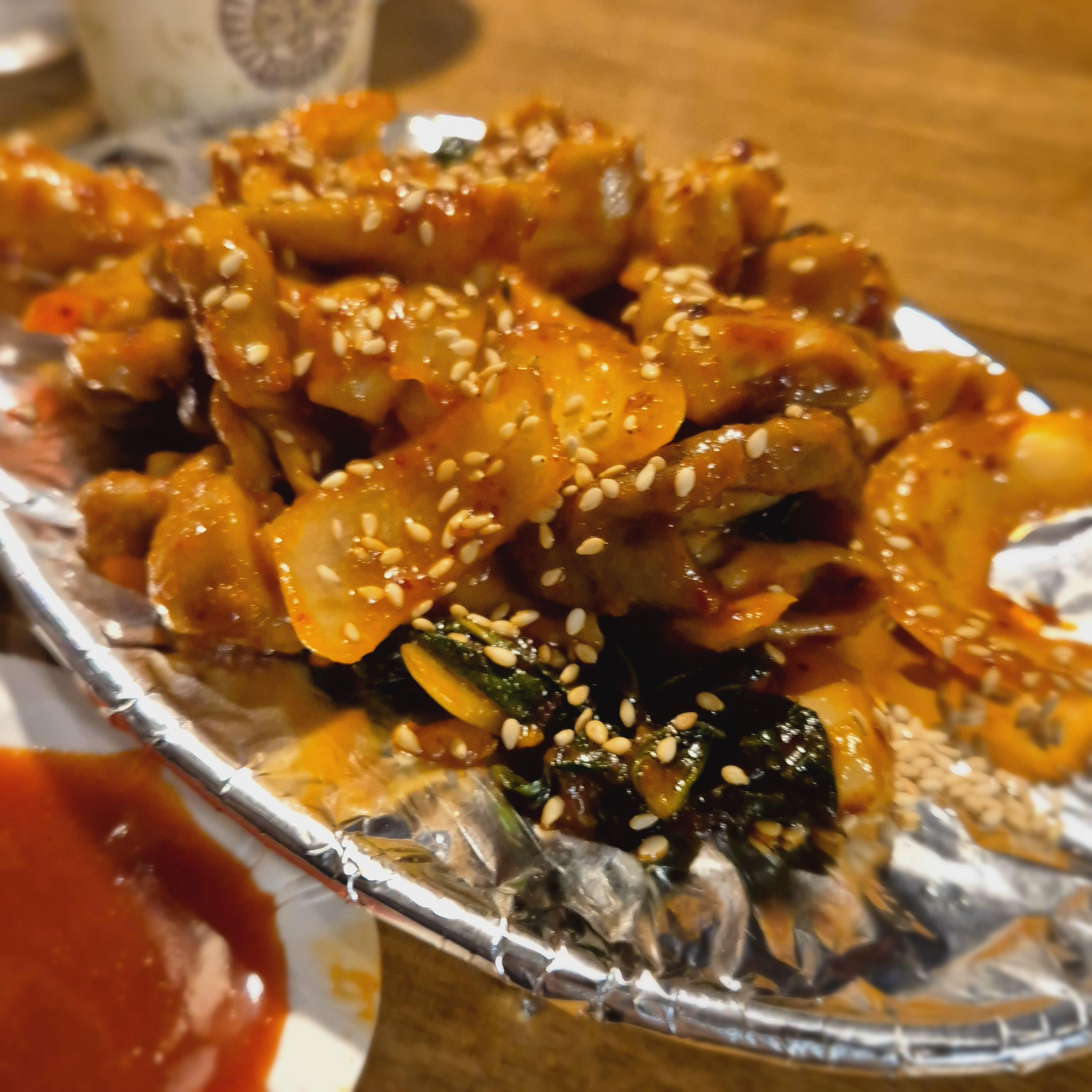 곱창볶음을 시키면 여자사장님께서 옆에서 지글지글 슥슥 볶아주시는데, 곱창볶음 또한 일단 맛있었다. 오징어숙회를 보고 곱창볶음을 보니, 숙회보단 적은 양이었지만, 갖출건 다 갖춰진 미니 곱창 느낌이었다. 곱창은 쫄깃하고, 소스는 달콤하면서도 약간 매콤했다. 같이 볶아진 양파마져 맛있었다. 오뎅탕도 주셨는데, 깜박하고 사진을 찍지 못했다.