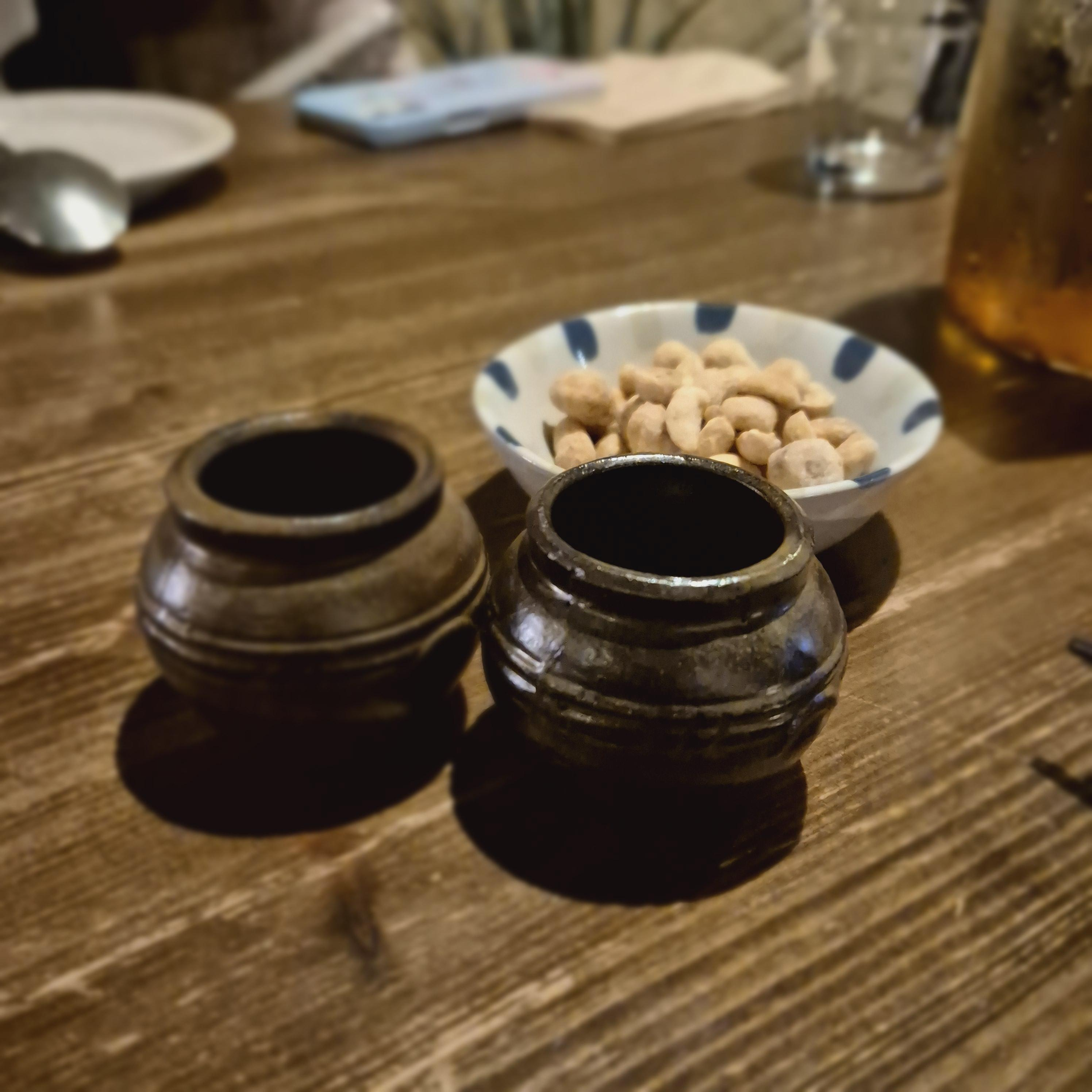 보리차인지 무슨 차인지 조금 헷갈렸지만 물이 너무 시원해서 좋았다. 술을 시킬걸 미리 아셨는지, 술잔을 미리 주셨는데, 초미니 항아리 같은 술잔이 너무 귀여워서 한번 찍어보았다. 이따 술이 와서 따라봤는데, 장점은 귀여운데 단점은 얼마나 따랐는지 잘 안 보인다. 같이 준 땅콩도 메인음식이 나오기 전 심심풀이로 먹을 법했다. 이상하게도 배가 많이 고프지 않았던 우리 일행은 무엇을 먹을지 고민했다.