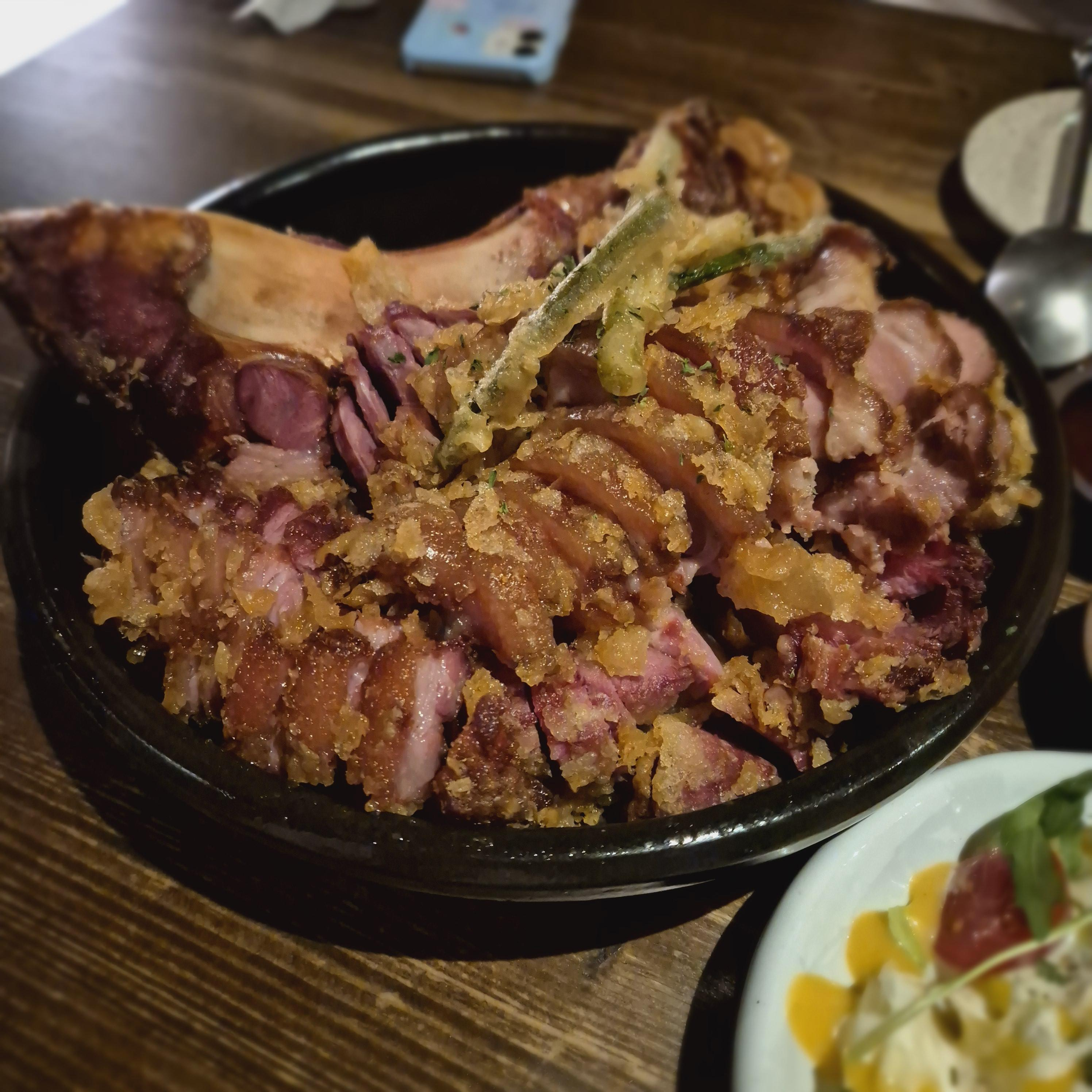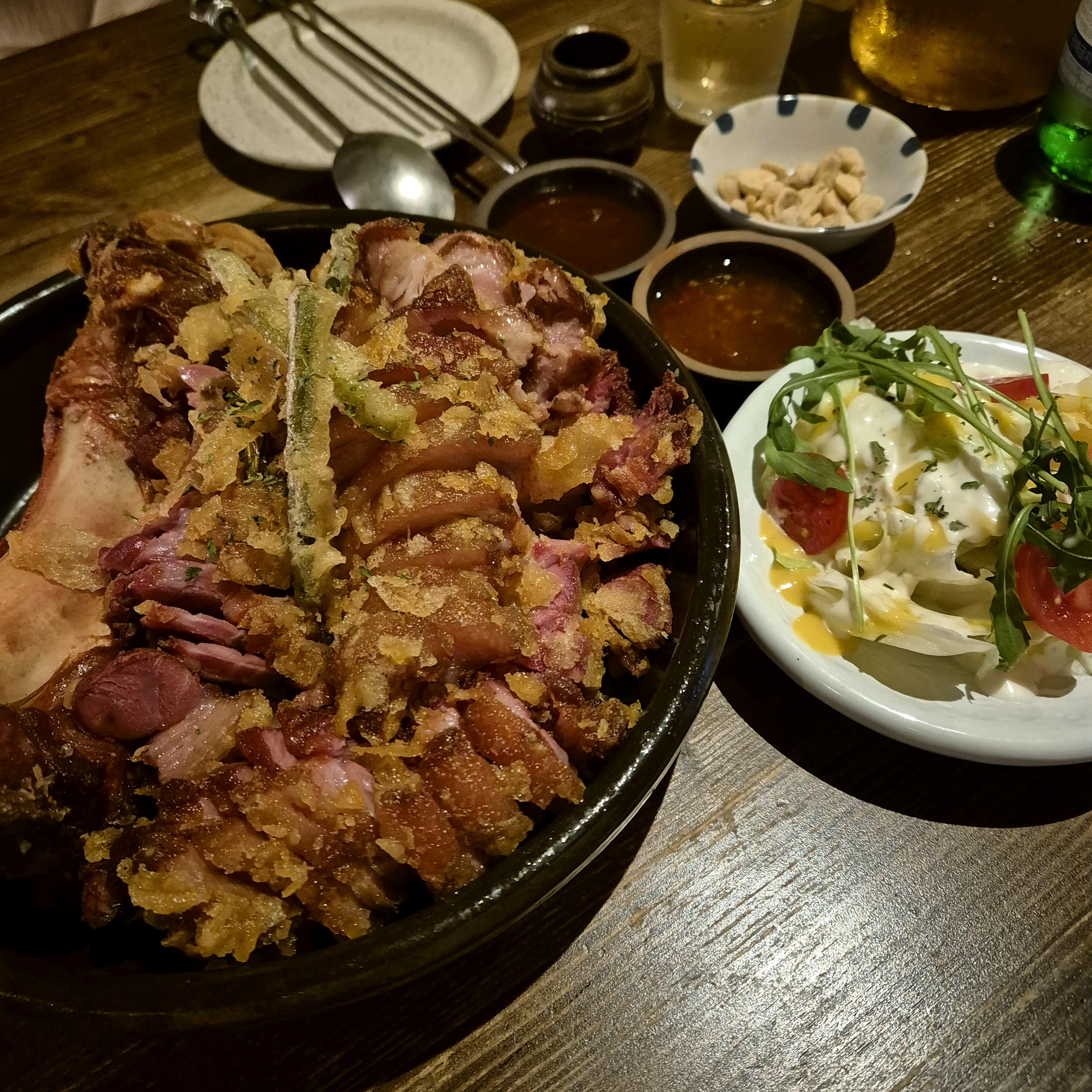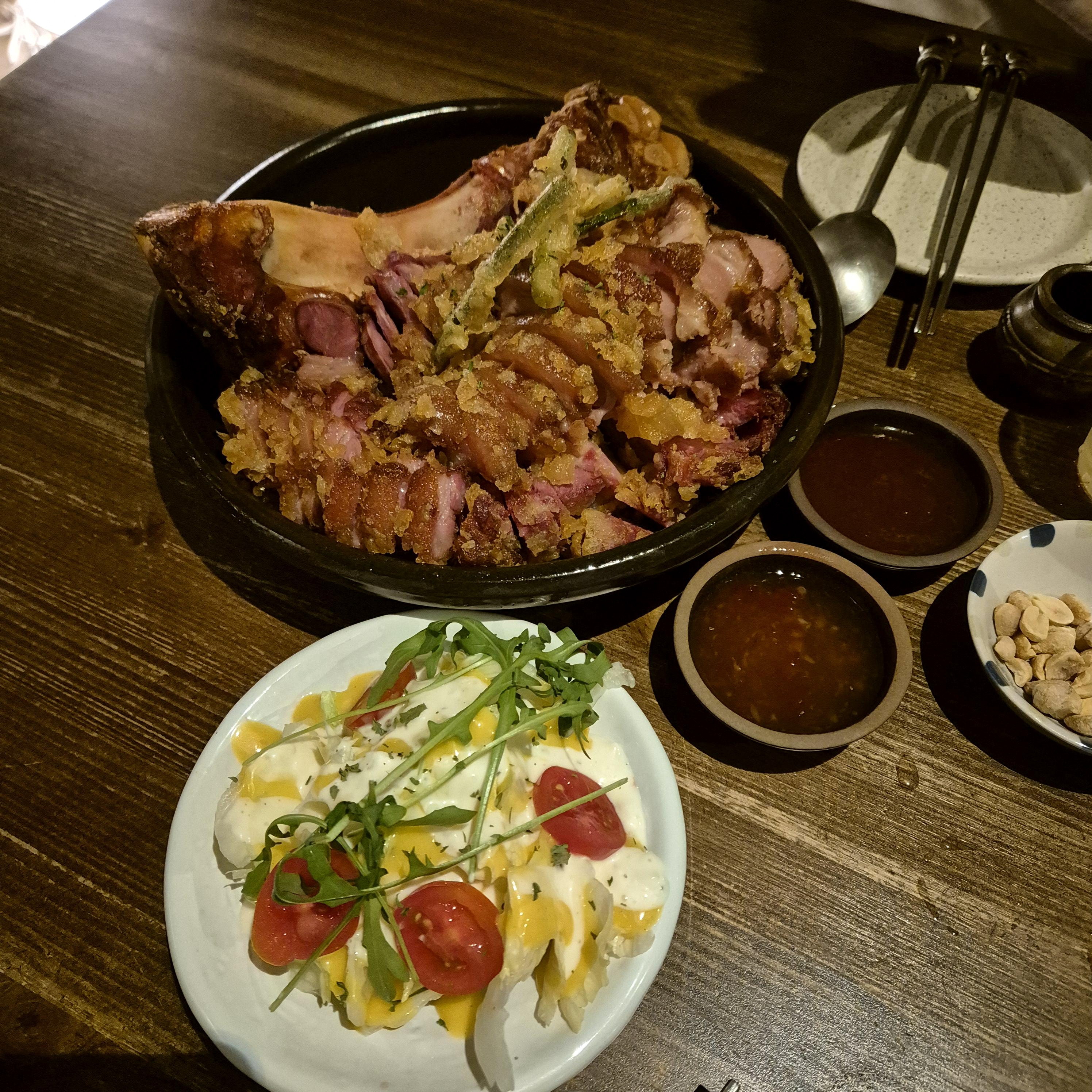 비주얼은 꽤나 좋았다. 그리고 가격이 27,000원이었는데, 족발의 가격치고는 양에 비해 상당히 착한 가격이라고 생각했다. 튀김옷을 입은 족발이라고 생각하면 될 것 같은데, 생각보단 느끼하지 않았다. 족발의 콜라겐과 튀김이 만나서 정말 엄청 느끼할 줄 알았는데 그 정도는 아니었다. 훈제족발이라 그런지 조금 더 쫄깃하고 밀도가 높은 식감이었다.