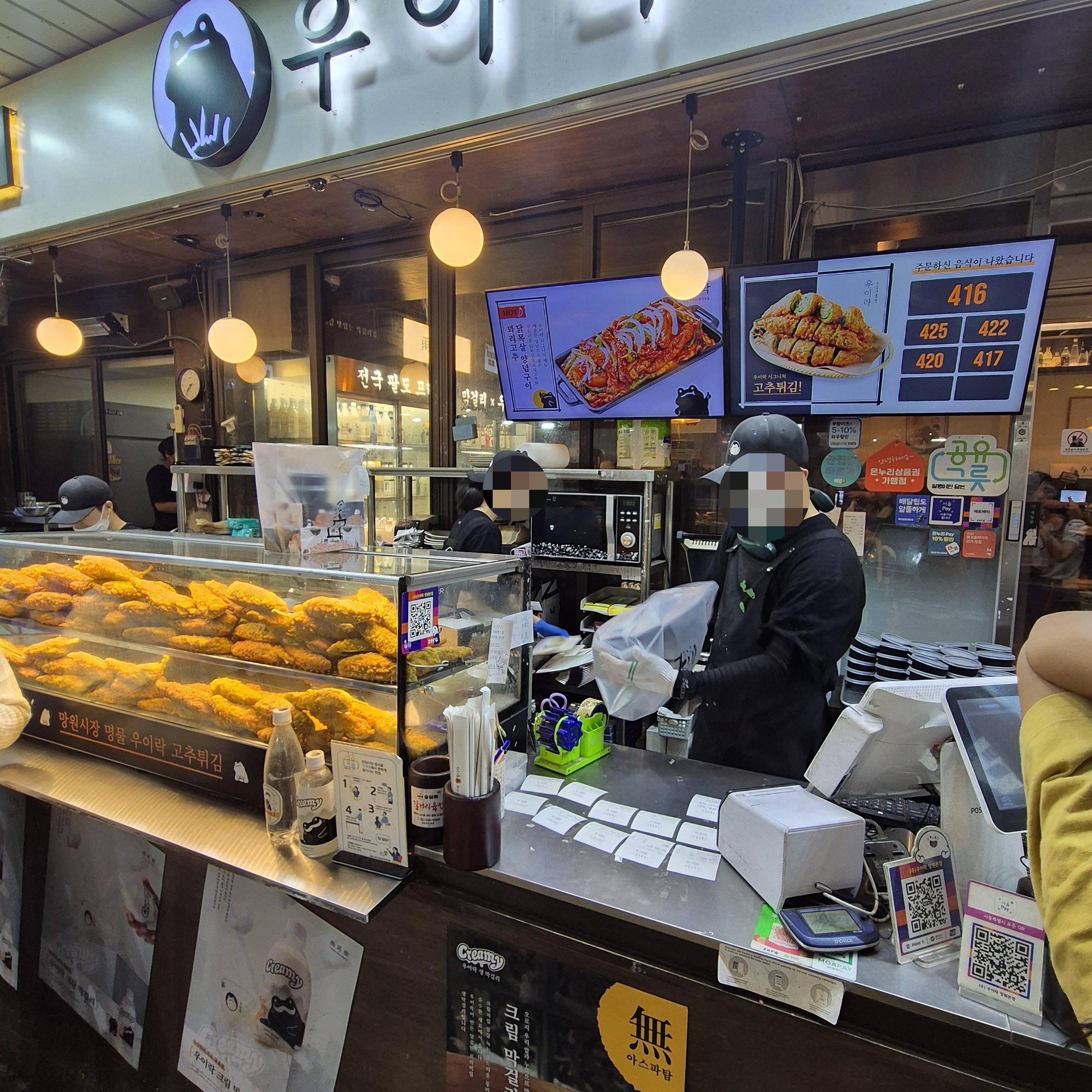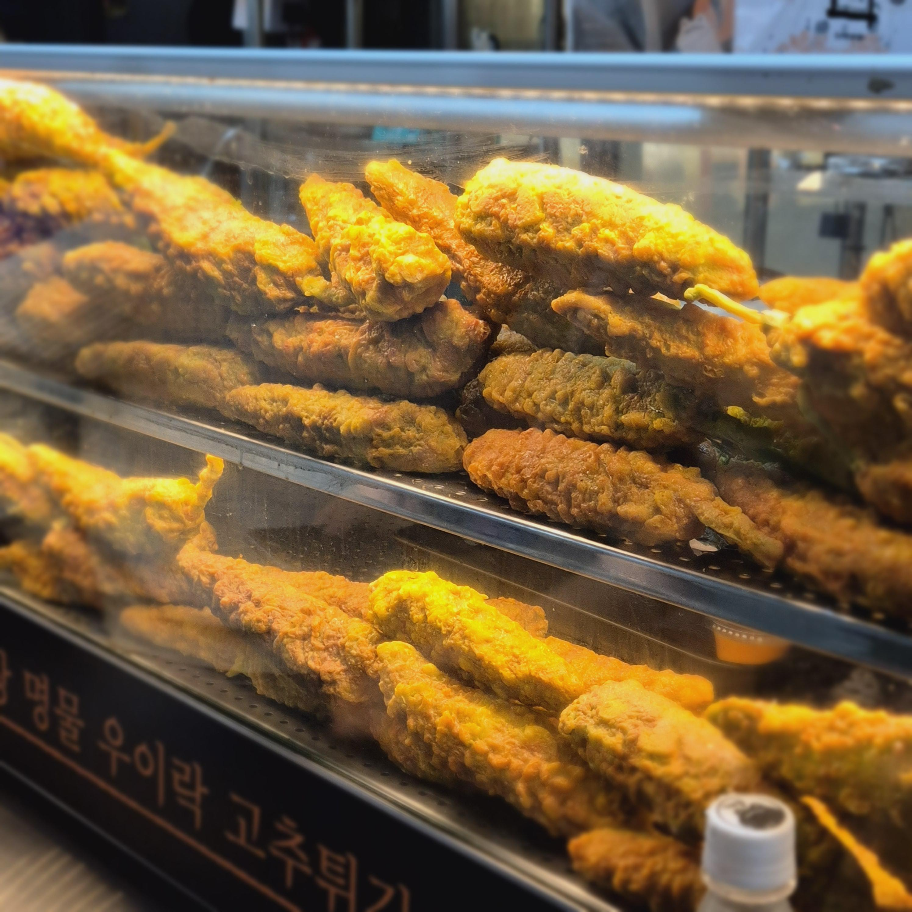 사실 우이락은 회사사람들이나 지인들을 통해 종종 들어보기는 했는데, 실제로 맞닥뜨리니 진짜 맛집을 온 기분이었다. 망원시장에서 쭉 들어오다보면, 사람이 몰려있는 곳이 있을텐데, 거기가 우이락이라고 생각하시면 된다. 무엇을 파는 곳인지 한번 두리번거렸는데, 커다란 뭔가가 마치 수족관에 나열된듯하게 있었다. 가까이서보니 고추튀김이었다.