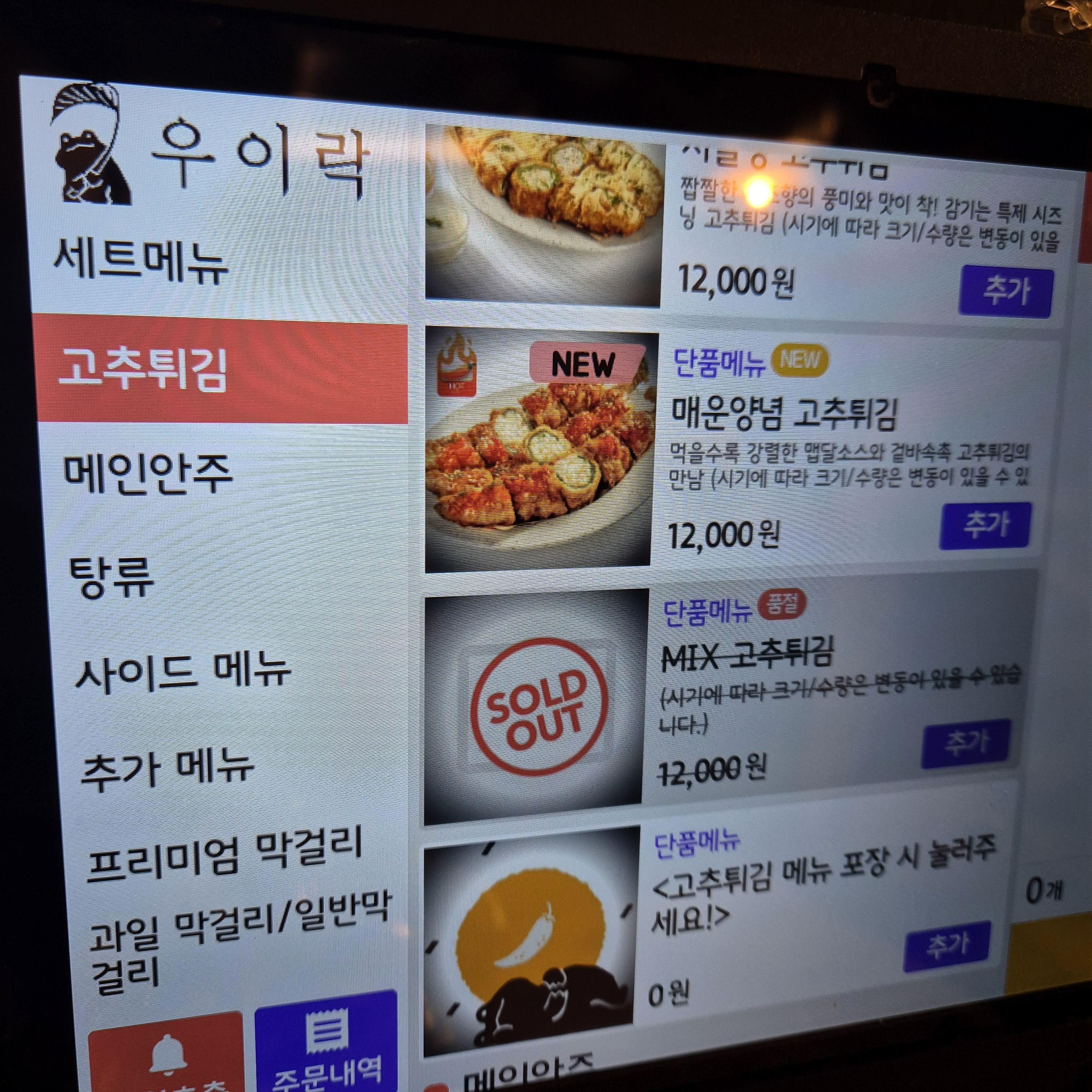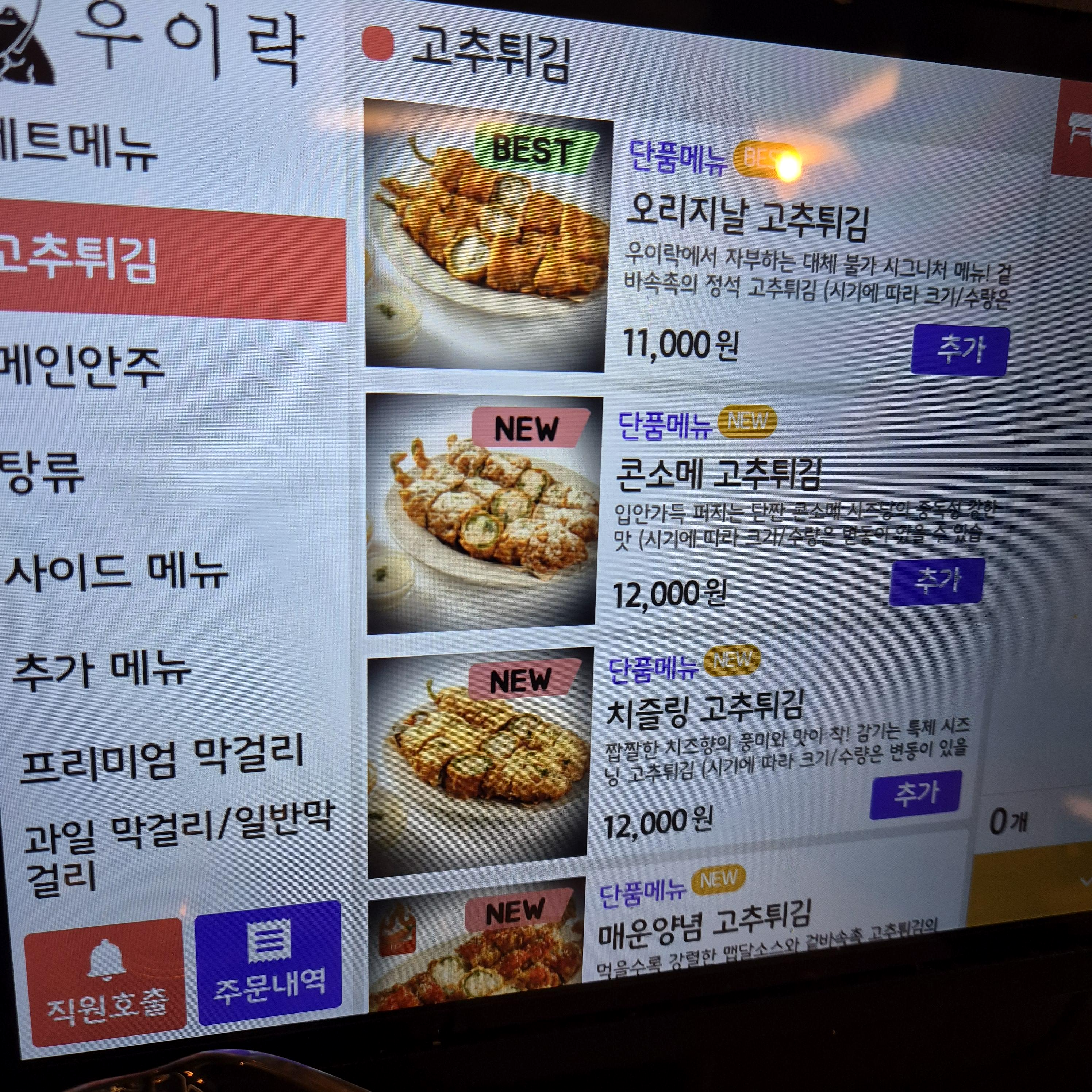 우이락은 키오스크로 메뉴를 주문하면 되는데, 내가 생각했던 것보다 메뉴가 정말 많았다. 사실 고추튀김에 특화되어 다른 메뉴가 별로 없을 줄 알았는데, 나만의 착각이었다. 고추튀김은 말할 것도 없고, 술찜, 치킨, 구이, 탕까지 메뉴가 정말 다양했고, 세트메뉴도 있었다. 하지만, 우리는 홍두깨칼국수의 면을 배 가득 채우고 온 상태라 기본을 먹어보기로 했다. 그래서 오리지날 고추튀김 하나를 시켰다. 그리고 달달한 게 당겨서 꿀막걸리를 하나 시켜봤다. 메뉴를 정하고 주문한 뒤 얼마 지나지 않아서 우리 메뉴가 금방 나왔다.