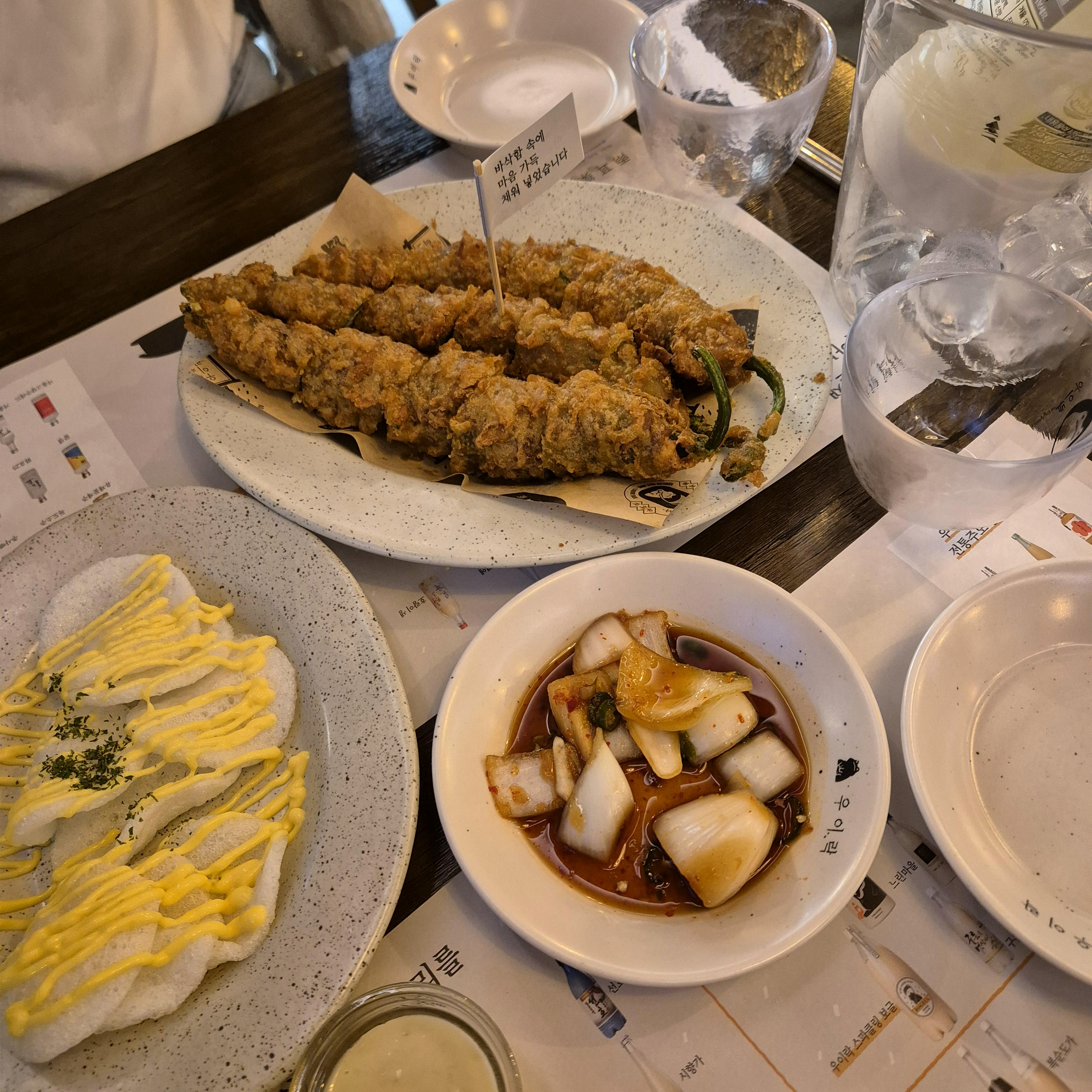 조금은 심심할 줄 알았던 오리지날은 생각과는 다르게 어느정도 간이 되어있어서 딱 좋았다. 사실 다른 콘소매나 치즐링 메뉴도 조금은 당기긴 했는데, 고추튀김의 크기가 크기인지라 배도 불렀고, 오리지날 만으로 충분히 만족스러웠다. 조금 맛을 더해 먹고 싶을 때는 소스를 찍거나, 양파를 얹어먹으면 더할 나위 없었다. 갓 튀긴 고추튀김과 함께 먹으려고 느린마을과 꿀막걸리를 먹었는데, 역시나 느린마을이 나았다.