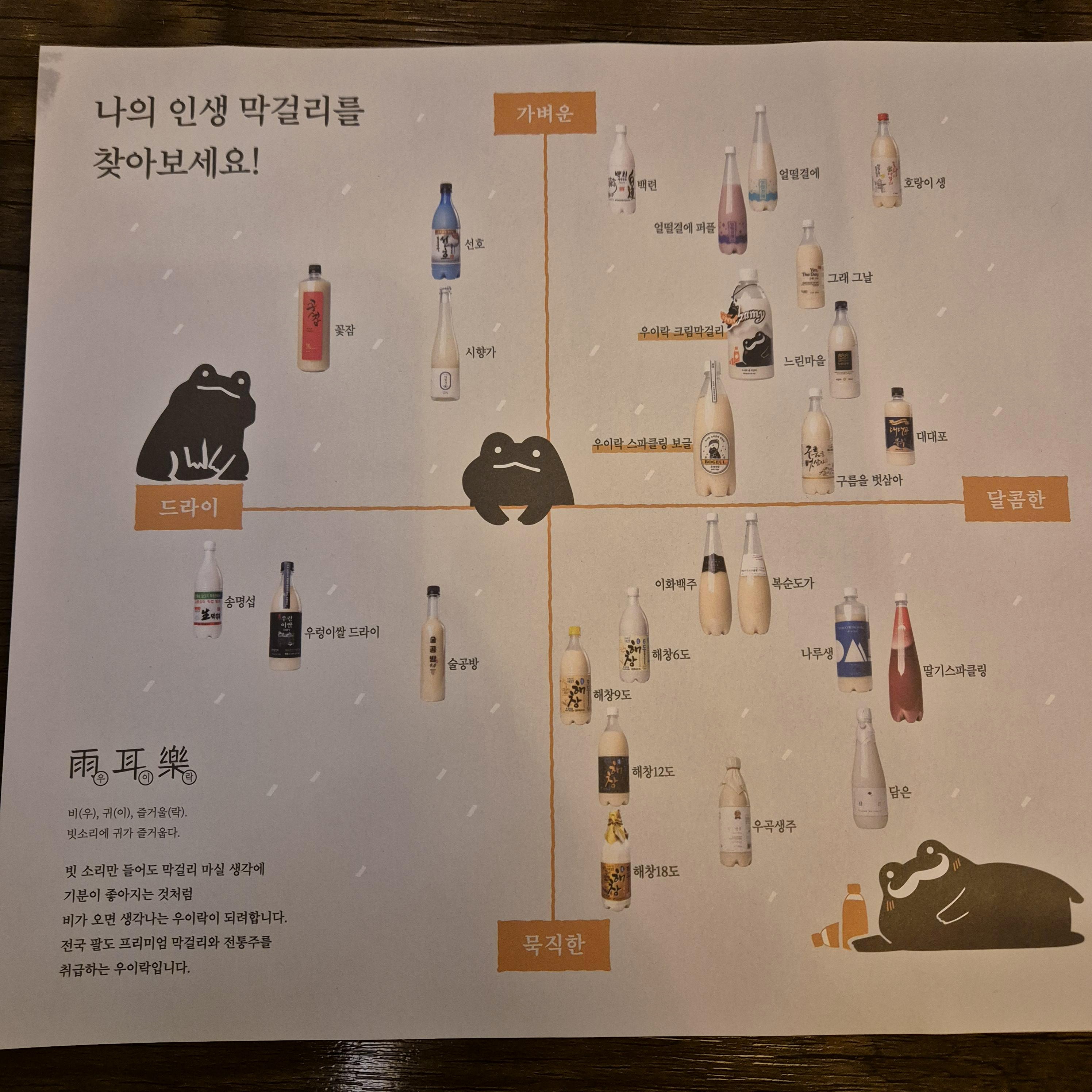 조금은 신기했던 '나의 인생막걸리 찾기 표'였다. 알아보기 쉽게 잘 정리해 주셔서 이건 두고두고 쓸만하겠다 싶었다. 필자는 가벼운 느낌보다는 살짝 무게감 있고 달달한 걸 좋아하는 편이다. 어떤 막걸리를 먹어야 할지 고민을 하며 메뉴를 골라보았다.