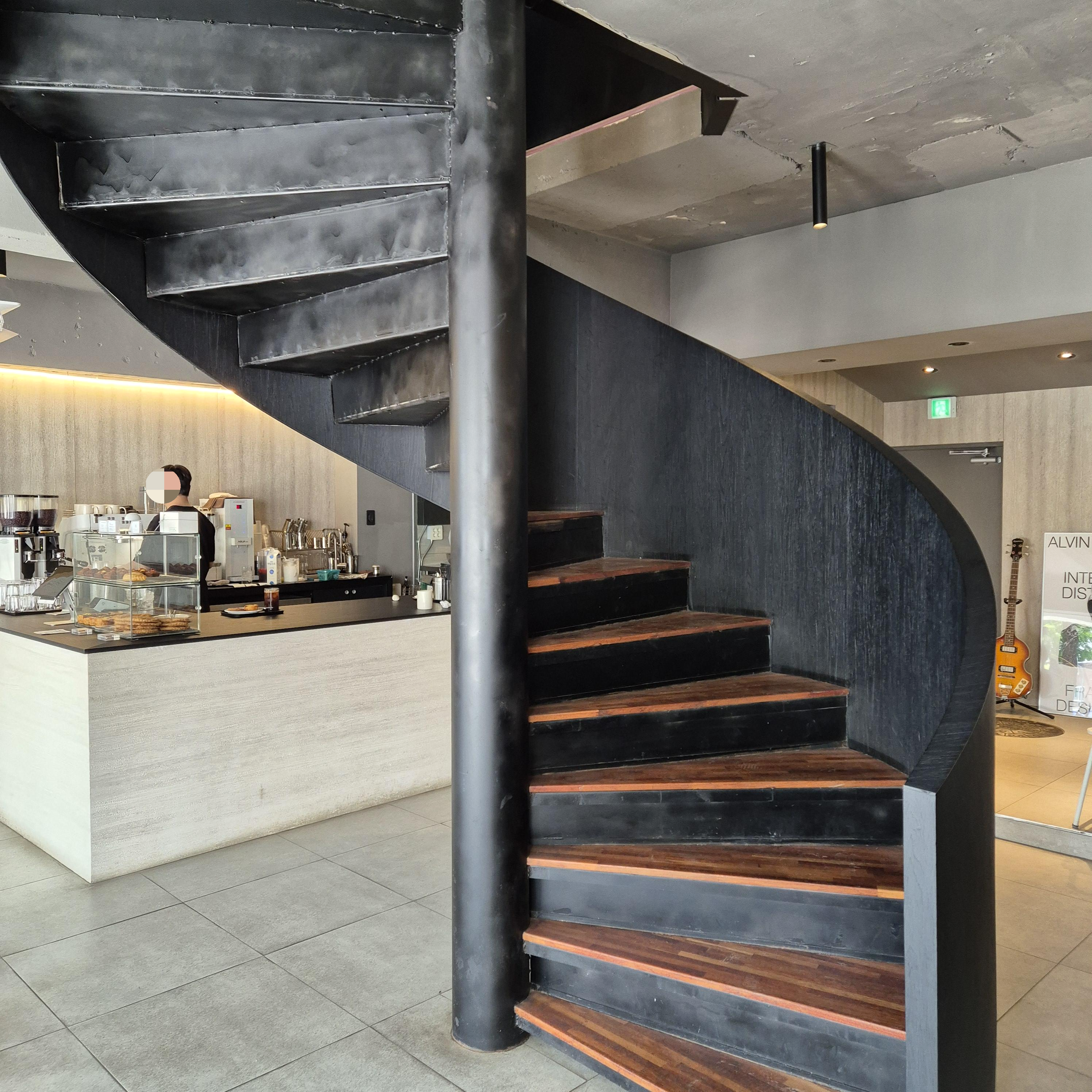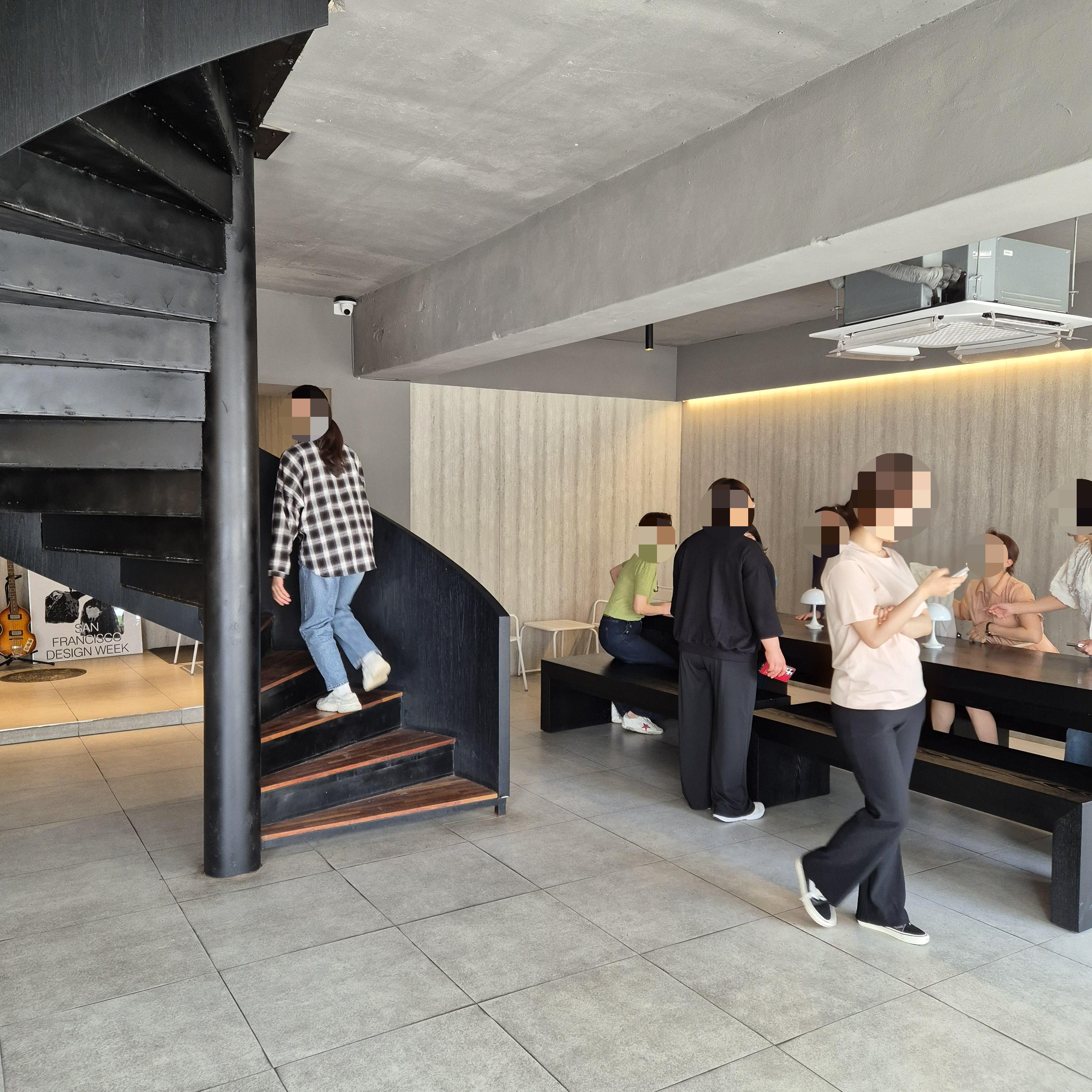 1층과 2층을 잇는 계단이 건물 밖에 있는 것이 아닌 프리롤카페는 특이하게도 가운데에 있다. 사실 보기에는 꽤나 근사해 보이는 것도 맞지만, 계단폭이 좁아서 올라갈 때 마냥 편하지는 않다. 하지만 이쁘고 멋있긴 하다. 프리롤 카페의 단점은 일단 진동벨이 없어서 언제 나의 메뉴가 나올지 알 수가 없다. 그래서 1층에서 항시대기 해야 한다. 무튼, 그렇게 우리의 메뉴도 나왔고, 시그니처 롤계단을 올라 2층으로 갔다.