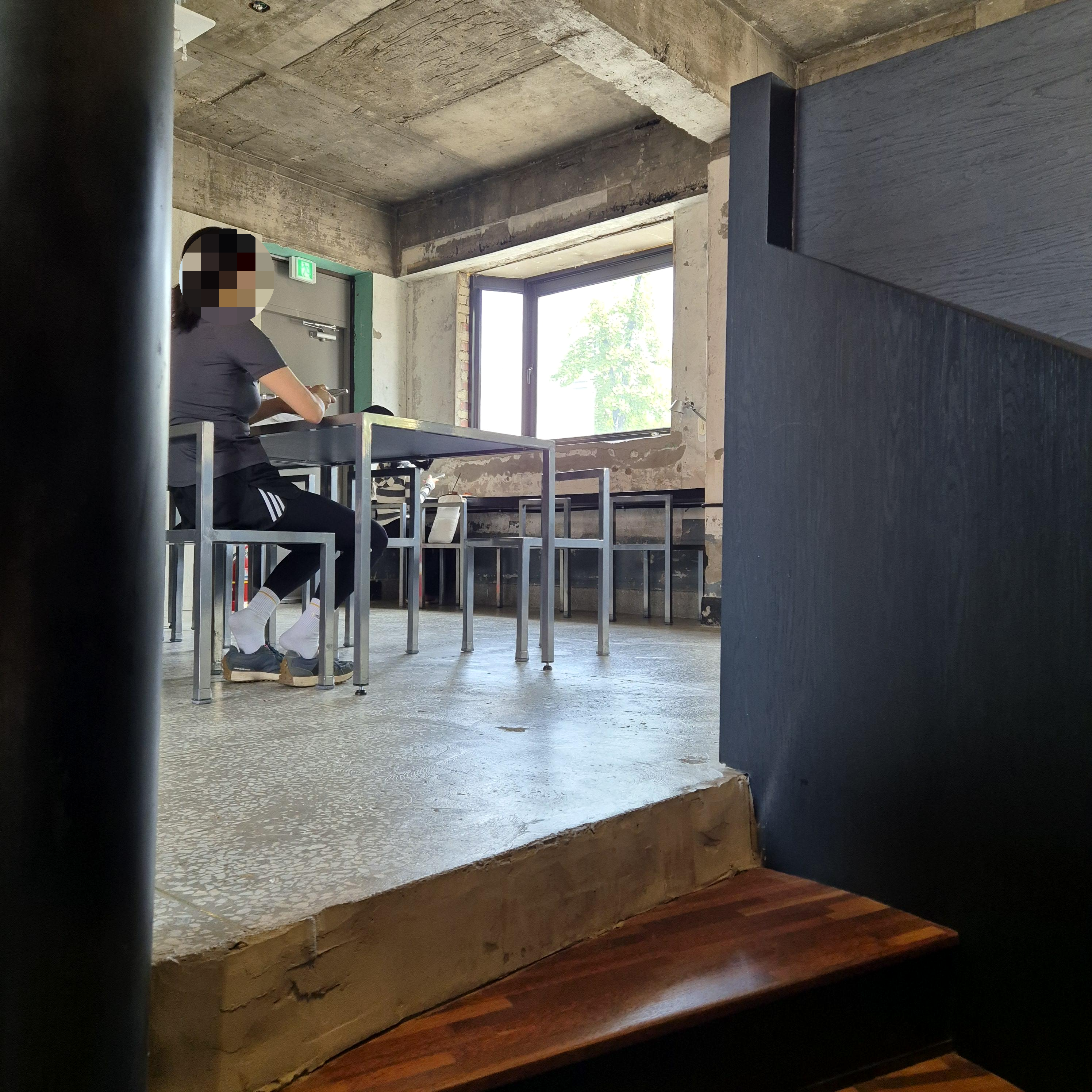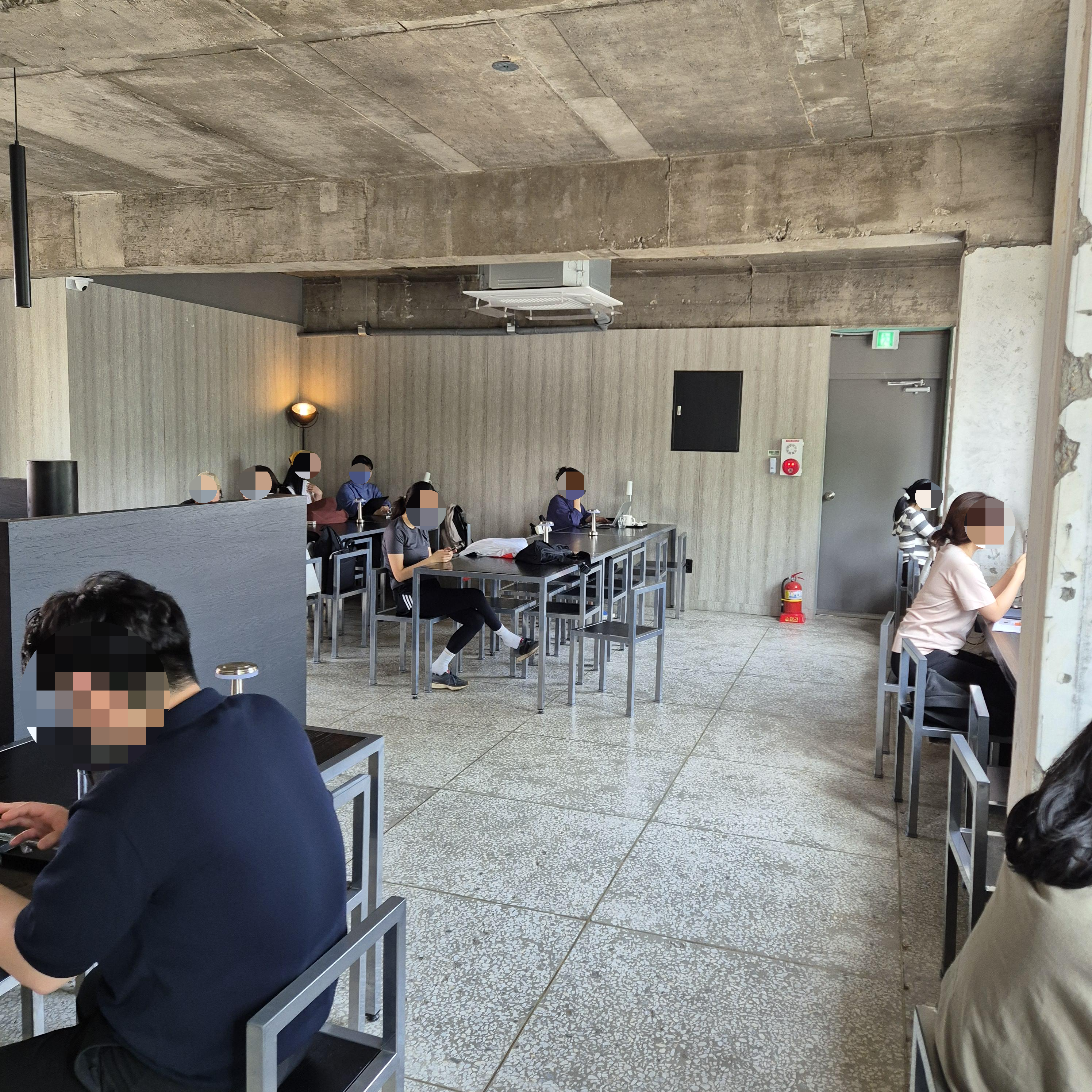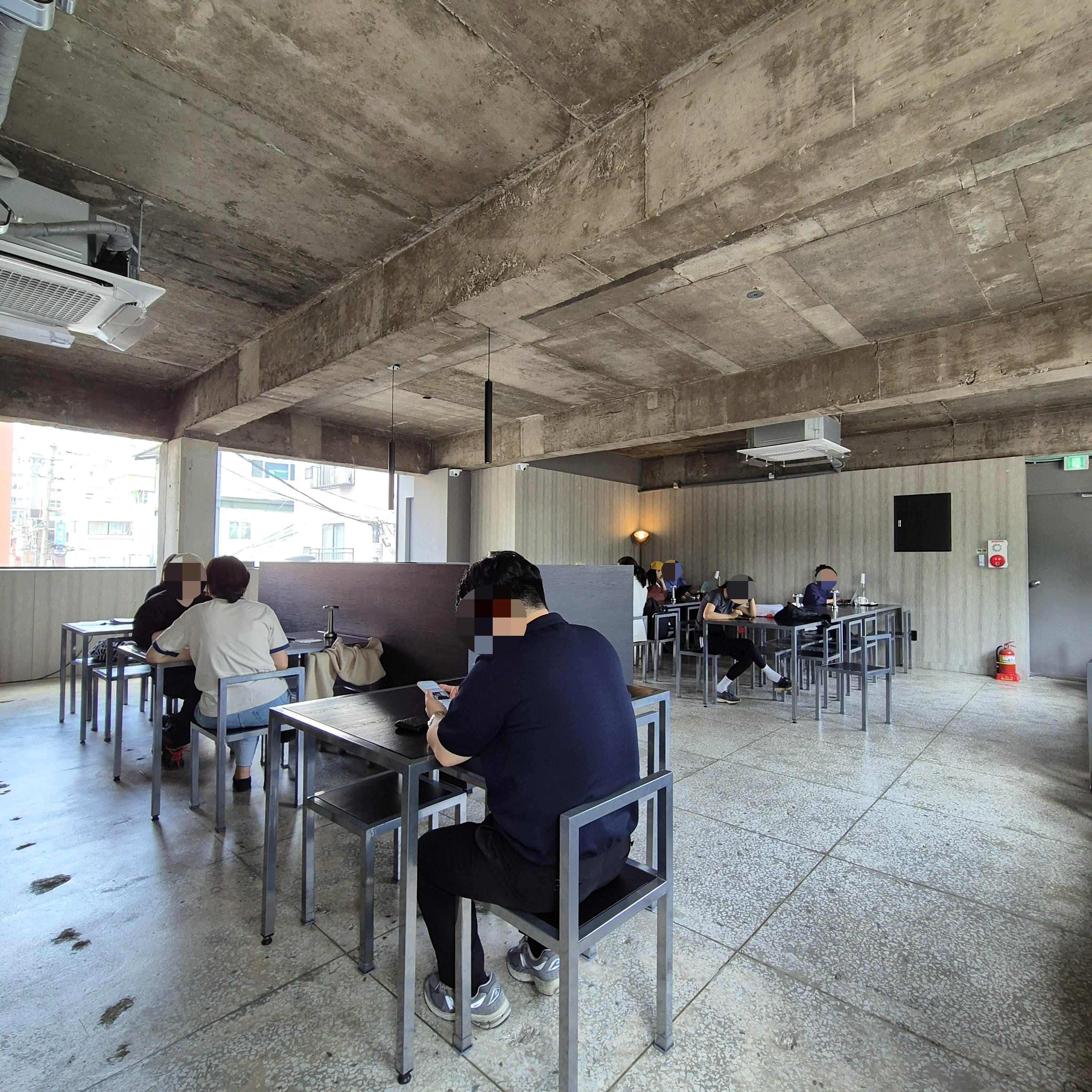2층에 올라가면 1층과는 또 다른 분위기가 펼쳐진다. 철제 의자와 책상, 그리고 전체적인 칼러감이 조화로우면서도, 1층도 마찬가지였지만, 좌석 간의 간격이 여유롭게 느껴져서 그런지 공간이 넓어 보였다. 토요일 오후였는데, 카페에서 공부하시는 분들이 생각보다 많이 보여서 약간의 자극을 받았다.