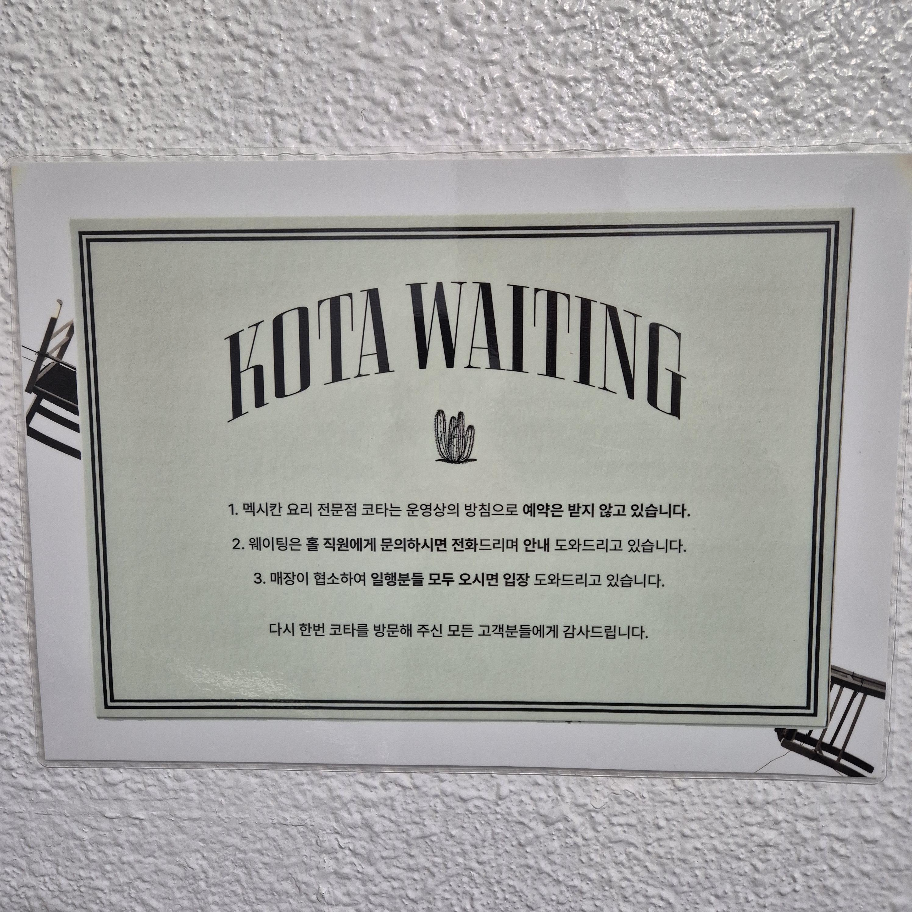 2층으로 올라오면, 코타웨이팅이라는 문구와 함께 입구가 있는데, 우리가 올라갈 당시에 이미 줄을 서서 기다리시는 분들이 있었다. 차근차근 읽어보니 코타에서는 예약은 안 받음, 웨이팅은 직원에게 말해야 함, 모든 일행이 와야 함 이 3가지 원칙을 가지고 운영하셨다. 그래서 필자 또한 내부로 들어가 직원분께 말씀드렸다. 근데, 필자가 말하고 오니, 갑자기 기다리시던 커플이 "말 안 했다.."라고 말하며 서둘러 직원분께 말하러 갔다가 그냥 발길을 돌리셨다. 결국, 우리가 먼저 들어오게 되었다. 뜻밖에 럭키비키랄까.