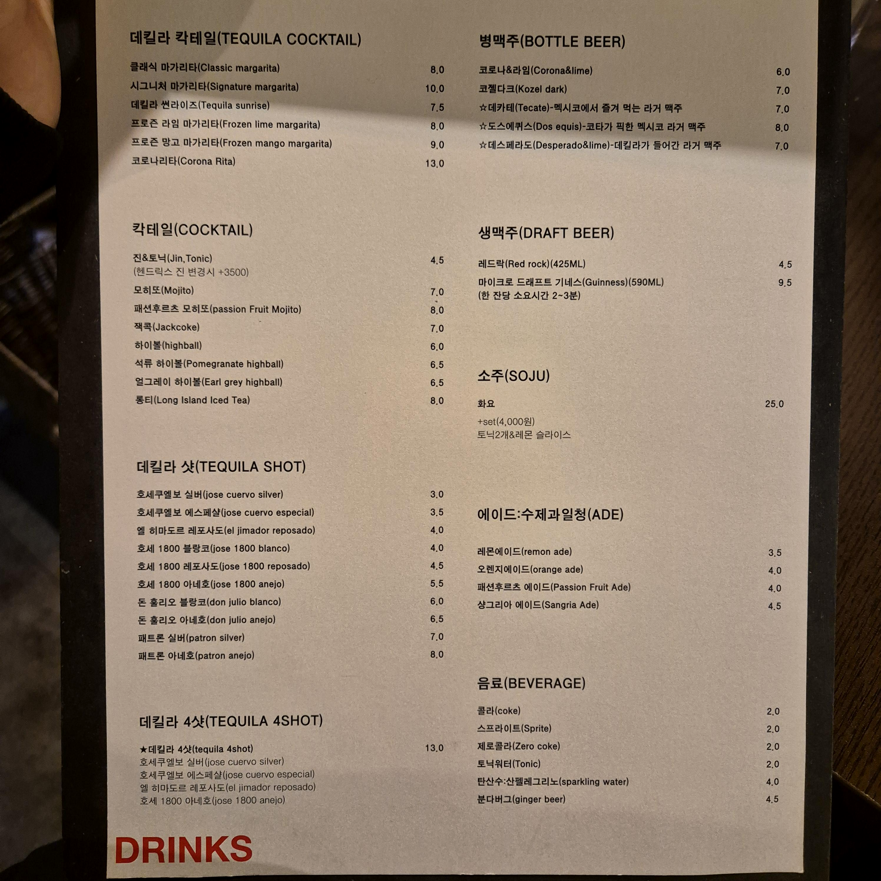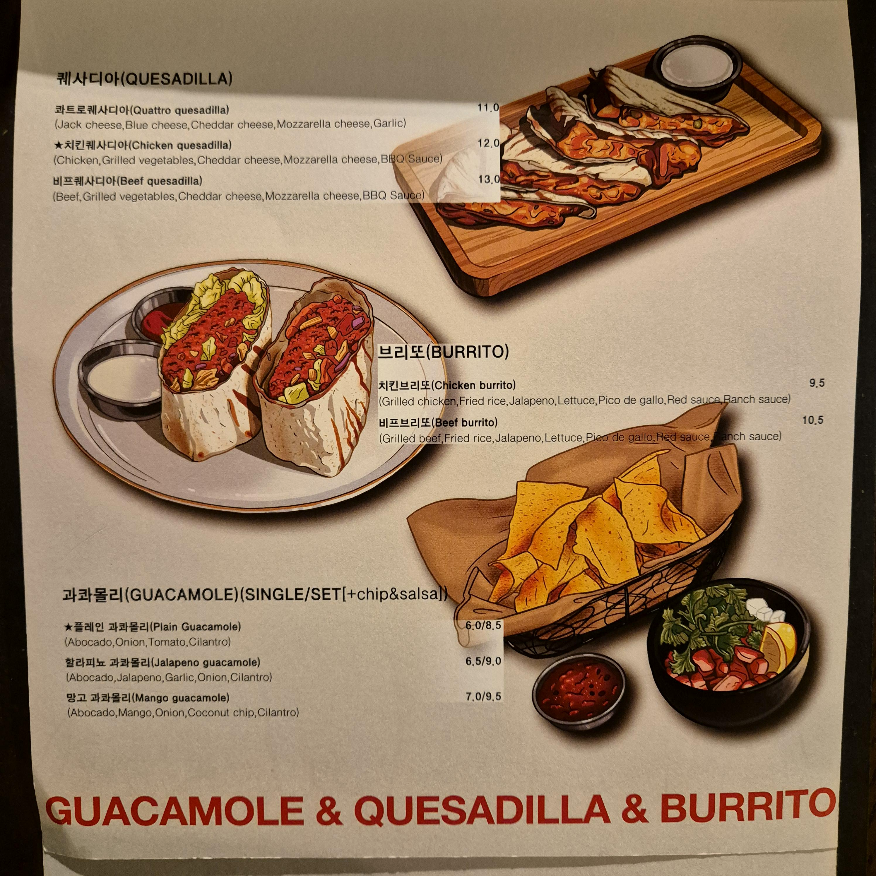 메뉴판에 그려져 있는 그림이 너무 맛깔스럽게 잘 그려져 있어서, 퀘사디아도 먹어보고 싶었지만, 우리 일행은 성인 2명으로 코타시그니처화이타를 시켰다. 맥주도 조금 끌렸지만 제로콜라를 마시기로 했다.비록 창가 자리는 아니었지만, 큰 창 밖으로 주적주적 내리는 비가 너무 좋았다. 우리 일행도 이런저런 이야기를 하며 기다리고 있었다.