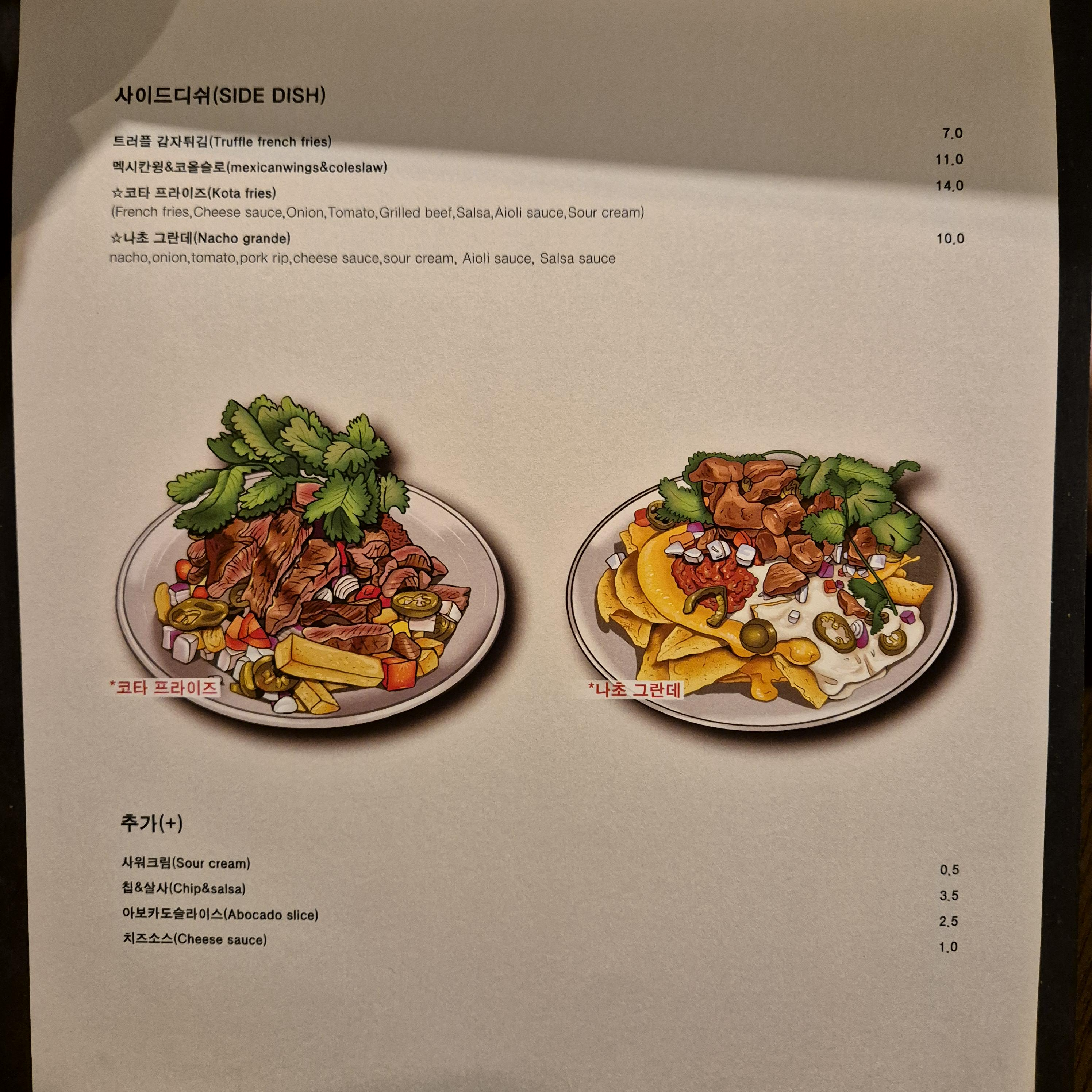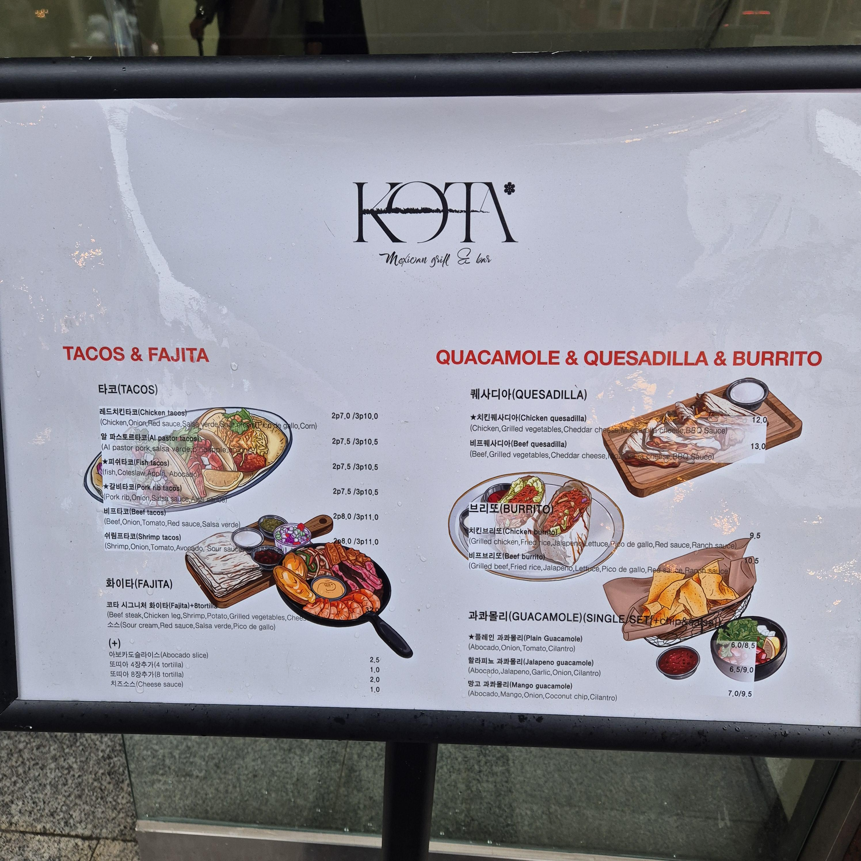 선인장 이미지가 눈에 들어오는 KOTA라는 간판과 함께 올라가지 않아도 어떤걸 파는지 알려주는 메뉴판이 있다. 개인적으로는 메뉴판에 그림이 있는게 정말 너무 좋다고 생각한다.
