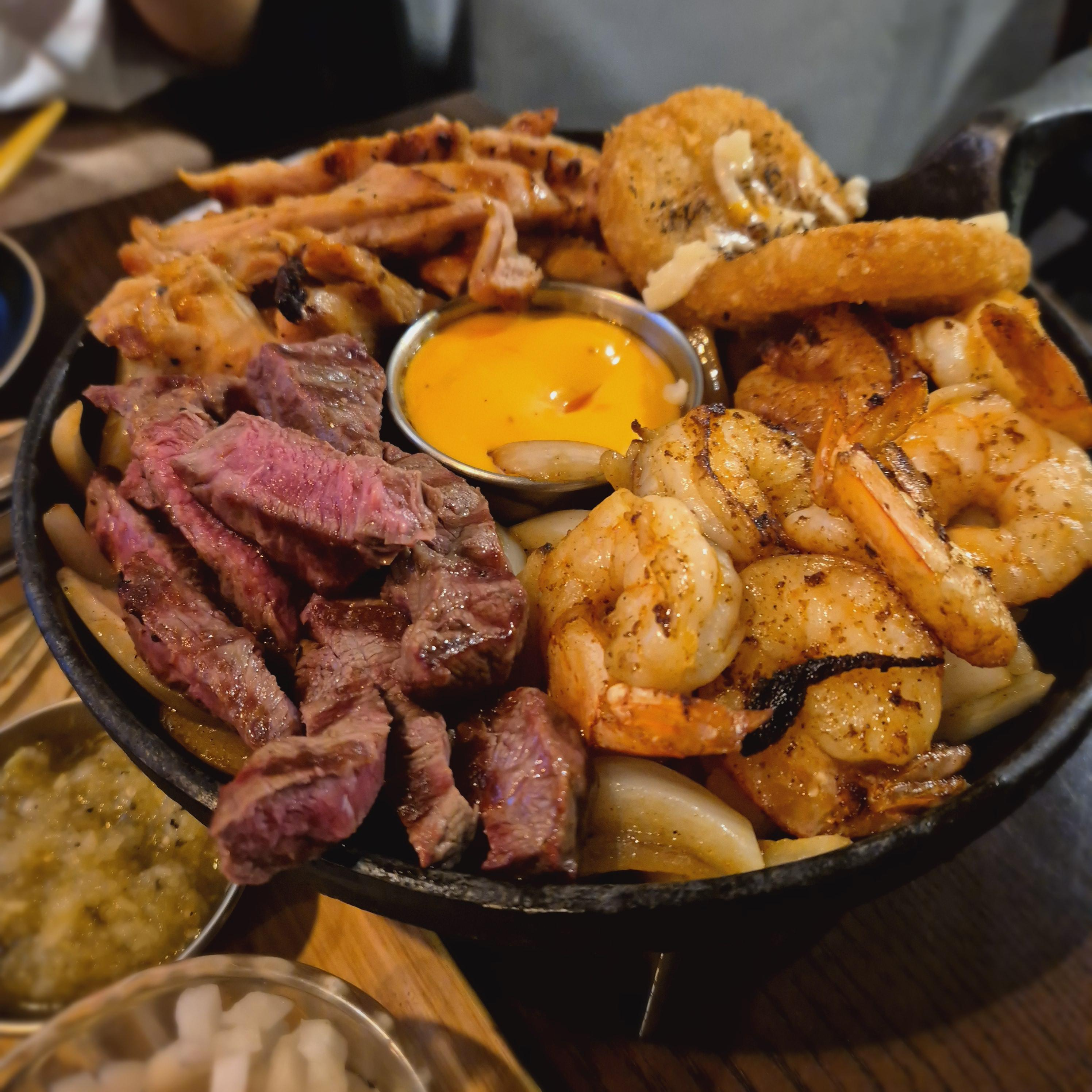 화이타가 무슨 의미인지 모르겠지만 비주얼도 끝장났다. 그을린 듯 불맛이 날 것 같은 새우와 눈으로만 봐도 부드러우면서 촉촉할 것 같은 미디엄 약레어로 구워진 소고기, 그리고 탱글탱글하고 먹기 쉽게 나온 닭고기까지 알차고 푸짐하게 등장한 화이타였다. 무엇을 싸 먹어도 맛있을 수밖에 없는 조합이었다.