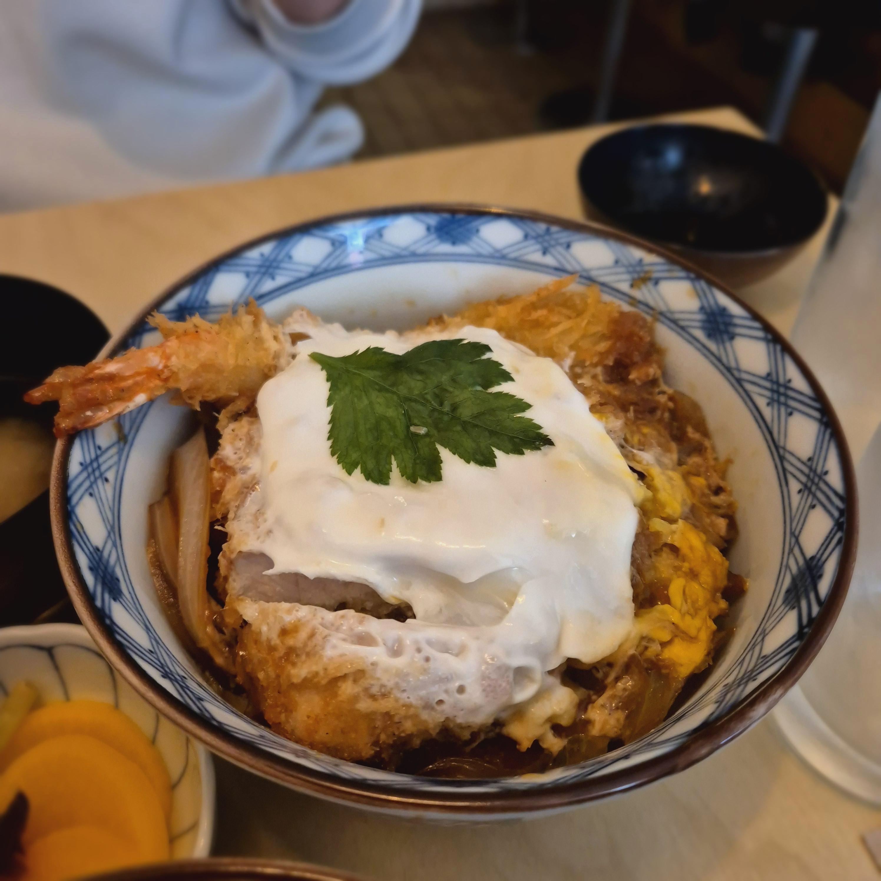 먼저 지인의 메뉴인 믹스카츠동이었다. 큼지막한 새우튀김 한 마리가 꼬리를 그릇밖으로 내보내며 유혹하는 비주얼이다. 믹스카츠동은 숙성 등심(로스)과 새우(에비)가 한 마리 들어간 덮밥였는데, 지인의 등심과 필자의 히레를 하나씩 교환하여 먹어보았다. 두툼하고 겹겹이 쌓인 고기층에 은은히 베여있는 육즙이 좋았다.