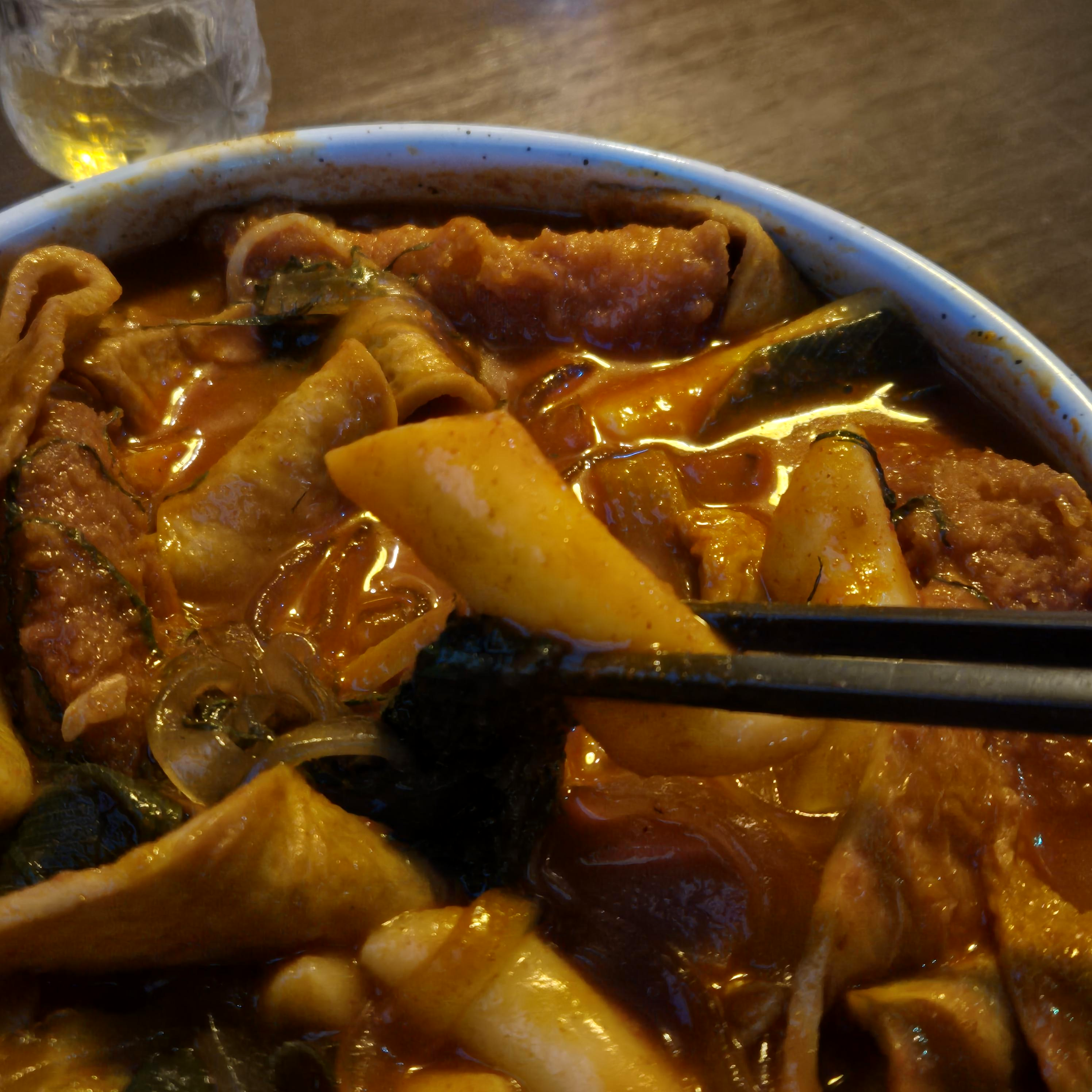 매실원주를 기울이며, 음식에 매료되어 있었던 우리는 한 병을 더 시켰고, 한병 더 시킨 김에 안주도 하나를 더 먹기로 했다. 사실 수비드 항정살 만으로도 많이 부족하진 않았지만, 우야재의 음식솜씨에 다른 메뉴도 먹어보고 싶었다. 그래서 사람들이 많이 찾는 통살새우 떡볶이를 시켜보았다.