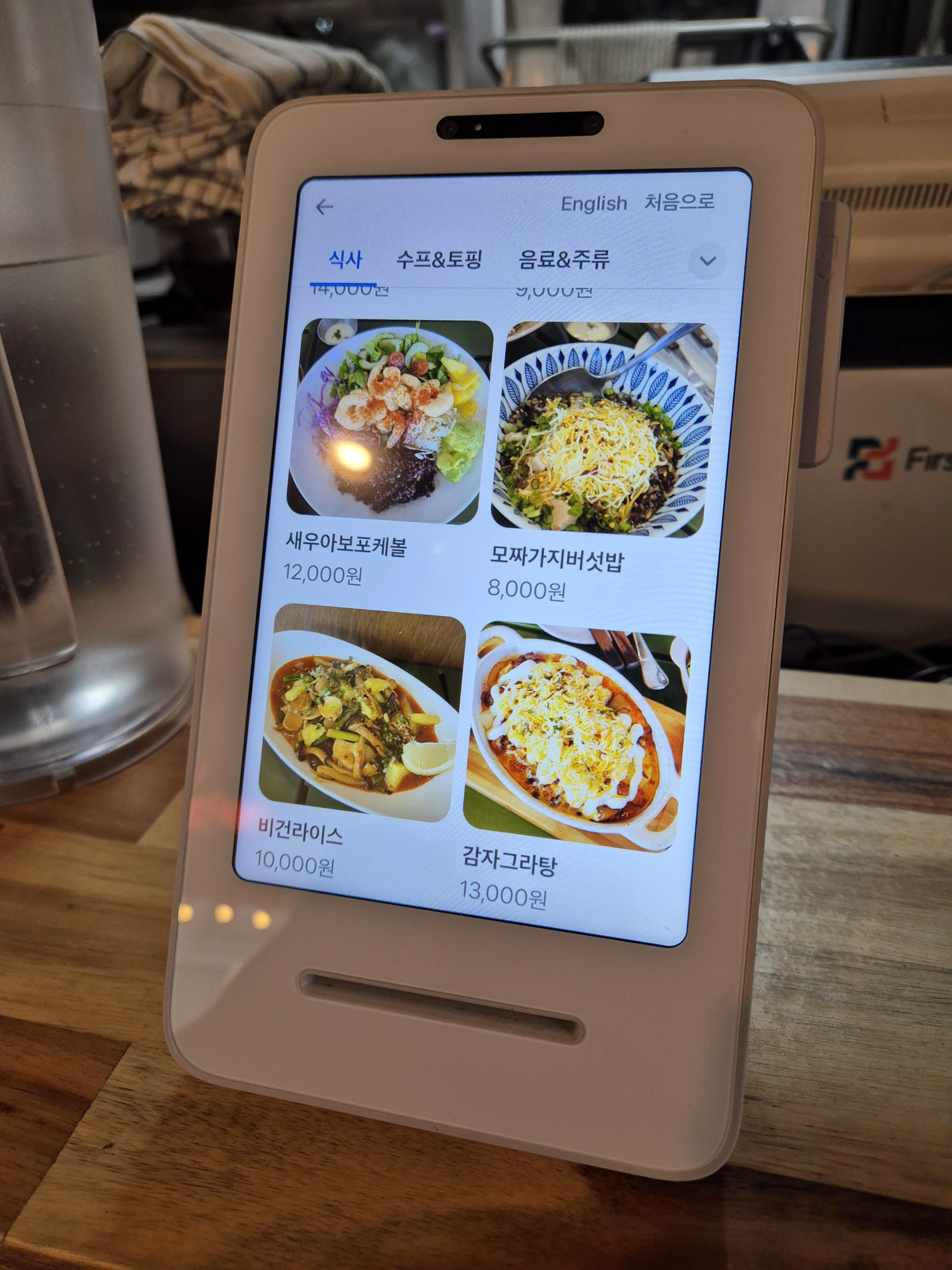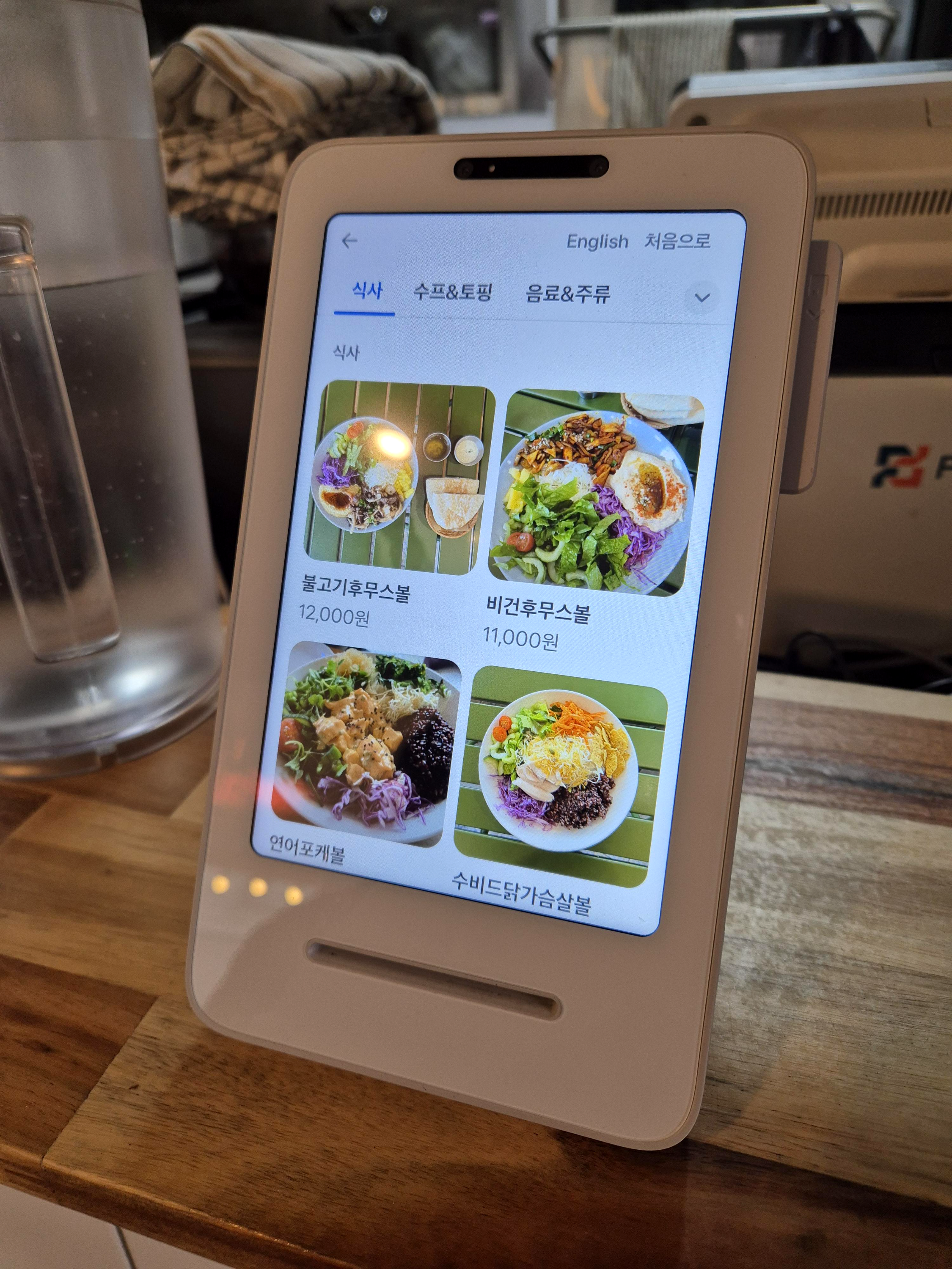 메뉴판도 주셨지만, 키오스크로 주문해도 문제없다. 키오스크에서 각 메뉴의 실체를 볼 수가 있어서 이름을 확인하더라도 키오스크로 한번 보는 것을 추천드린다. 우리 일행은 다 맛있어 보였지만, 모짜가지버섯밥, 수비드닭가슴살볼, 단호박수프 이렇게 3가지 메뉴를 주문했다. 주문 후 밖에 자리를 잡았다.