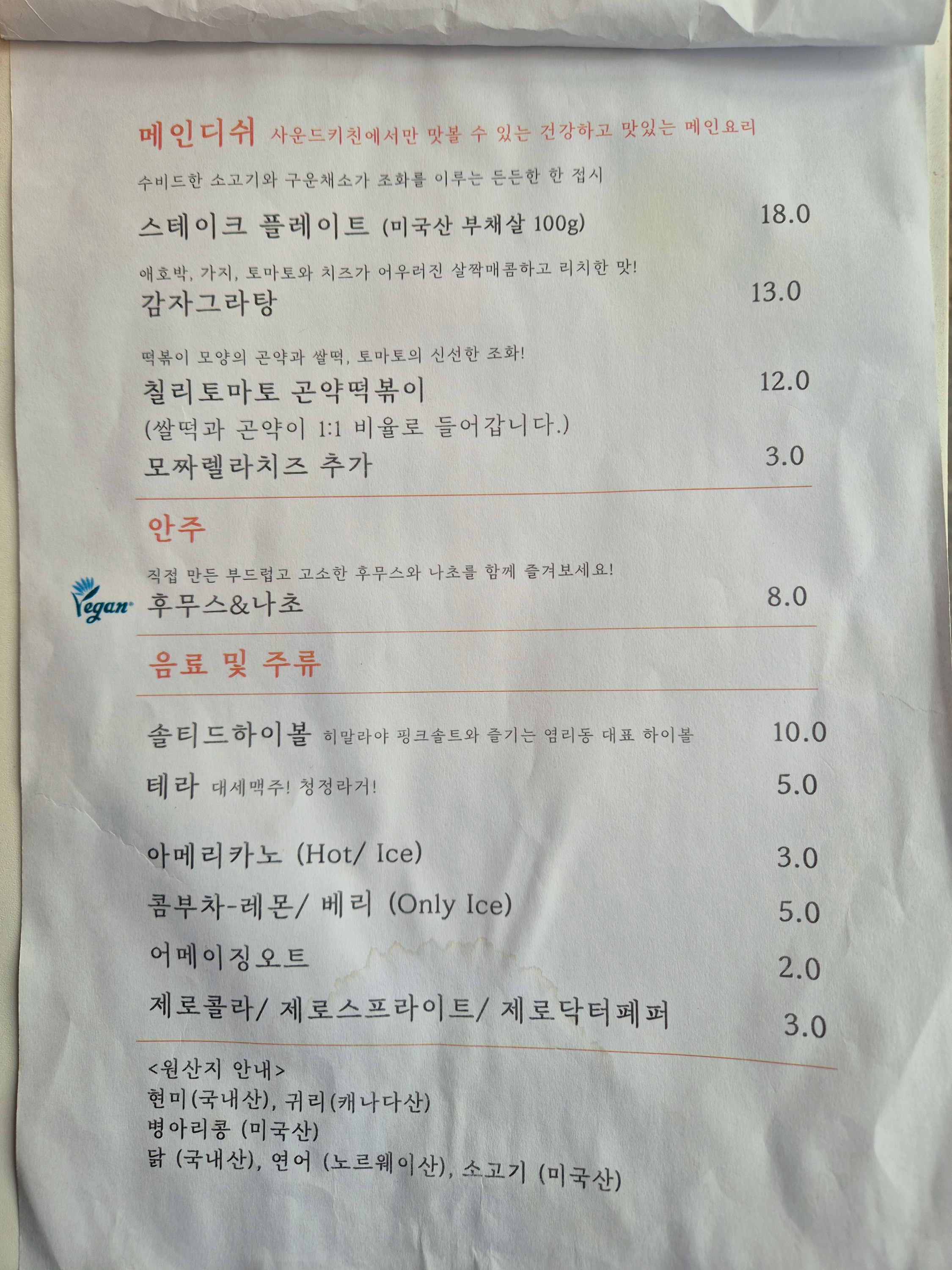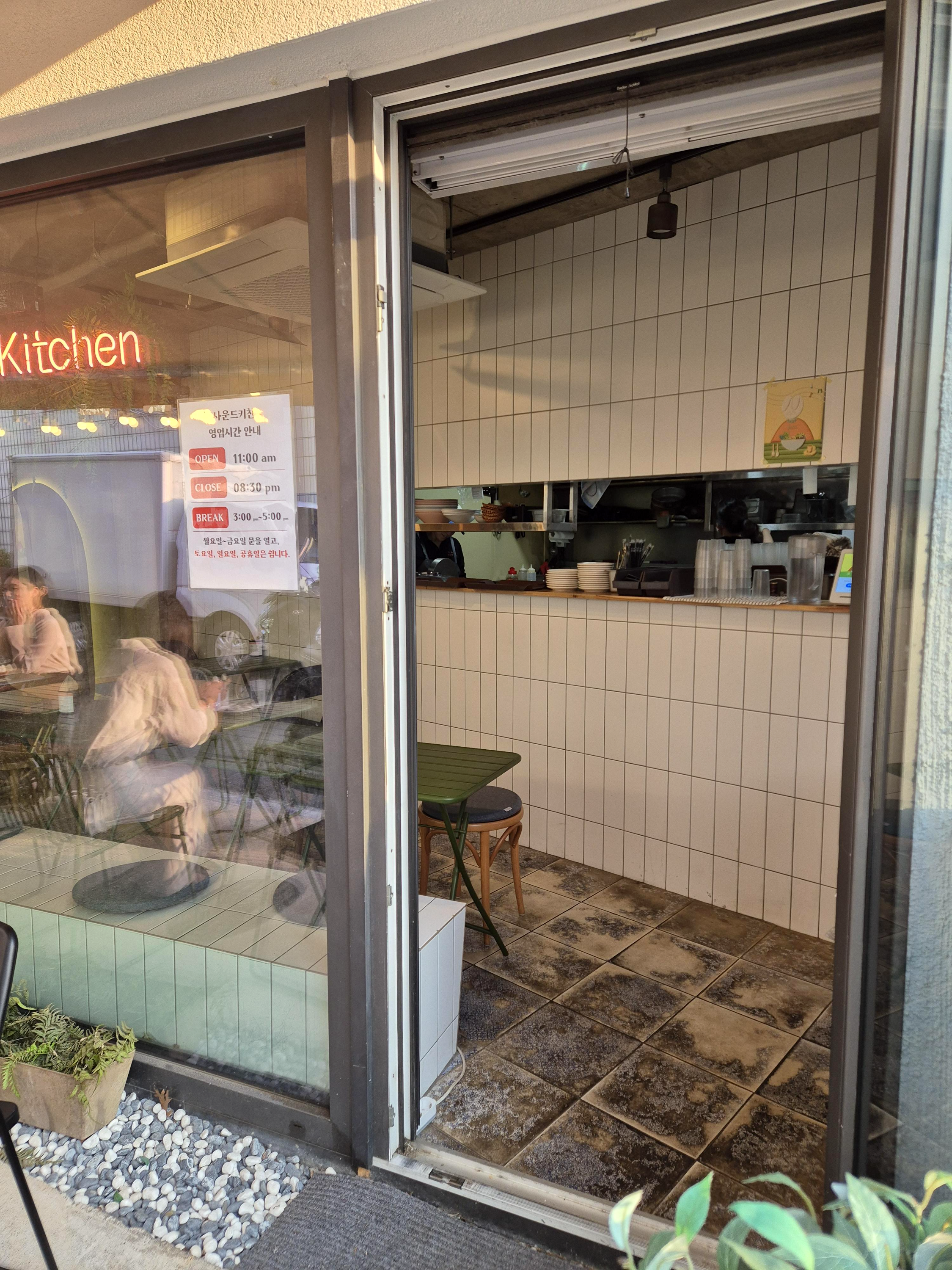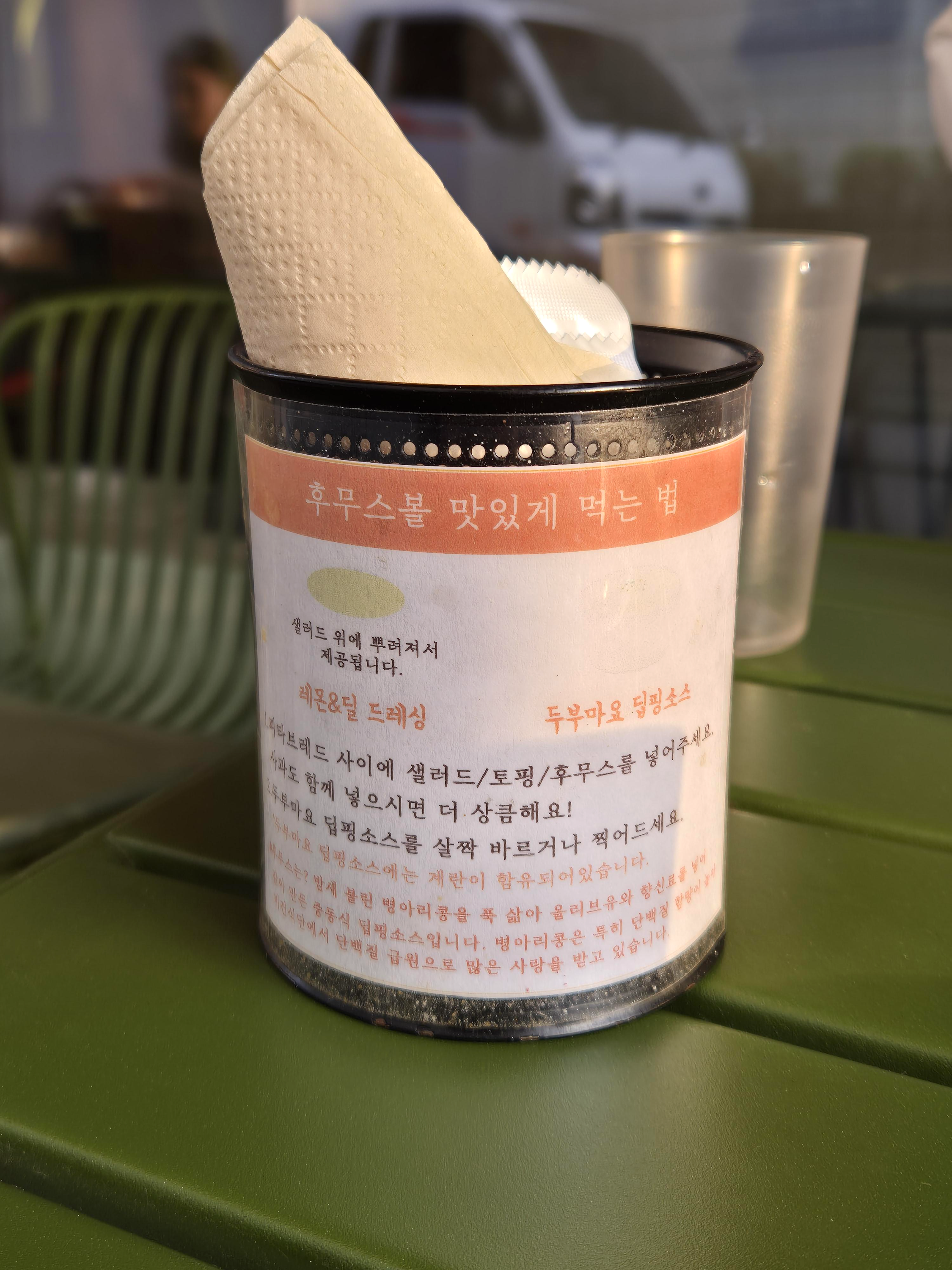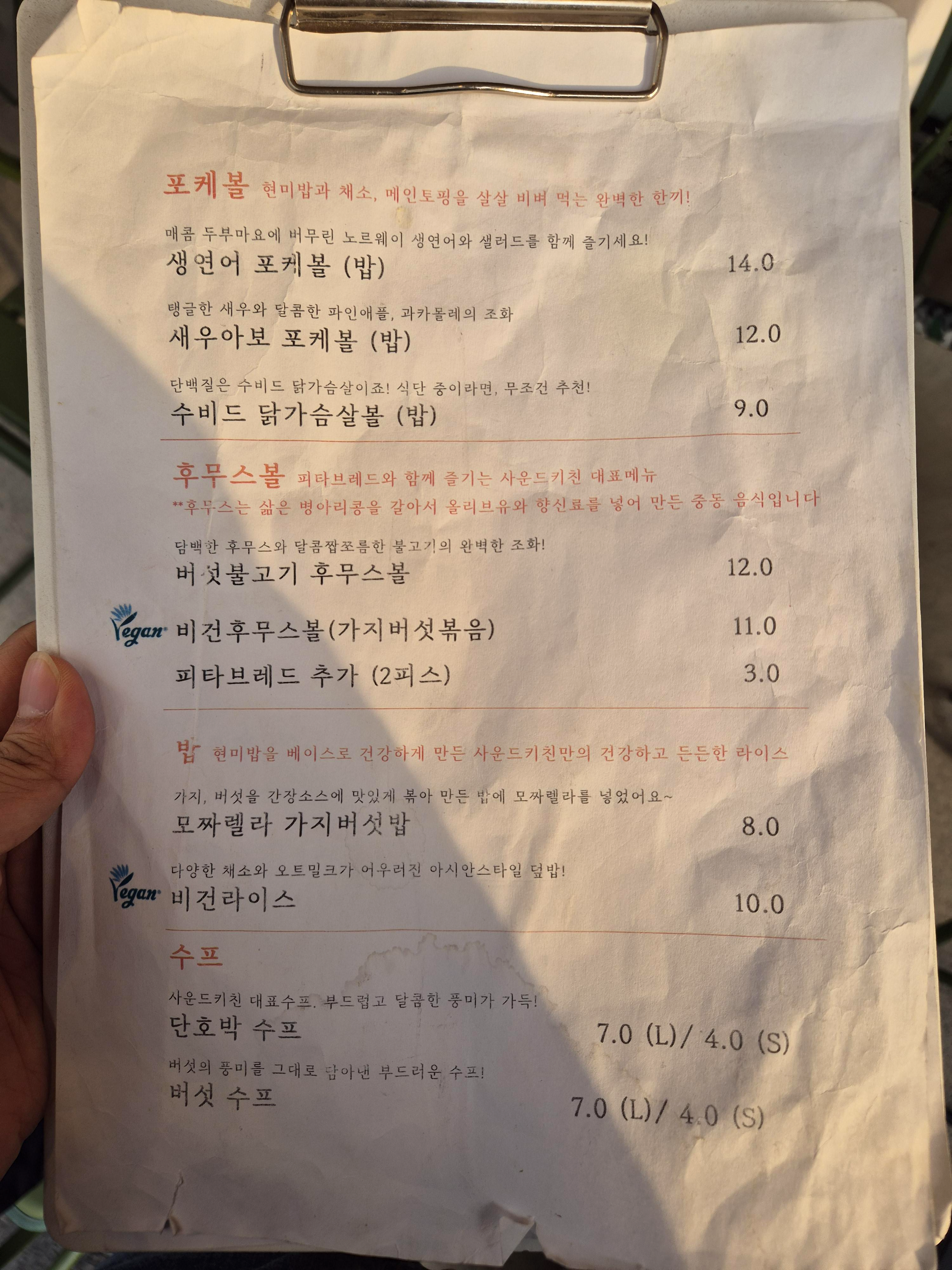 후무스볼 맛있게 먹는 법도 한번 읽어보고, 기가 막힌 해지는 하늘을 바라보면서, 도란도란 이야기를 나누었다. 이렇게 아주 덥지 않은 선선한 날씨도 그리 오래 남지 않은 듯싶었다. 기다리는 와중에 손님이 직접 오기보다는 배달기사님들이 많이 오셨다. 주변에 거주하시는 분들도 사운드키친의 건강한 맛을 아시나 보다. 얼마 지나지 않아 우리의 메뉴가 나왔다.