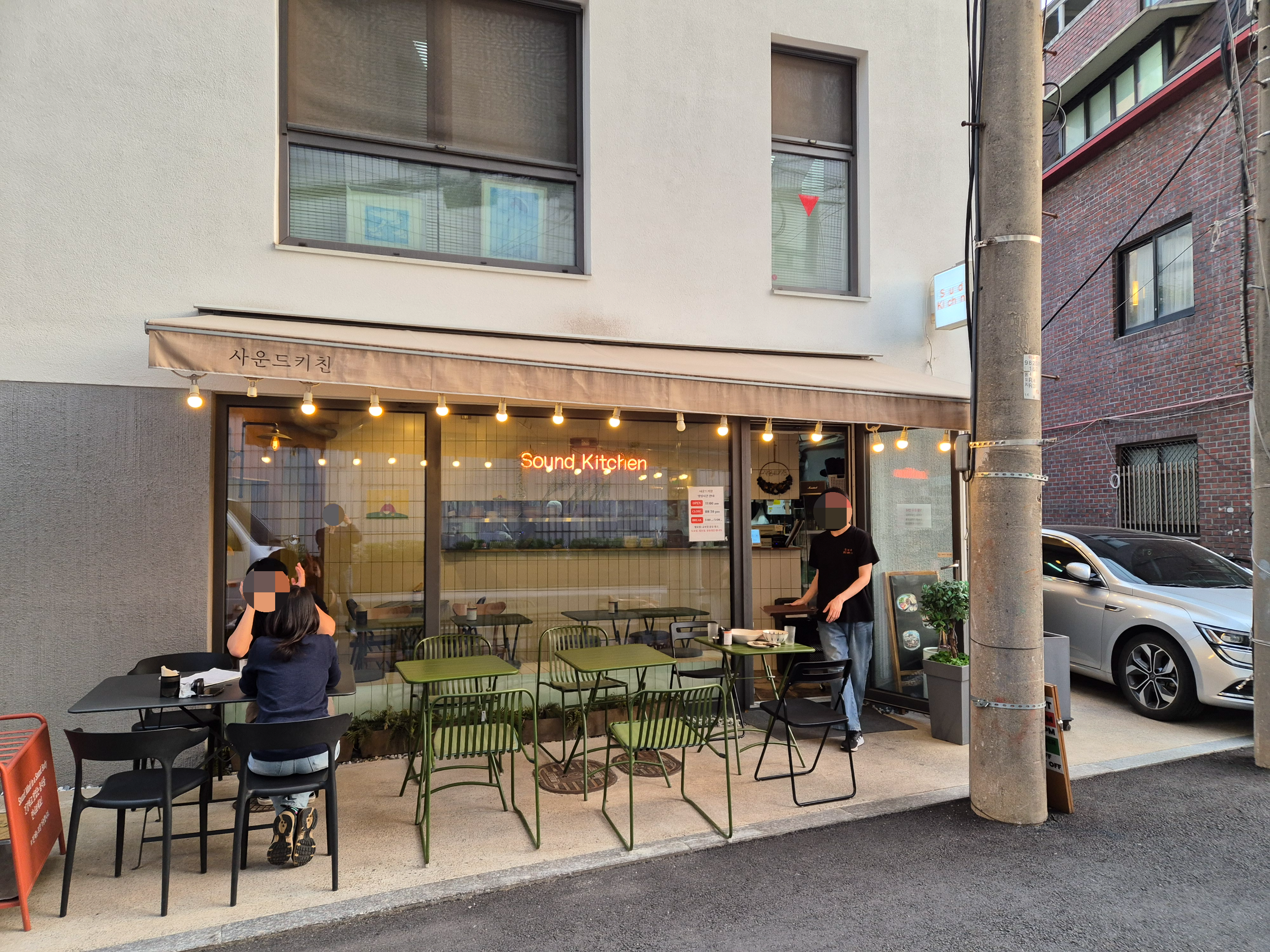 우리는 대흥역에서 만나 가게까지 맑은 하늘을 바라보며 힐링하면서 걸었다. 아이보리 무채색 건물 1층에 위치한 사운드키친의 테라스가 특히 눈에 들어왔는데, 꾸민 듯 안 꾸민듯한 테라스의 모습이 한적하고 평화로워 보였다. 그렇게 주문을 위해 안으로 들어갔다.