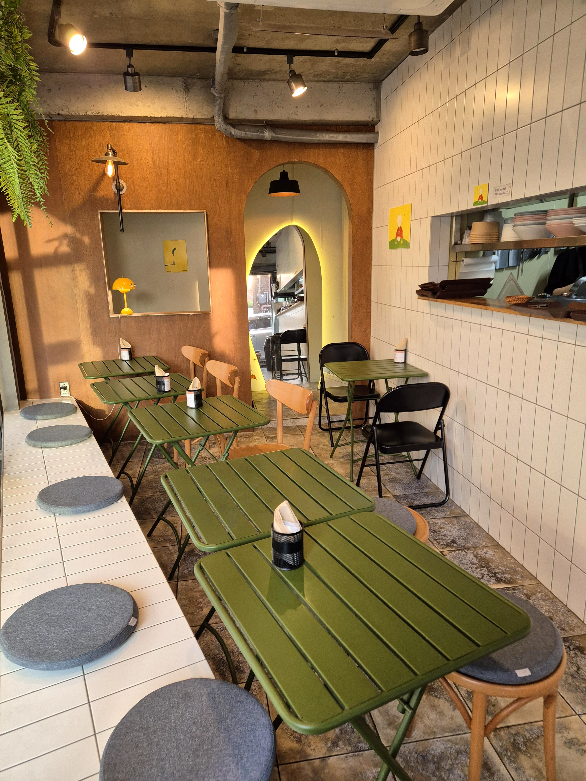 내부는 아담했지만, 따뜻한 느낌과 산뜻한 분위기를 연상케 했다. 따뜻한 분위기의 우드톤 색상과 곳곳에 묻어있는 짙은 초록초록함이 조화를 잘 아룬듯 했다. 안에서 먹는 것도 좋았지만, 우리는 선선한 바람이 불고, 한적한 분위기가 느껴지는 밖에서 먹기로했다.