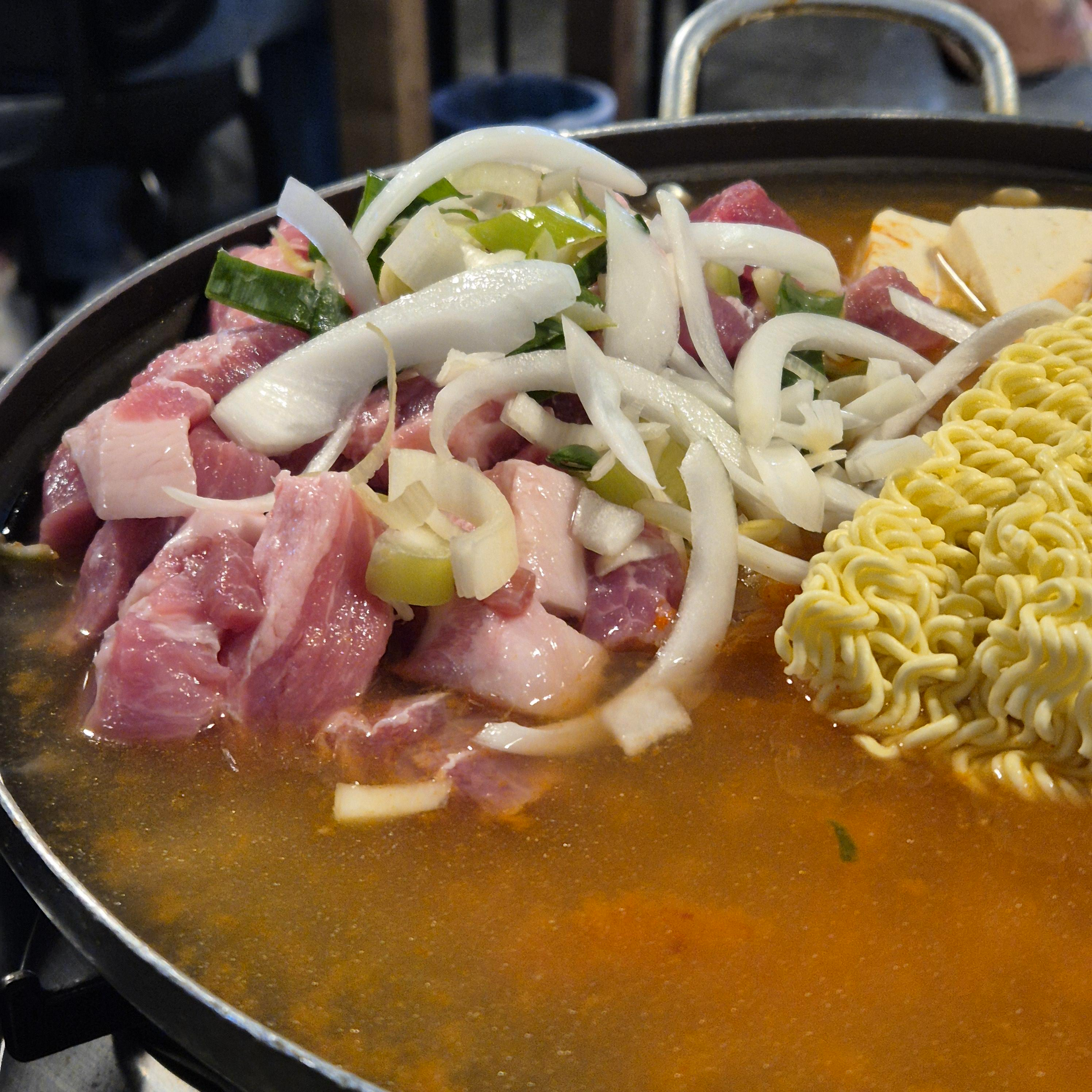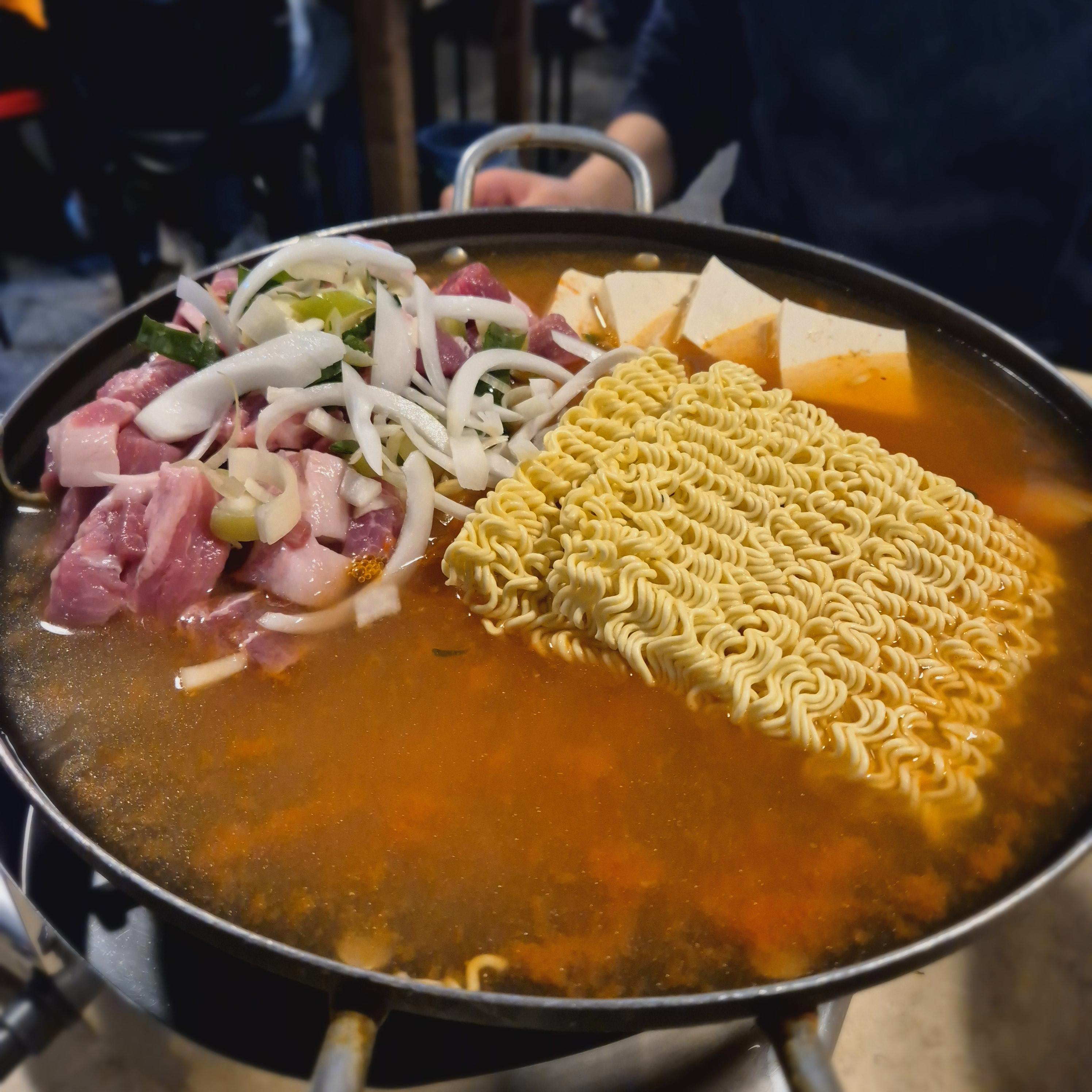 처음 나왔을 때는 살짝 연약해 보이는 김치찌개였다. 흐리멍덩한 게 맛있을까 싶기도 했다. 하지만 고기의 빛깔은 확실히 맛있는 생고기임이 틀림없었다. 위 사진의 김치찌개는 라면 넣을 공간을 만들기 위해 고기 및 건더기를 한쪽으로 몰았다. 그리고, 끓기 전과 끓은 후의 비주얼은 차원이 다르다.