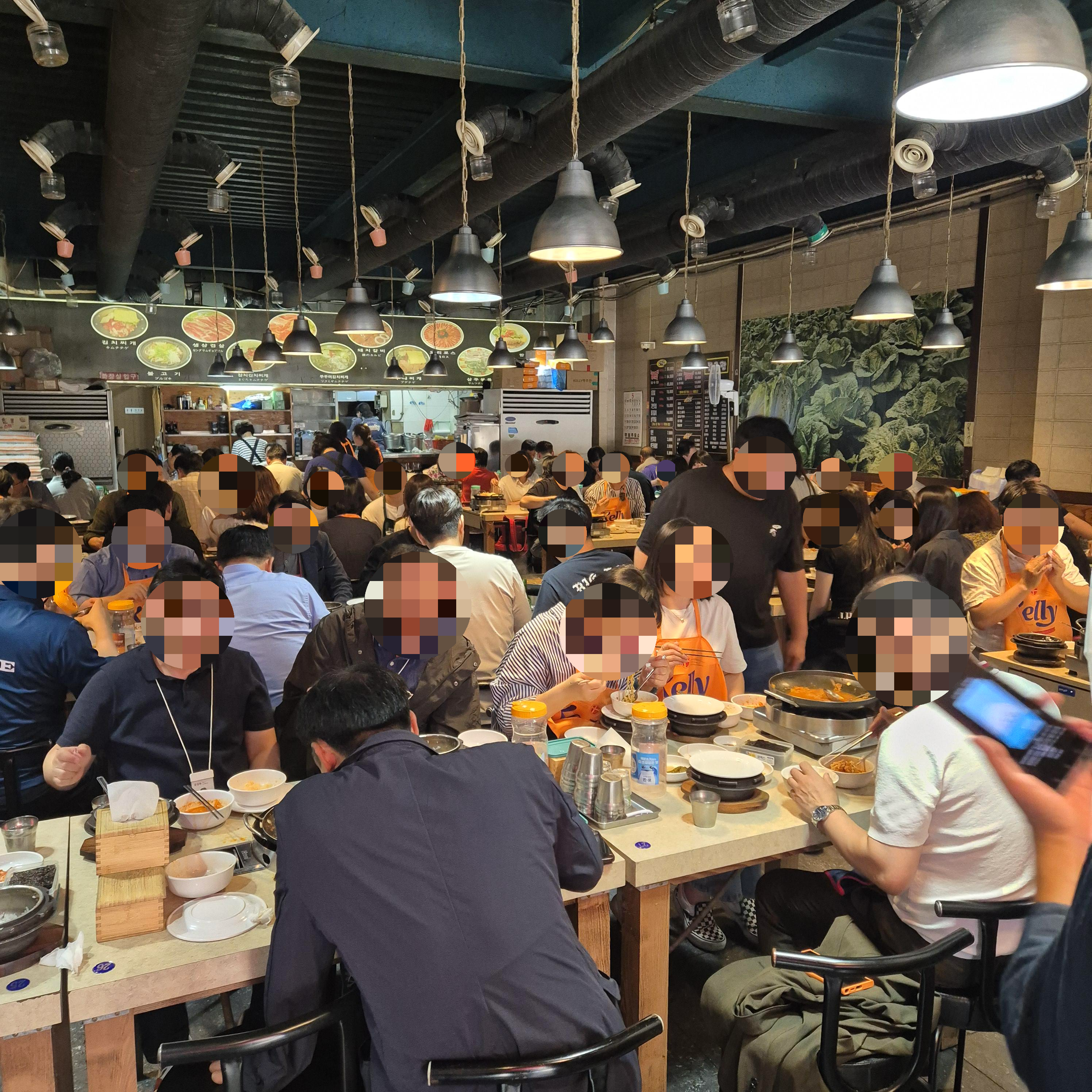 드시는 분들이 많아서 자세히 이곳저곳을 찍지는 못했지만, 정말 사람들이 바글바글했다. 마치 결혼식 뷔페를 온듯한 분위기였다. 가게 안은 살짝 더웠지만, 김치찌개가 정말 맛있어 보이긴 했다. 우리 순서가 언제 오나 기다리면서 메뉴판을 봤다.