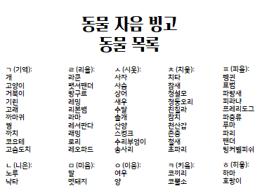실내 단체 레크레이션 6탄 [동물 자음 빙고!]