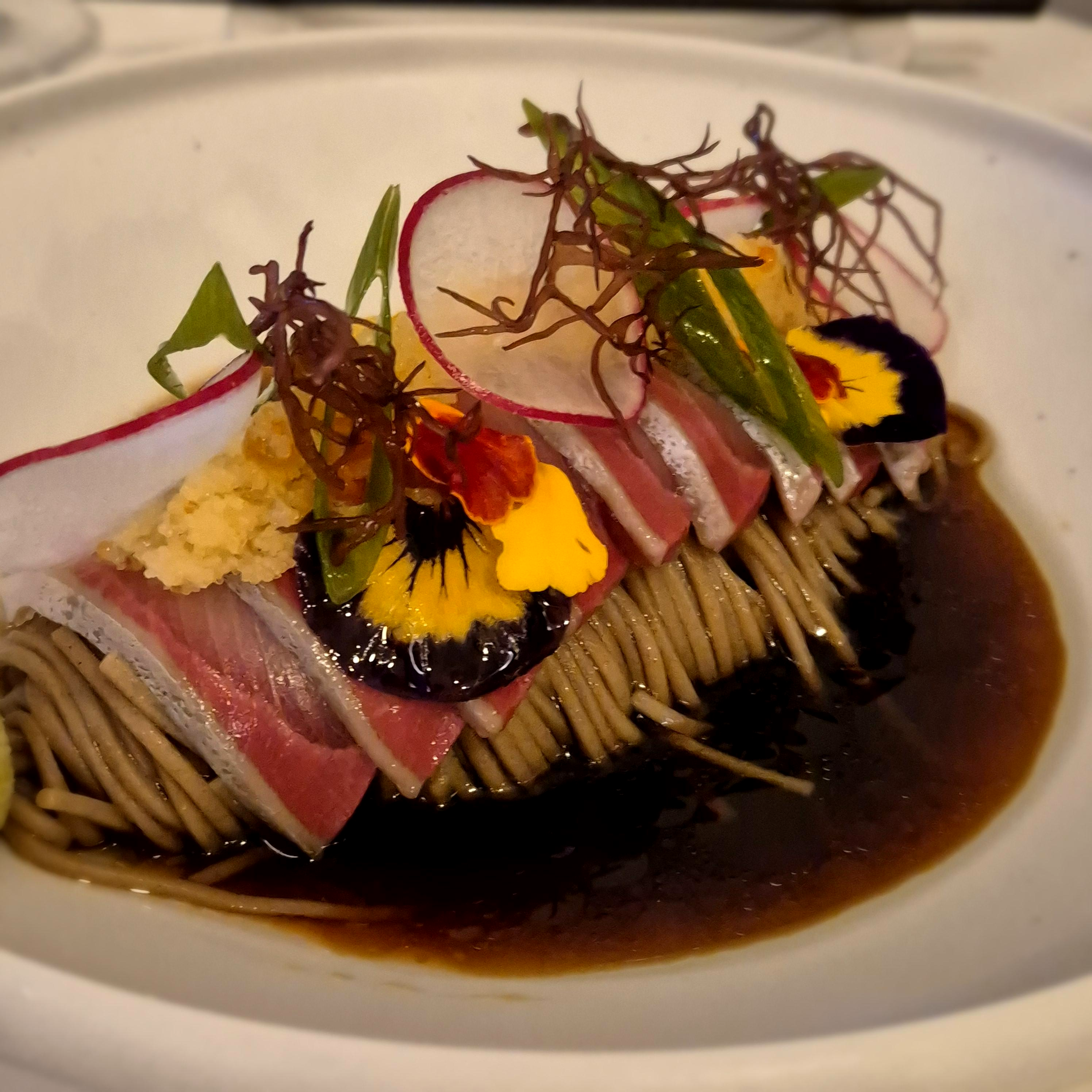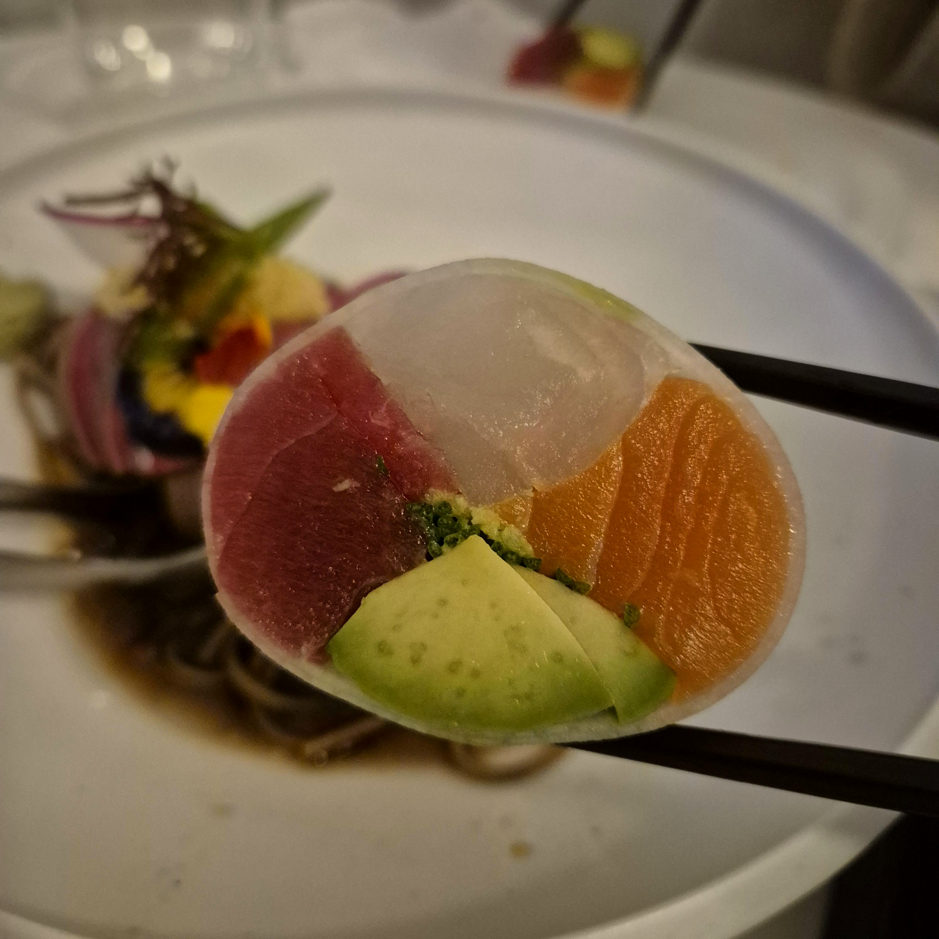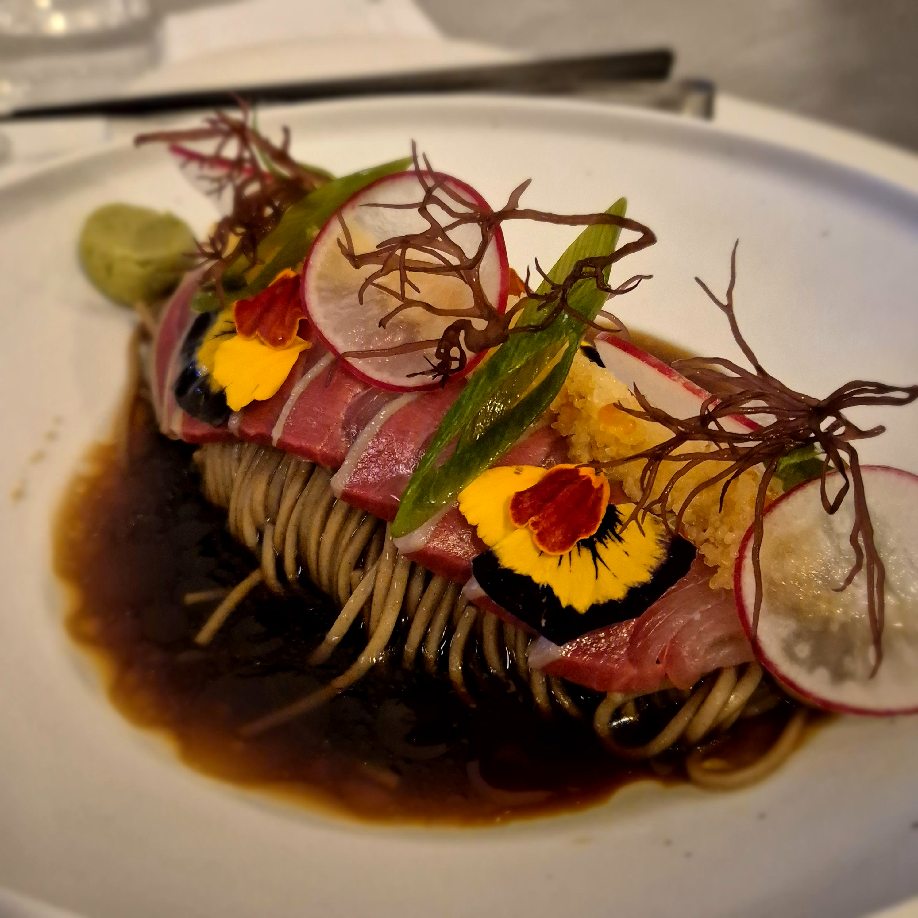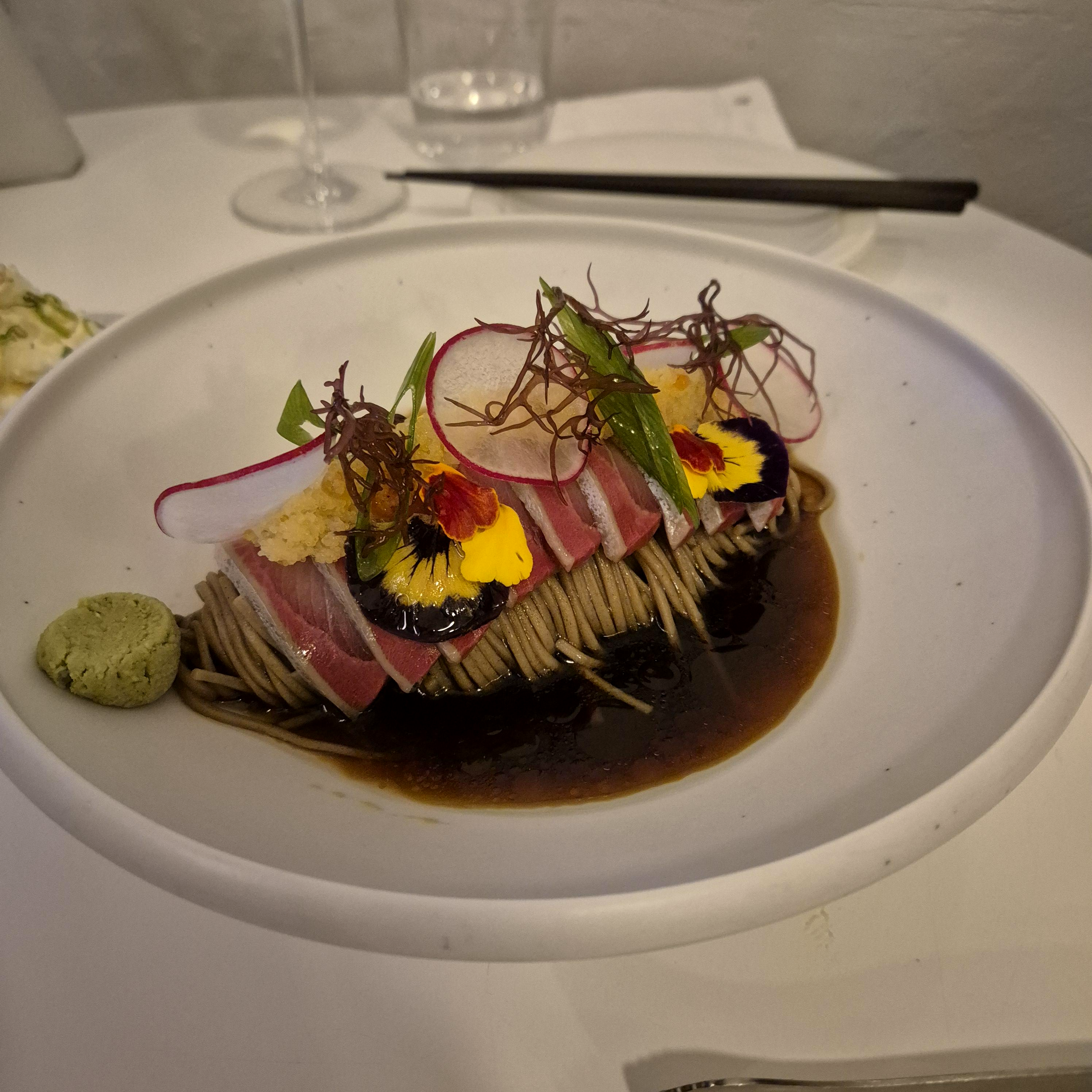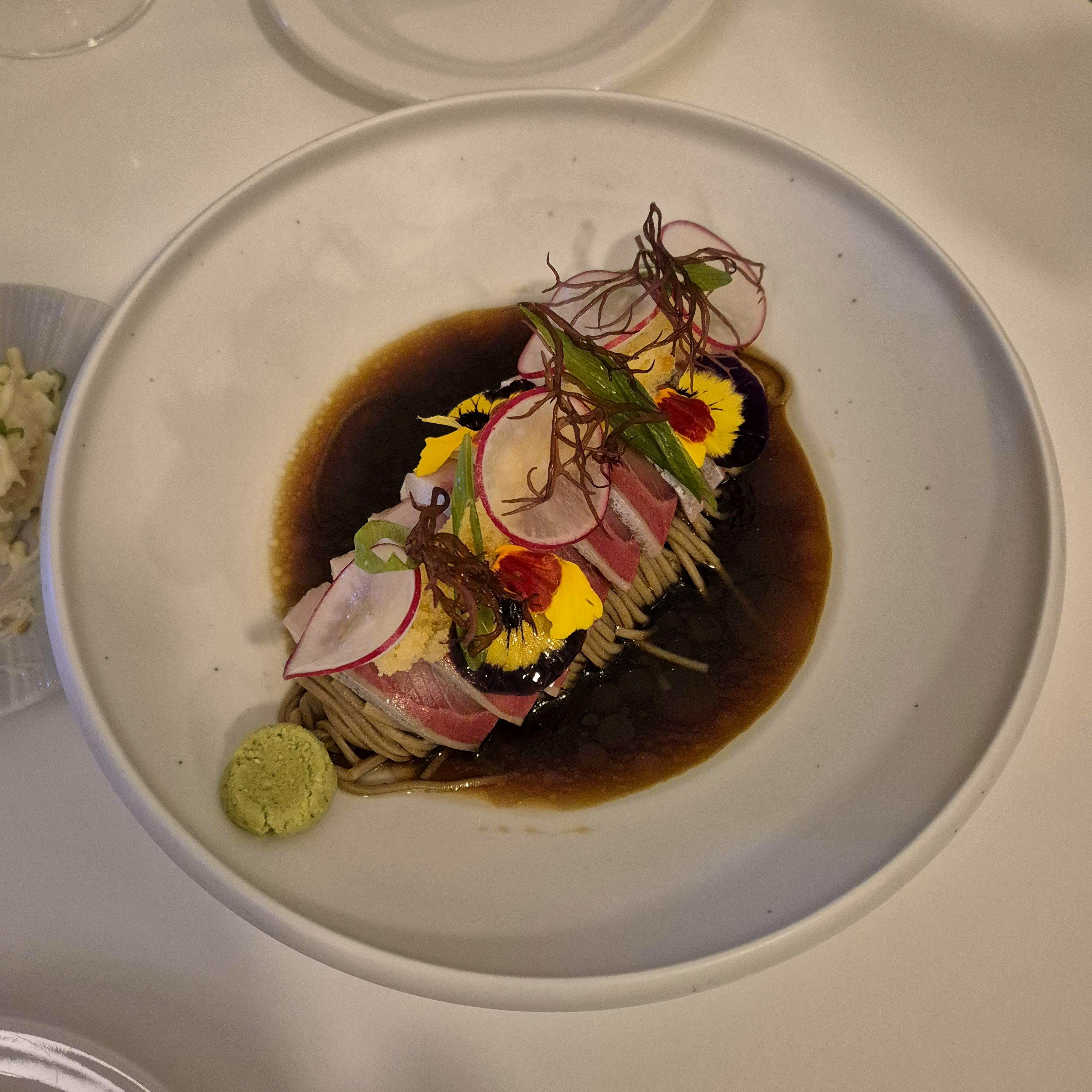 일단 비주얼부터 즐거움을 주는 사시미누들이었다. 안성재 셰프님은 필요하지 않은 꽃장식은 하지 말라고 하였는데, 솔직히 이게 필요한지는 모르겠으나 필자의 입장에선 보기엔 좋았다. 정갈하게 둘둘 말려진 모밀(?)면 위에 있는 10점 남짓의 사시미도 고급스럽고 이뻤다.