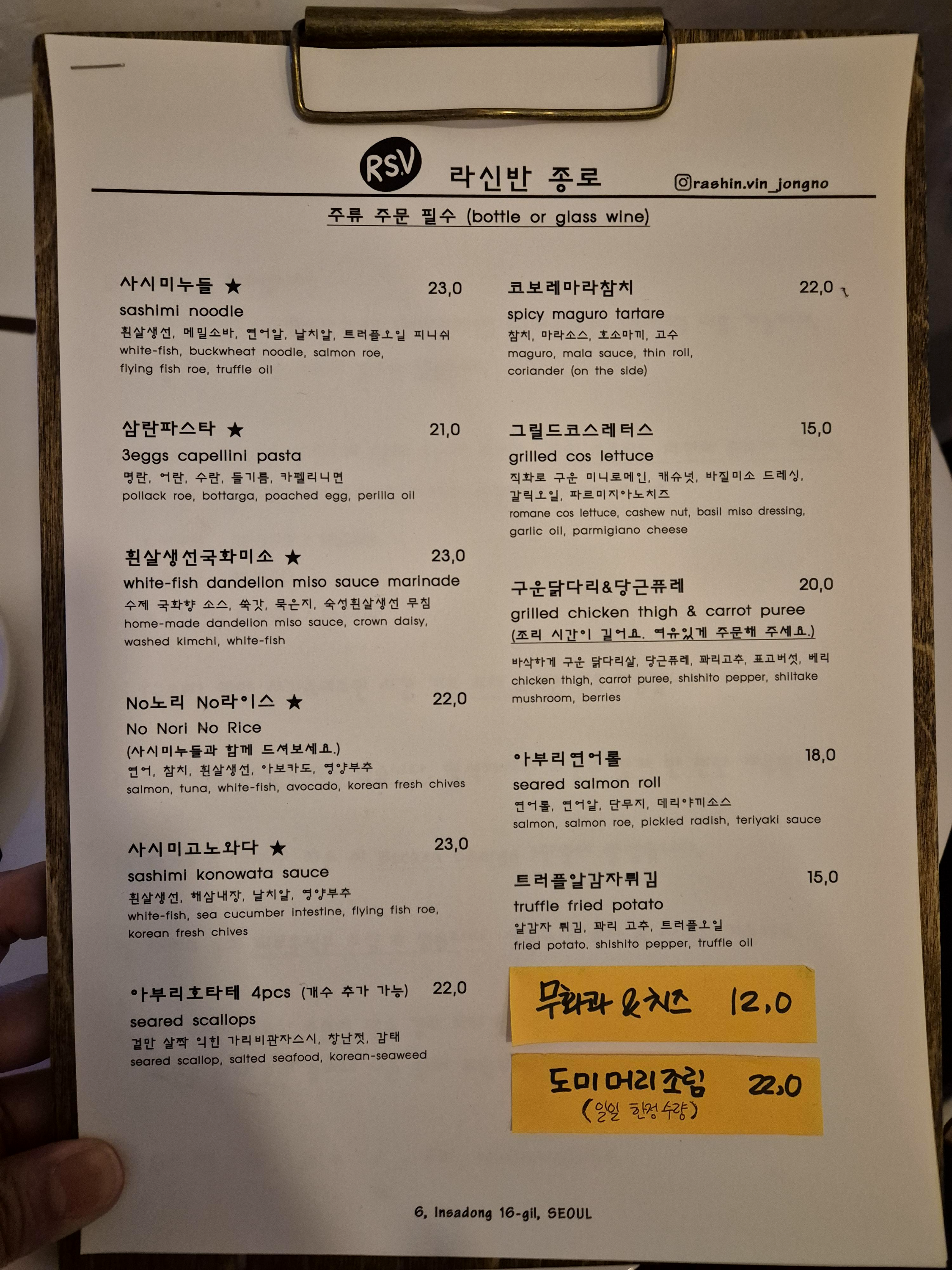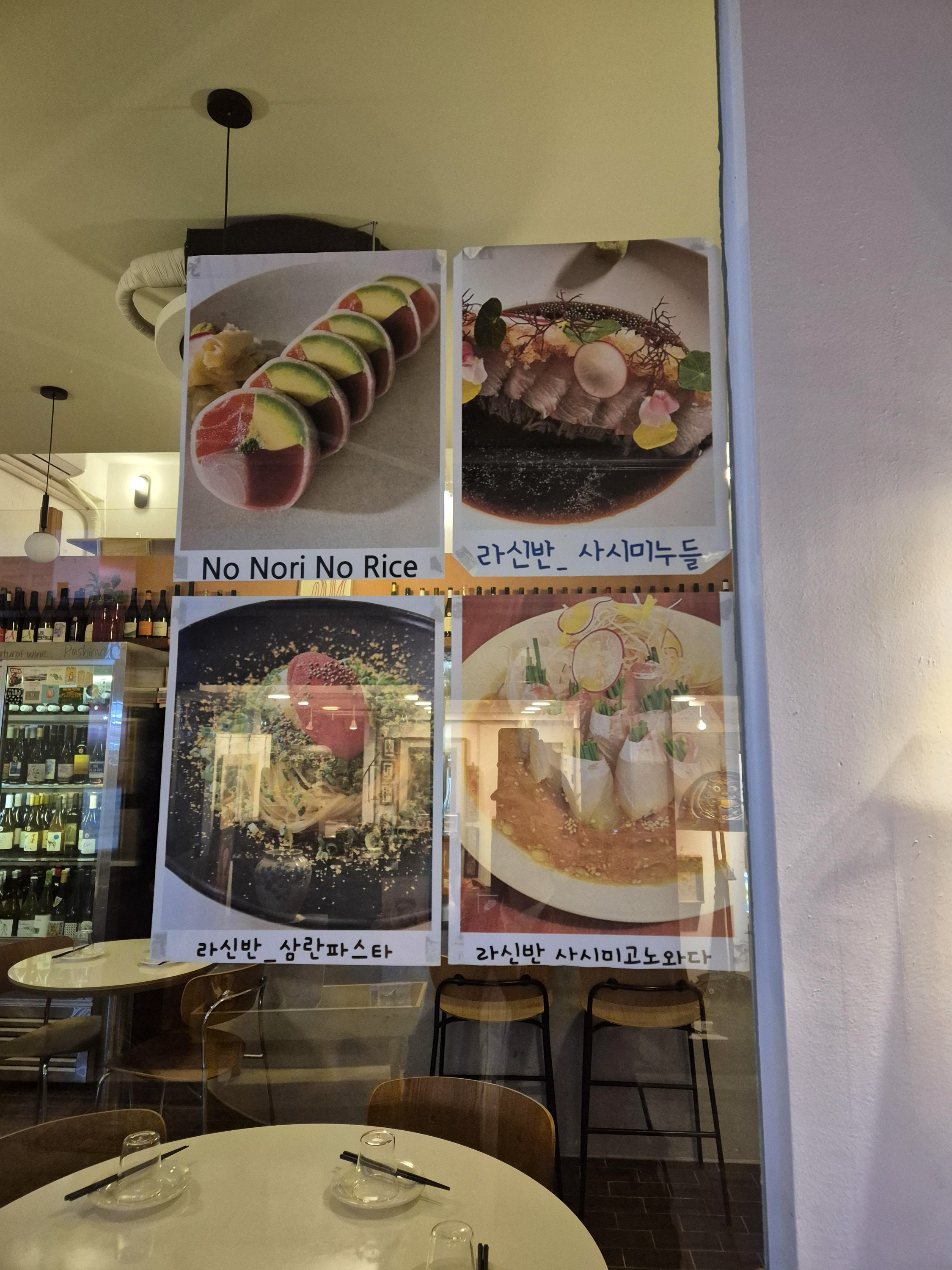 조금은 생소한 메뉴들이었지만, 우리는 사시미누들과 No노리 No라이스를 시켰다. 그리고 이 가게만의 특별한 룰이 있는데 일단 주류주문이 필수이다. (와인만!)