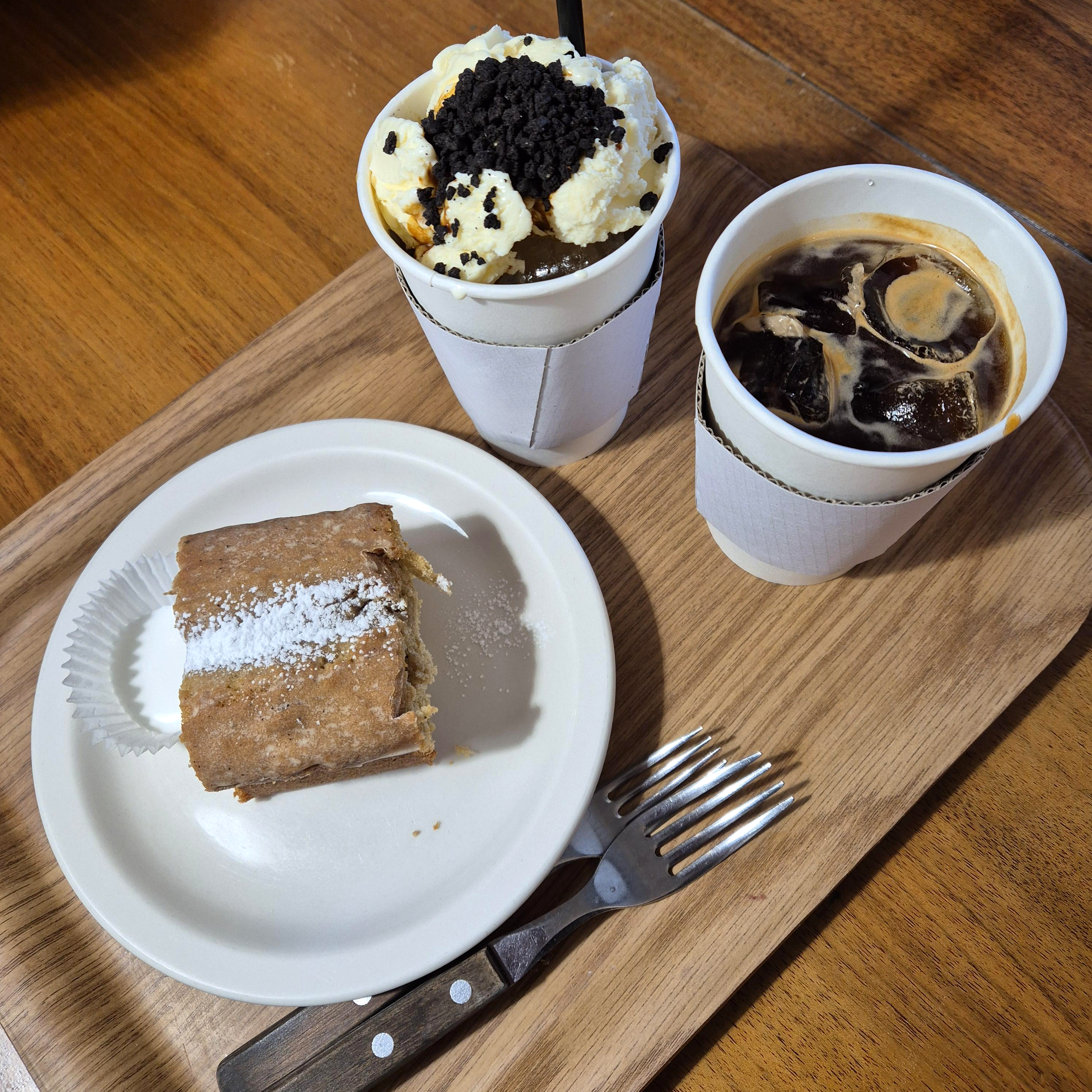 폭신과 푸석 그 사이 어딘가, 굳이 둘 중 고르라면 푸석에 60점을 주겠다. 얇게 코팅된 설탕의 단맛과 은은하게 퍼지는 얼그레이향 무난한 듯 분위기 때문이지 모를 좀 더 맛있게 느껴지는 얼그레이 케이크였다. 찍어먹을 연유도 주는데 달콤 그 자체였다. 아메리카노 먹을 때는 찍어먹겠으나, 아이스크림라떼 랑은 굳이 안 찍어 먹어도 될 듯했다.