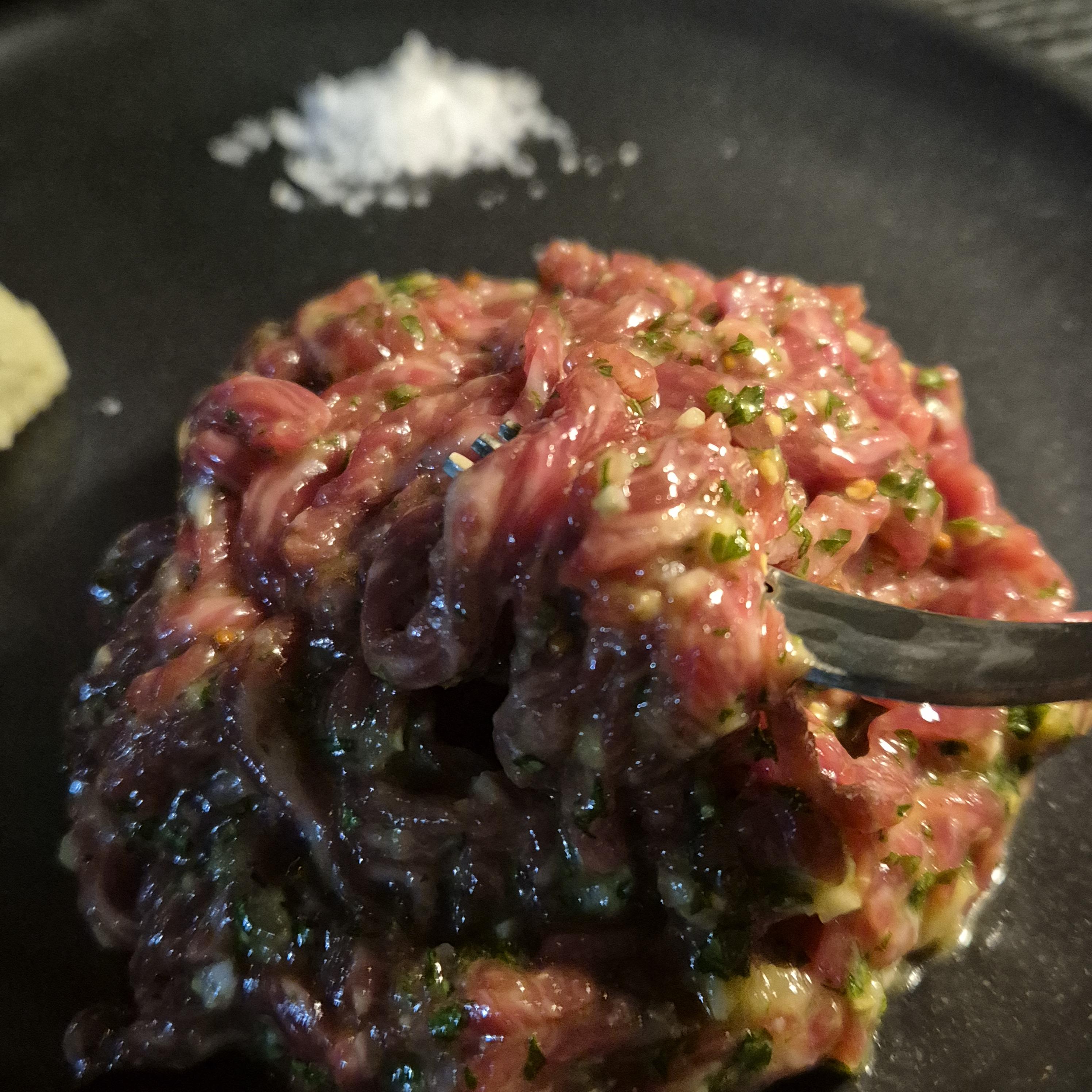 디쉬에 있던 몇 안되는 메뉴중 하나인데, 대만족 했던 메뉴였다. 저녁은 안먹고 바로 갔기 때문에, 어느정도의 채워짐이 필요했는데, 그에 딱 맞았다. 파슬리 패스토가 들어가서 그런지 밖에서 먹는 일반적인 육회의 원초적인 맛보다는 조금은 풍부한 맛이 났다. 생와사비 혹은 소금과 살짝 찍어먹으니 더욱 금상첨화였다.