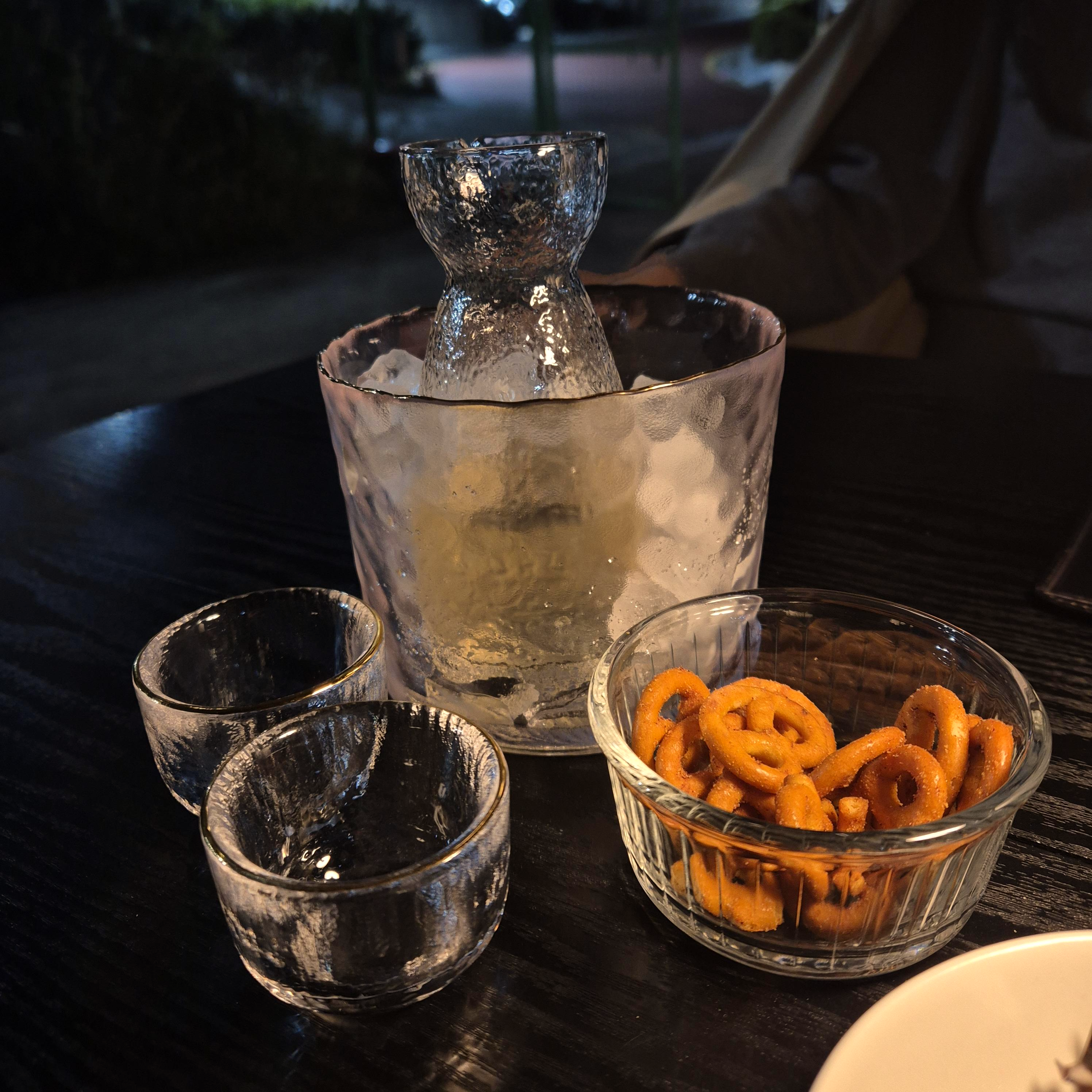살짝 아쉬워서 마지막으로 한잔 더 마신 칵테일 수작. 수작의 의미는 '갚을 수, 보답할 수' 의 수와 '술 따를 작' 이라는 뜻이라고 한다. 직역해보자면, "술을 따라 보답한다" 라고 말 할 수 있겠다. 그래서 다른 칵테일과는 다르게 잔이 2잔이 나온다. 살짝 아쉬울 때 먹기에 딱 좋은 술이 아닐까 싶다. 근데 정말 강하다. 이녀석은 도수가 강한녀석이다. 깨끗함이 있는 술이었지만, 그만큼 강하다.