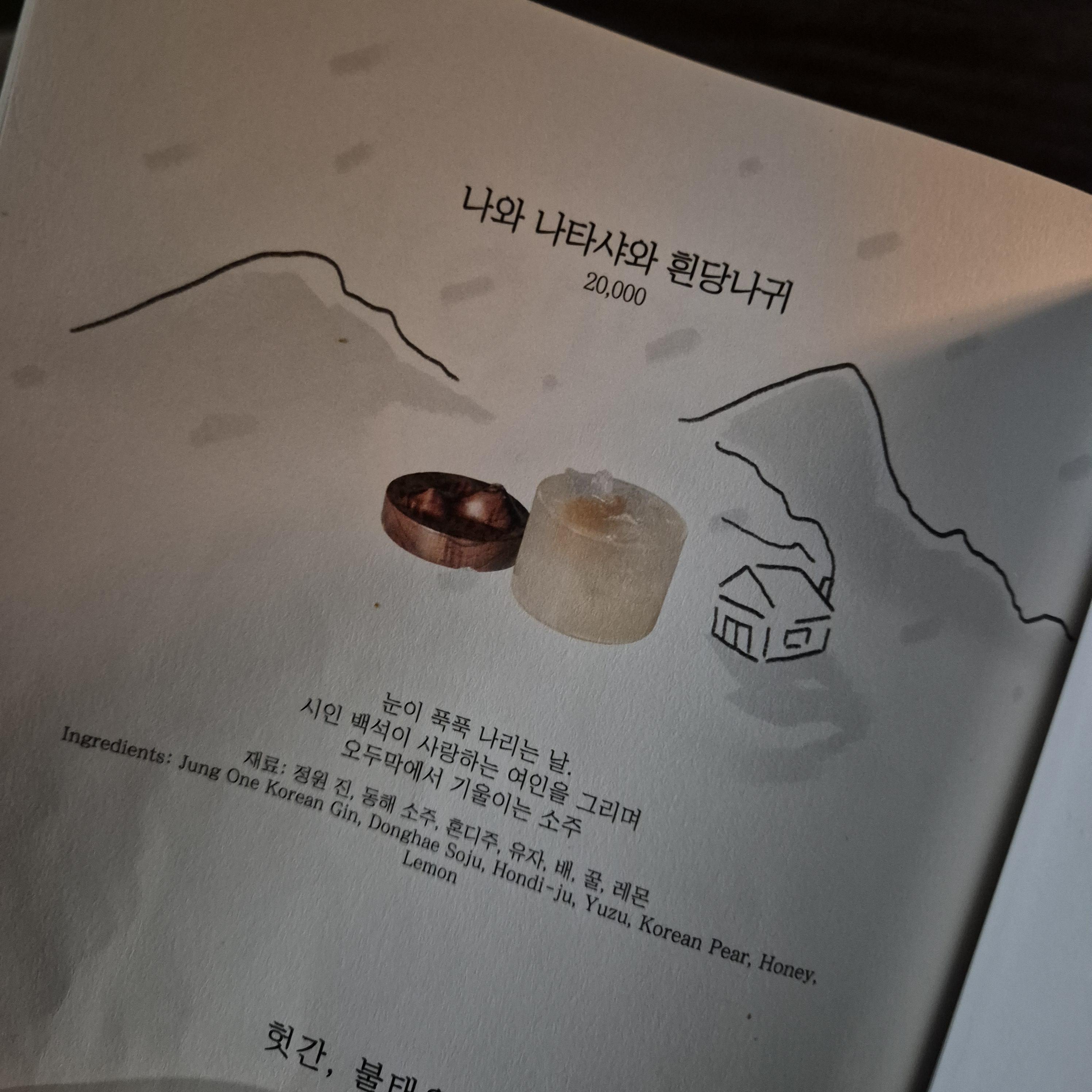 시인 백석님을 모티브로 만들어진 칵테일이라고 하셨다. 잔의 윗부분을 들면 산맥 모양의 베이스가 나오는데, 이 나와 나타샤와 흰당나귀 내용을 이 잔에 담았다고 하셨다. 재료에 대해서도 하나씩 설명해주셨다. 눈 덮힌 설산을 표현한 칵테일이라 할 수 있겠다. 맛은 유자와 배와 꿀 그리고 레몬이 들어간 만큼 상큼하고, 달콤함이 있지만, 그럼에도 결코 가볍지 않은 칵테일이었다. 너무 맛있었다.