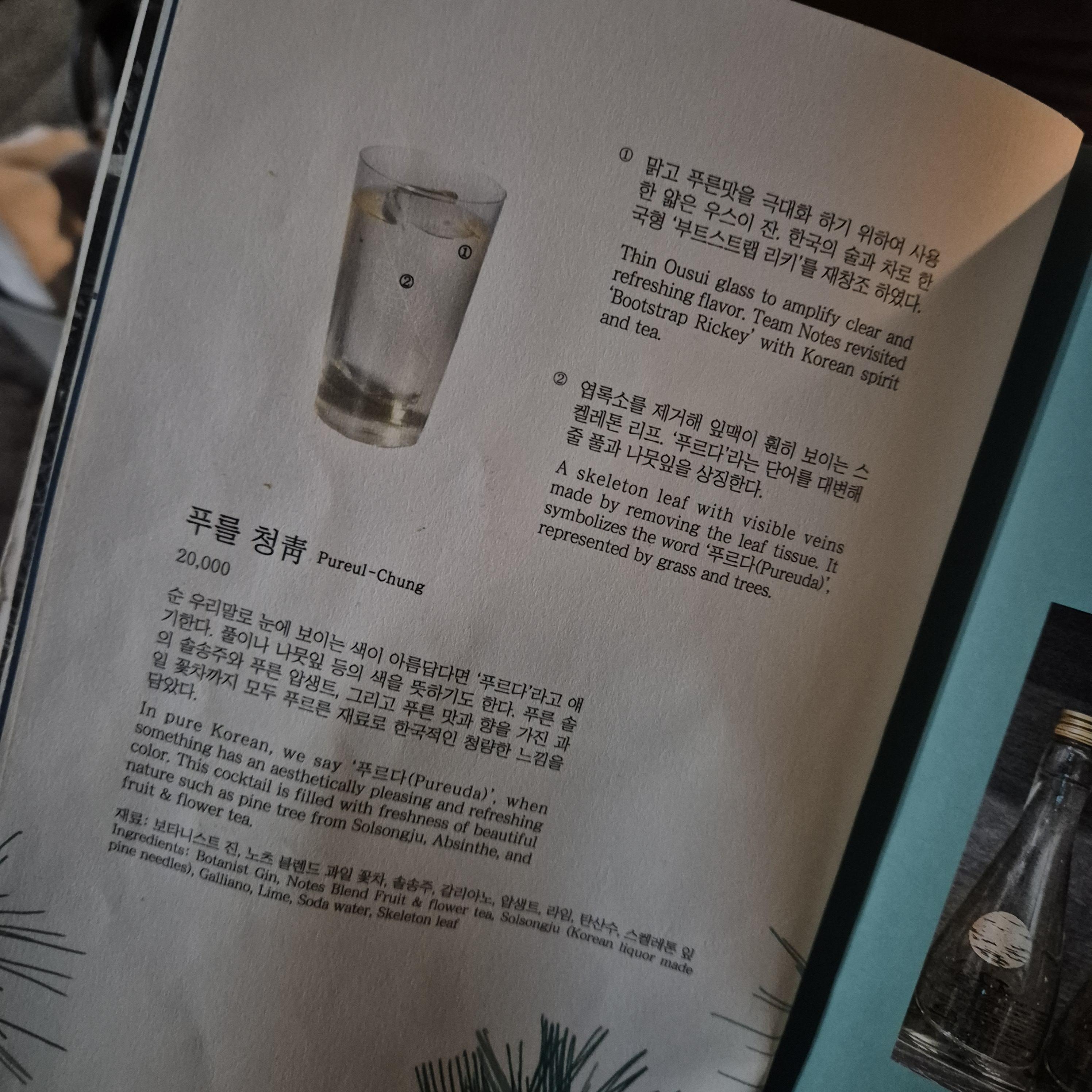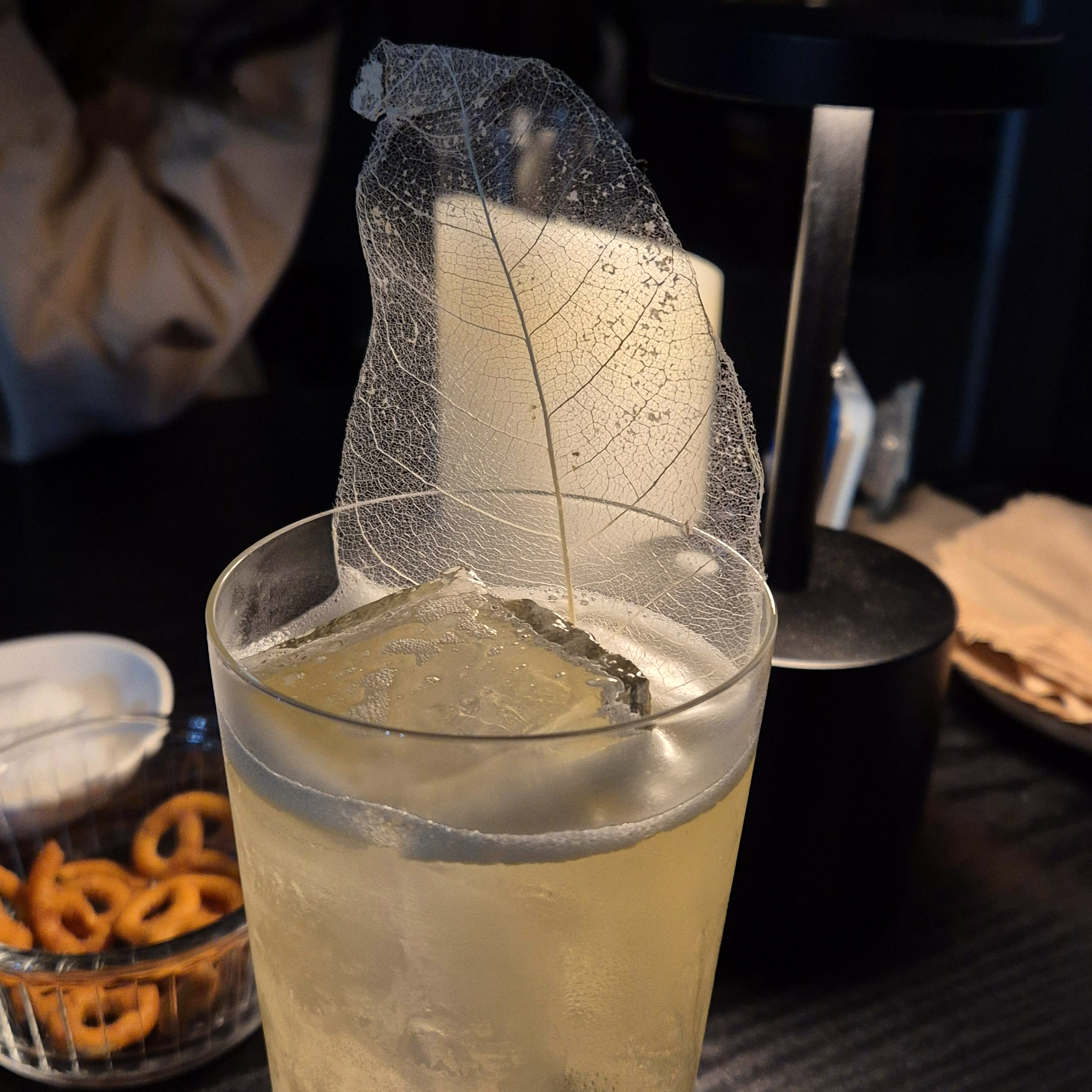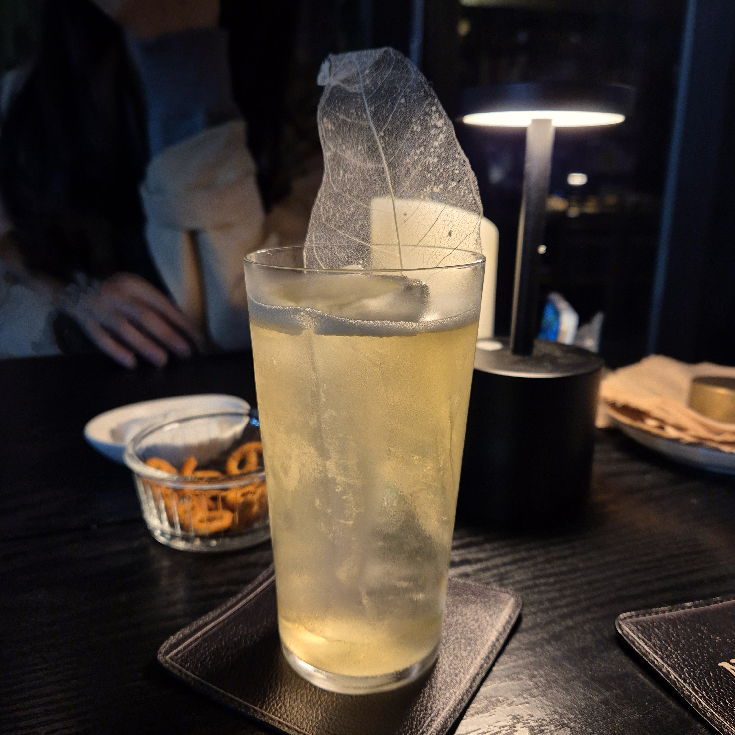 엽록소를 제거하여 잎맥이 보이는 스켈레톤리프의 구성으로 비주얼부터가 상당히 인상적인 칵테일이었다. 한입 마셔보았는데, 왜 여성분들이 이 칵테일을 더 좋아하시는 알 수 있었다. 전체적인 맛이 맑고 청아하며, 허브와 과일 꽃차의 향긋한 베이스와 솔송주가 주는 개운함 까지 뒷맛도 깔끔했다.