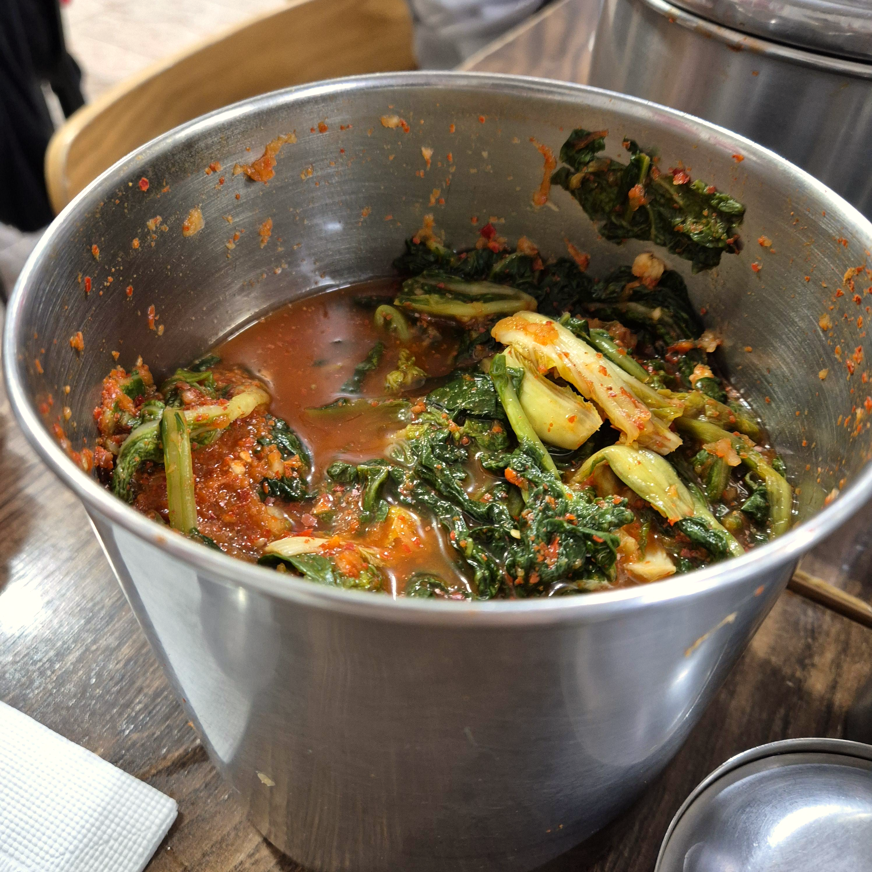 통에 담겨있는 열무김치와 배추김치. 맛있었다. 필자는 만둣국집, 칼국수집, 수제비집, 그리고 국밥집의 핵심은 김치라고 생각한다. 그런 의미에서 삼청동수제비 배추와 열무김치는 적절했다.
