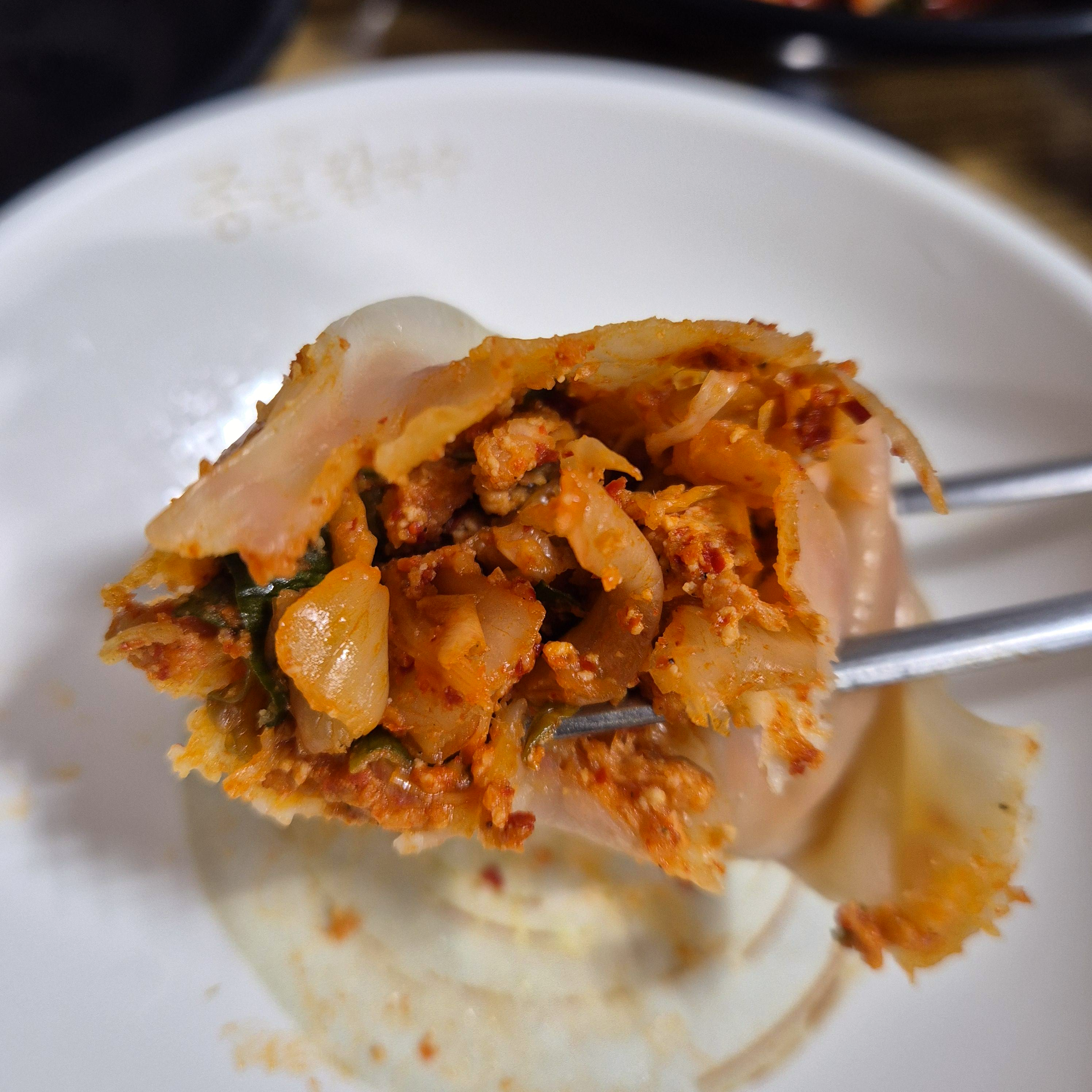 김치한입 먹고, 수제비 한입 먹고.