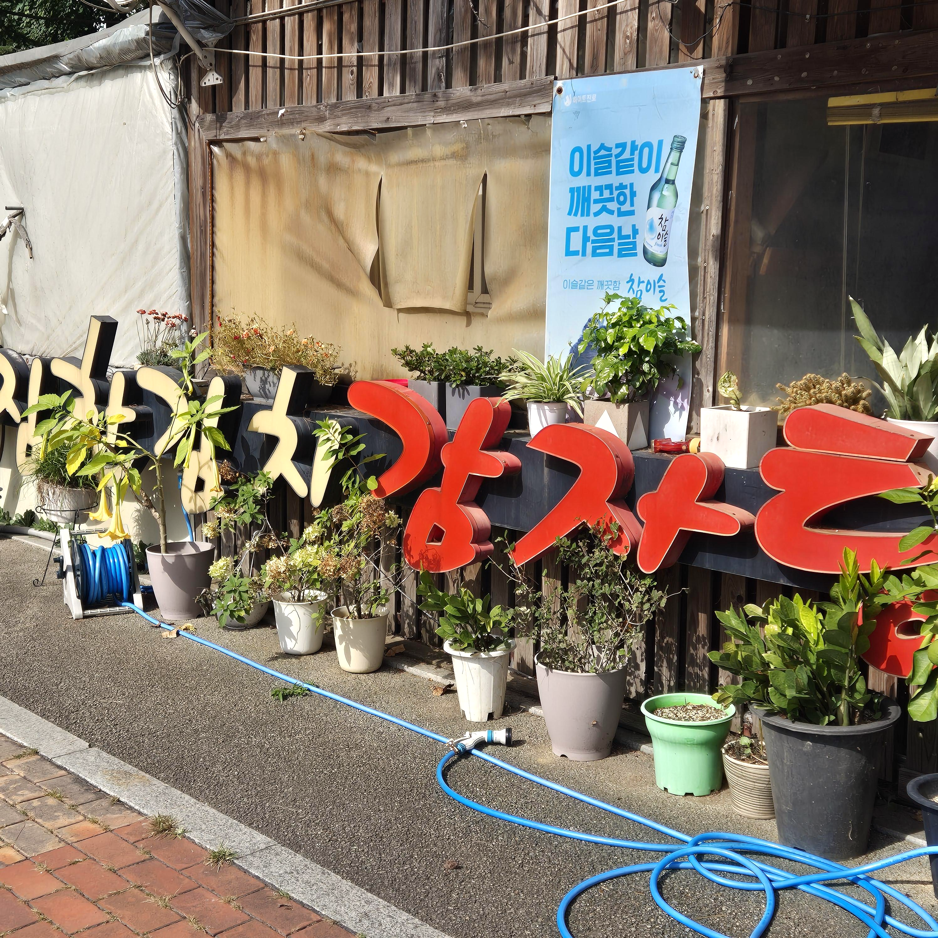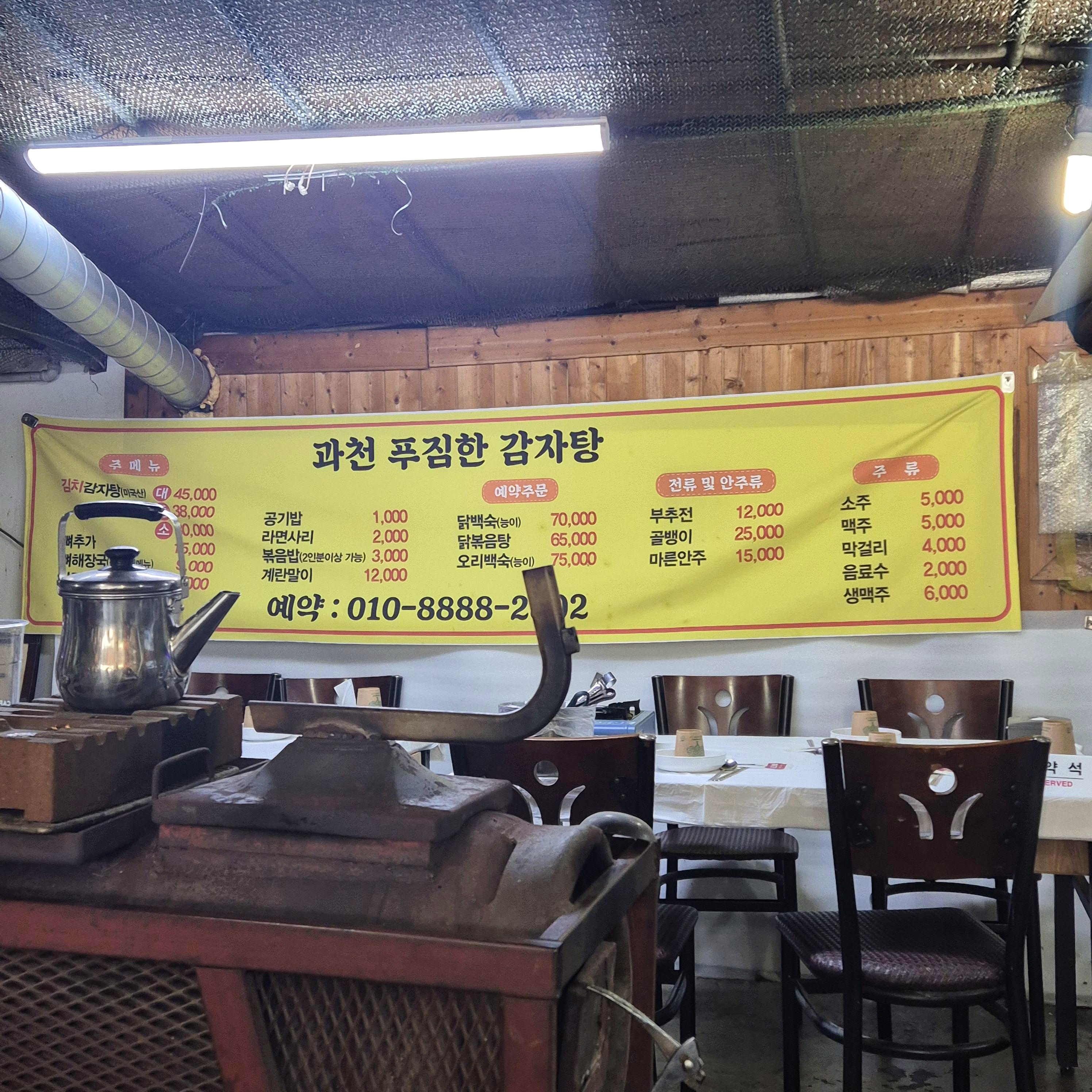 김치감자탕을 판다는 것을 알 수밖에 없는 화분 사이에 숨은 거대간판이다. 서울대공원 콘셉트인지 자연과 어우러진 간판이었다. 기대를 안고 들어갔다.