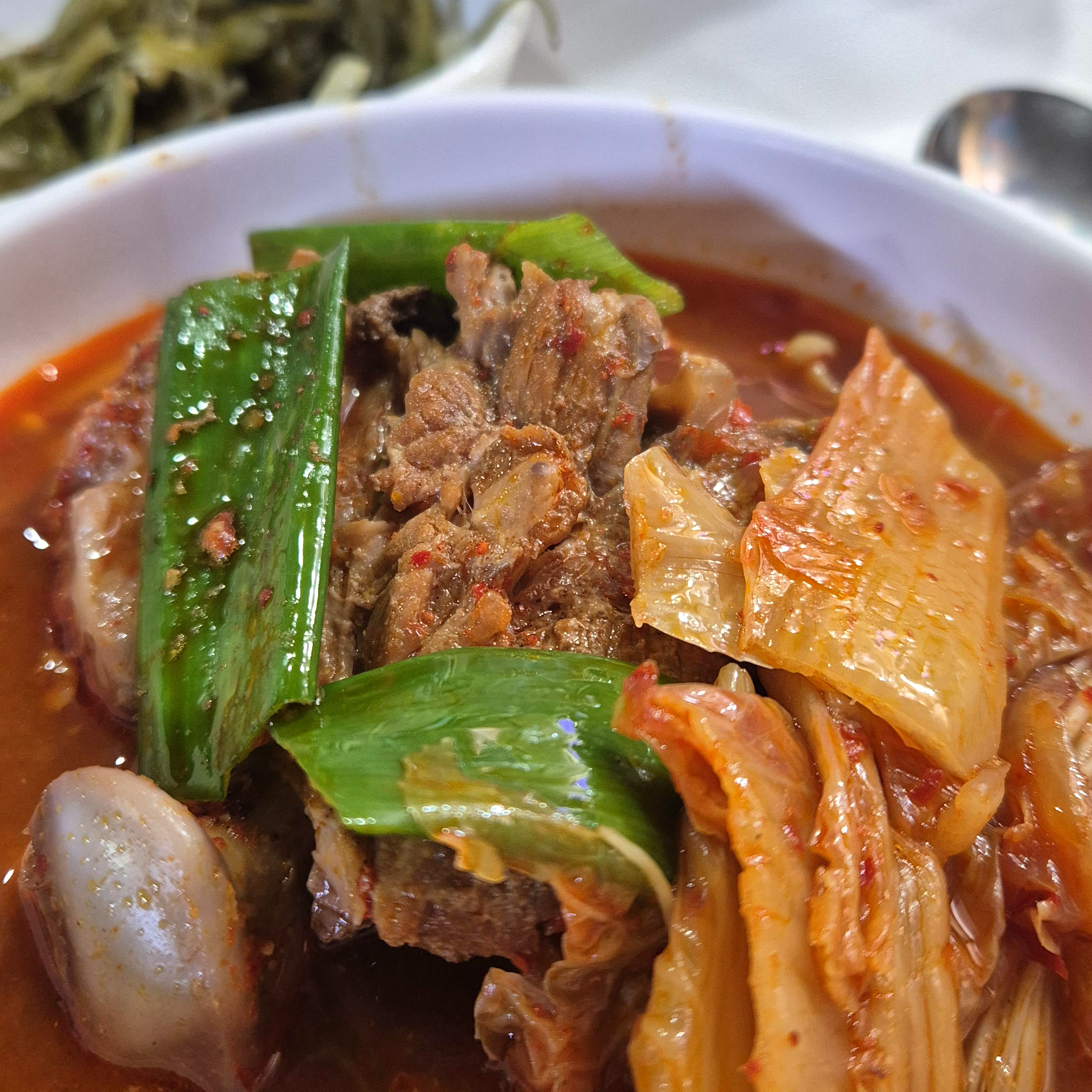 무엇을 먹을까 고민하다가, 뼈해장국 2개를 시키기 위해 말씀드렸다. 평일 점심에만 가능한 메뉴라 안된다고 하셨다. 그래서 우리 일행은 김치감자탕(소) 와 밥 두공기를 시켰다.