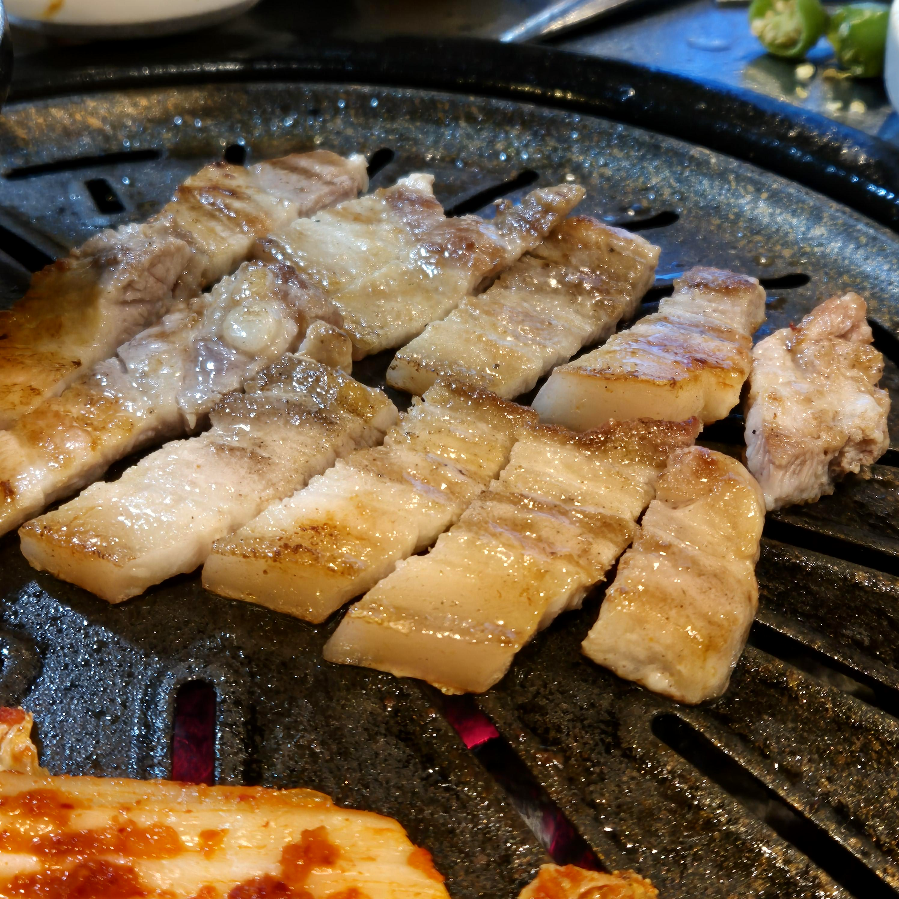고기를 잘 찍지는 못했지만, 진짜 맛있었다. 실제 식감을 생각해 보자면, 항정살과 삼겹살 사이정도? 은근한 쫀득함도 좋았다. 얇은 편이라 집중해서 구워야 더 맛있게 먹을 수 있다. 근데, 타도 맛있었다.^^