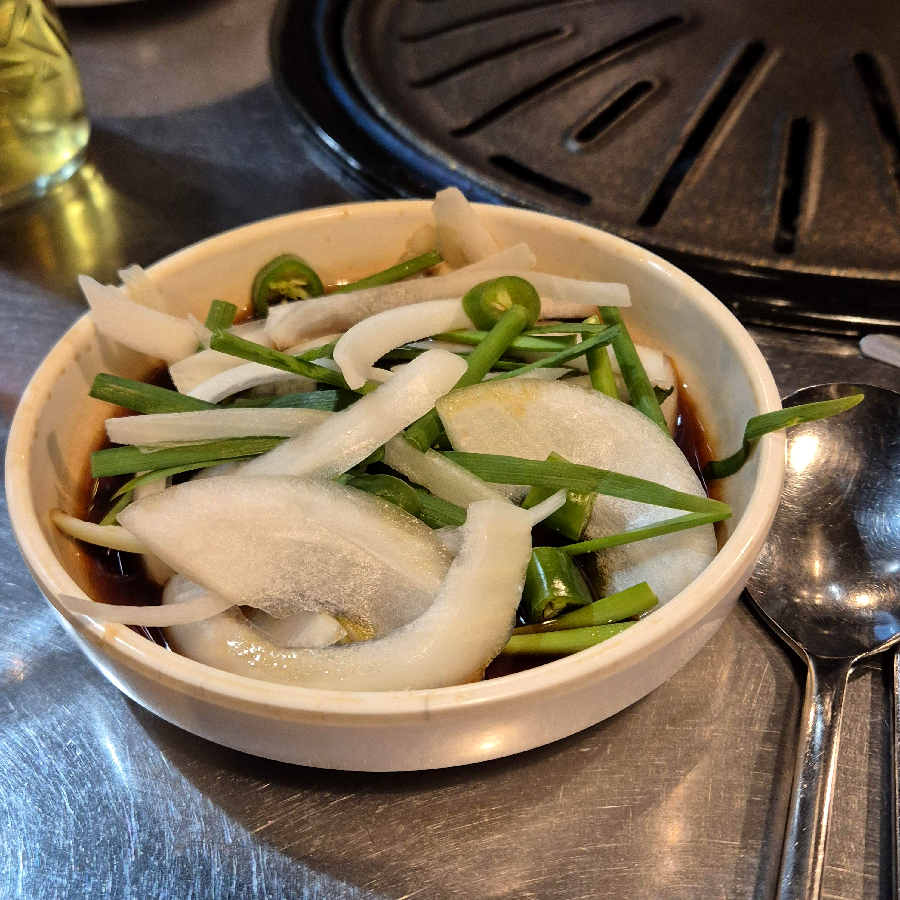 달짝지근한 간장소스에 파릇파릇 양파와 부추, 고깃집에 자주 있는 밑반찬이지만 역시 맛있었다. 야채를 상당히 많이 먹는 필자 입장에서는 깻잎이 없어서 아쉽긴 했으나 상추쌈도 아주 굿이었다.