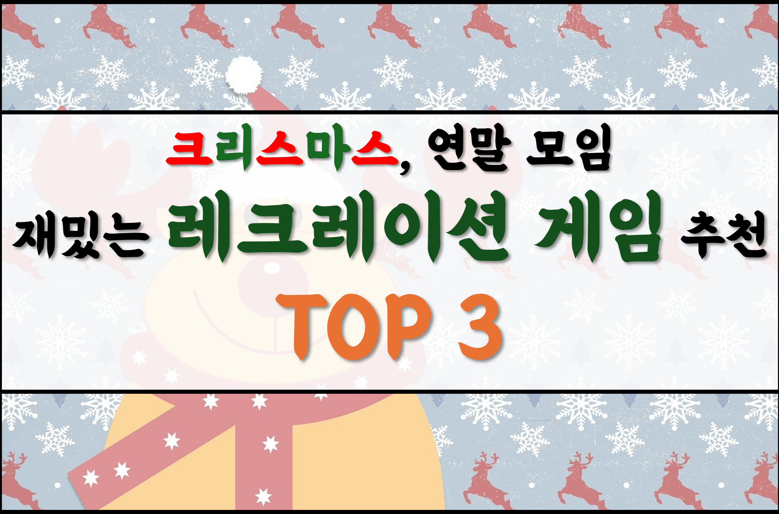 오늘은 크리스마스 시즌을 맞이하여 연말에 펜션이나 어딘가 친구들끼리 모였을 때 혹은 수련회 같이 단체로 놀러 갔을 때 할만한 레크레이션 3가지를 추천드리려고 한다. 필자도 놀러갔을때 심심하면 거의 무조건 하는 게임이라고 할 수 있겠다.