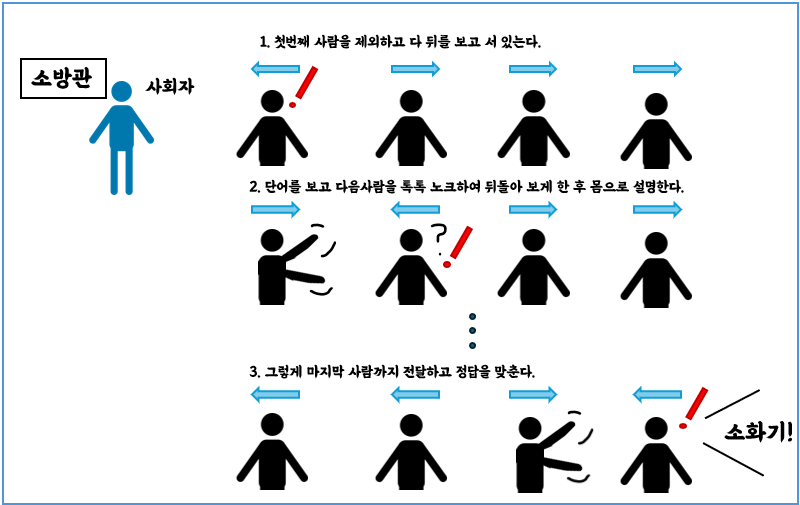 한 때 가족오락관에서나 가끔 TV프로그램에서 많이 나왔던 레크레이션 게임이다. 첫 번째 사람이 제시어를 보고 몸으로 표현하여 그다음 사람에게 설명하고, 그다음 사람은 또 그다음사람에게 릴레이식으로 설명하는 게임이다. 마지막 사람이 제시어를 맞추면 된다. 대략적인 모습을 그려보면 아래의 그림과 같다.