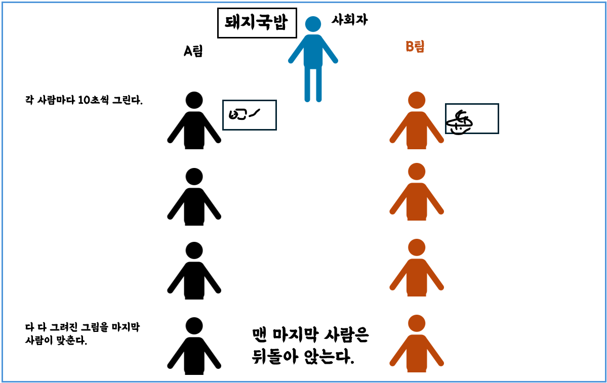 많은 TV프로그램에서도 나왔고, 어느 상황에서 하든지 다양한 변수로 재미가 보장된 레크레이션 게임이다. 일정 시간씩 하나에 제시어에 대해 그리고, 마지막 사람이 그 제시어를 맞추는 게임이다. 대략적인 모습을 그려보면 아래의 그림과 같다.