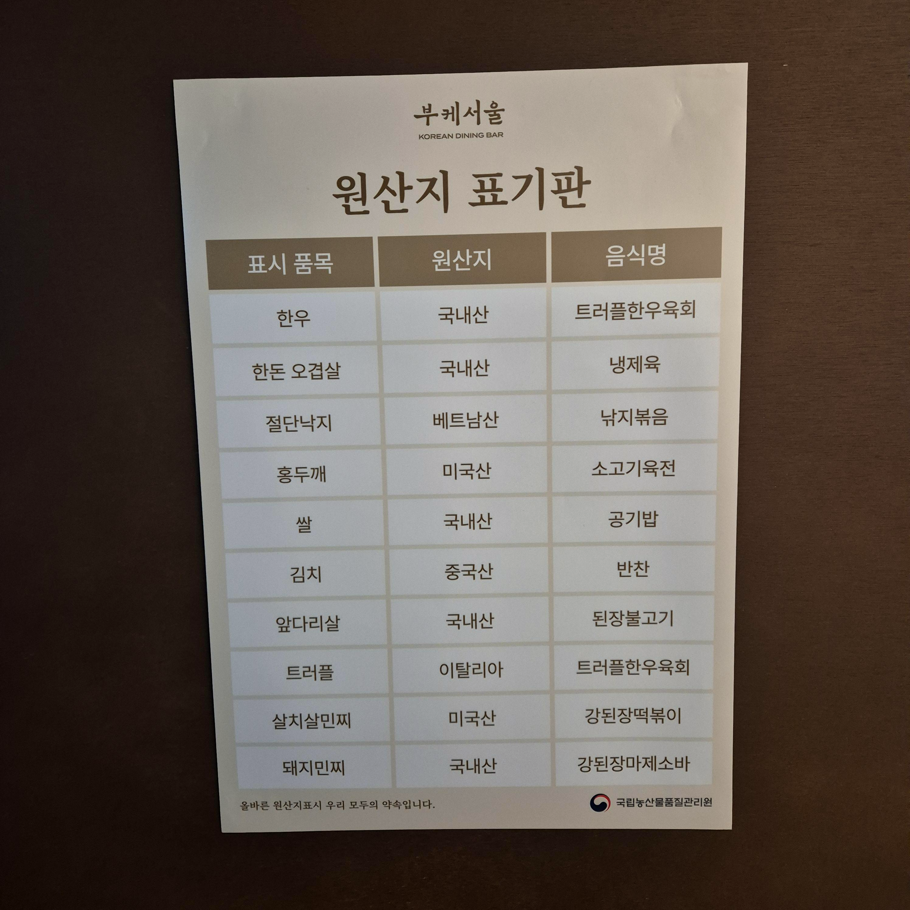 1층은 카운터고 2층에 자리가 있어서 안내받아 올라가던 중 찍은 원산지표기판이다. 계단옆에 붙어있는 건 또 처음 본다.
