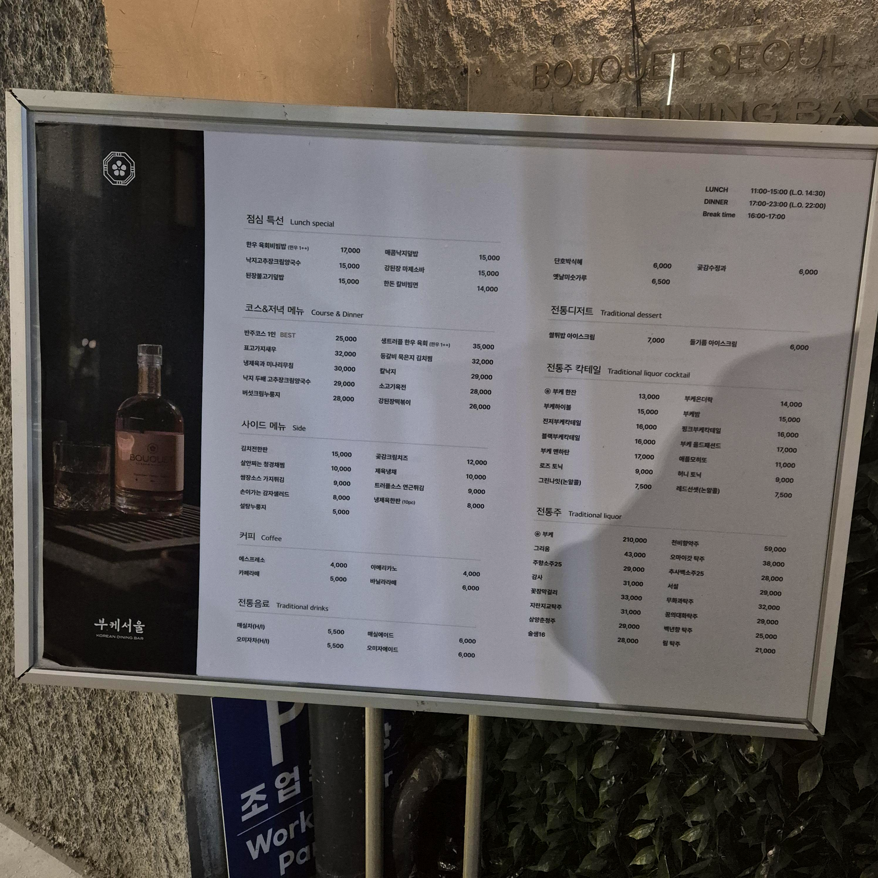 안에 손님들이 계셔서 제대로 내부를 찍지는 못했지만, 분위기 좋다. 고급스럽다. 기념일에 올만하다. 데이트 장소로 좋다. 소개팅 장소로도 좋다. 이런 문구들이 스쳐 지나가는 부케서울이다. 우리도 자리를 안내받았다.