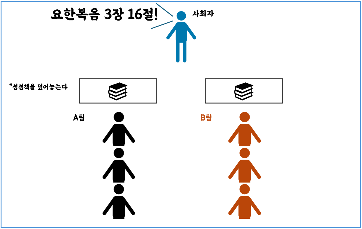 이번 행사 때 처음으로 해본 게임인데, 단순하지만 집중도 잘되고 누구나 참여할 수 있는 즐거운 게임이었다. 말 그대로 성경을 빨리 찾는 게임이다. 대략적인 모습을 그려보면 아래의 그림과 같다.