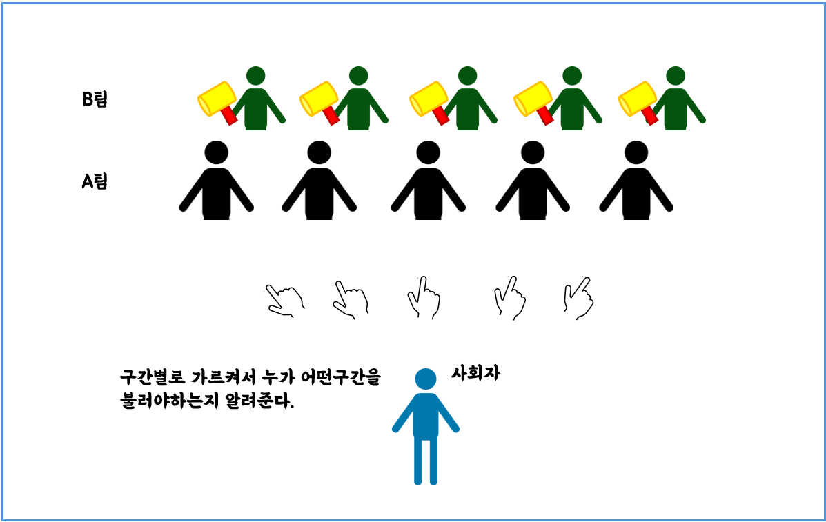 - 구간별로 선택받은 사람이 노래 부르면 된다.