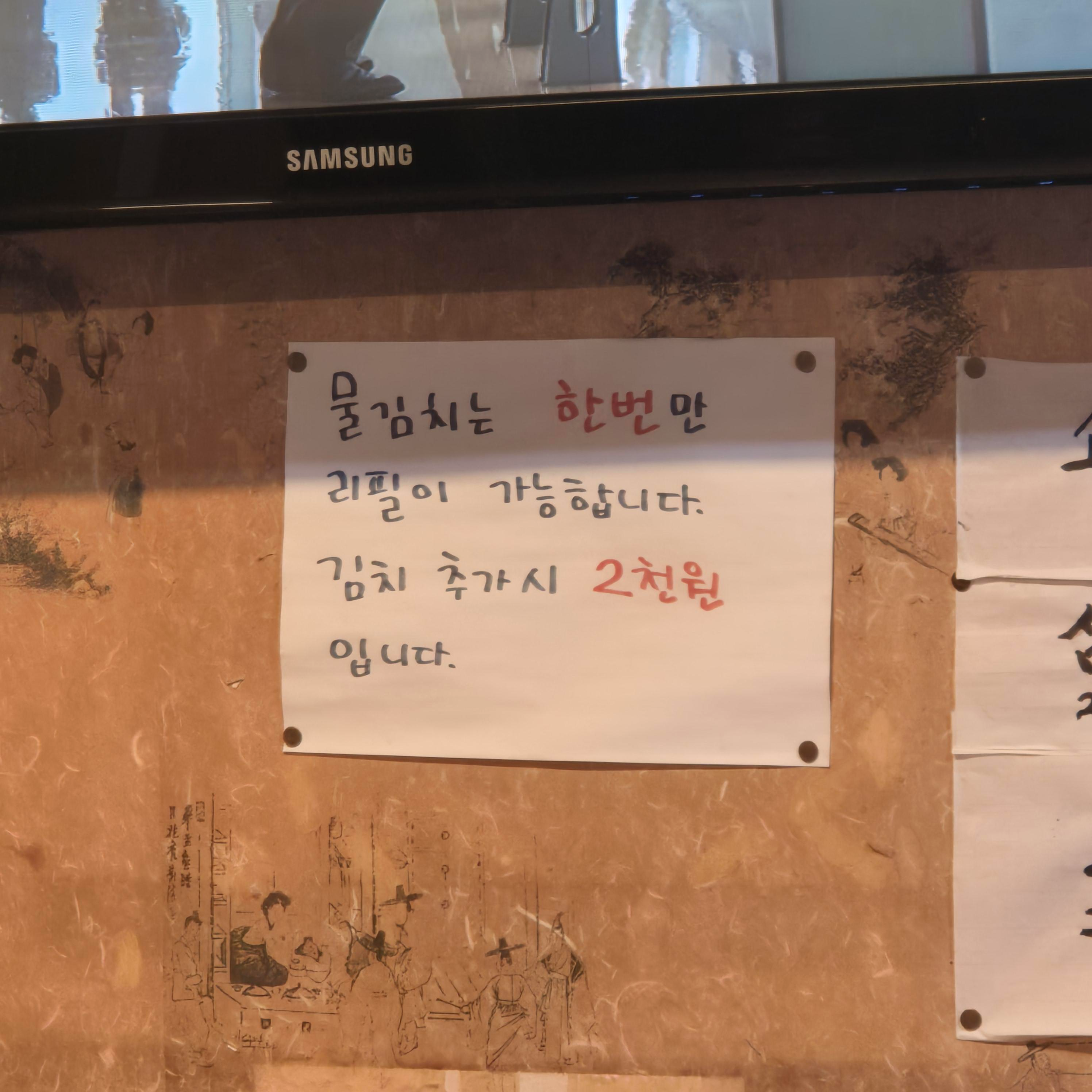 우리도 결국 물김치를 한 번 더 먹을 수밖에 없었다. 사실 필자는 첫 번째 리필도 무료가 아닌 줄 알고 아껴먹고 있었는데, 첫 리필은 공짜라고 하셔서 거침없이 먹었다.^^