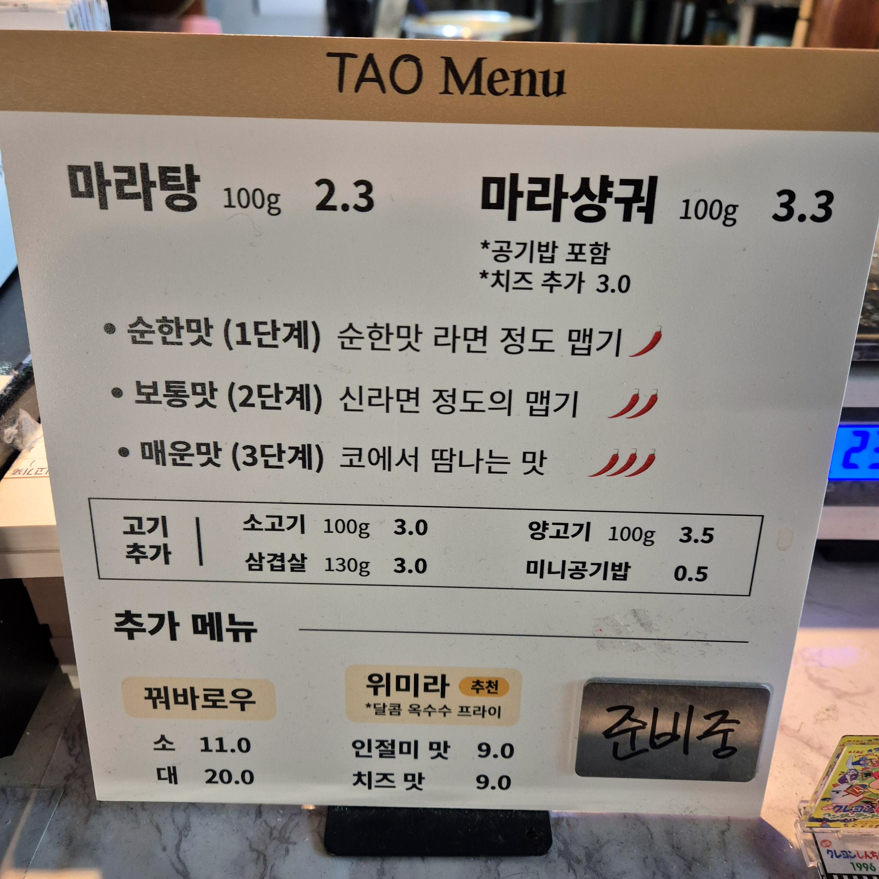 일단 메뉴판, 뭐 마라탕과 샹궈는 모두가 아는 것이고, 이 'TAO' 의 특별 추천메뉴는 다름 아닌 위미라였다. 처음 보기도 했고, 먹어보고 싶었다. 필자는 옥수수를 정말 좋아하기 때문이다.