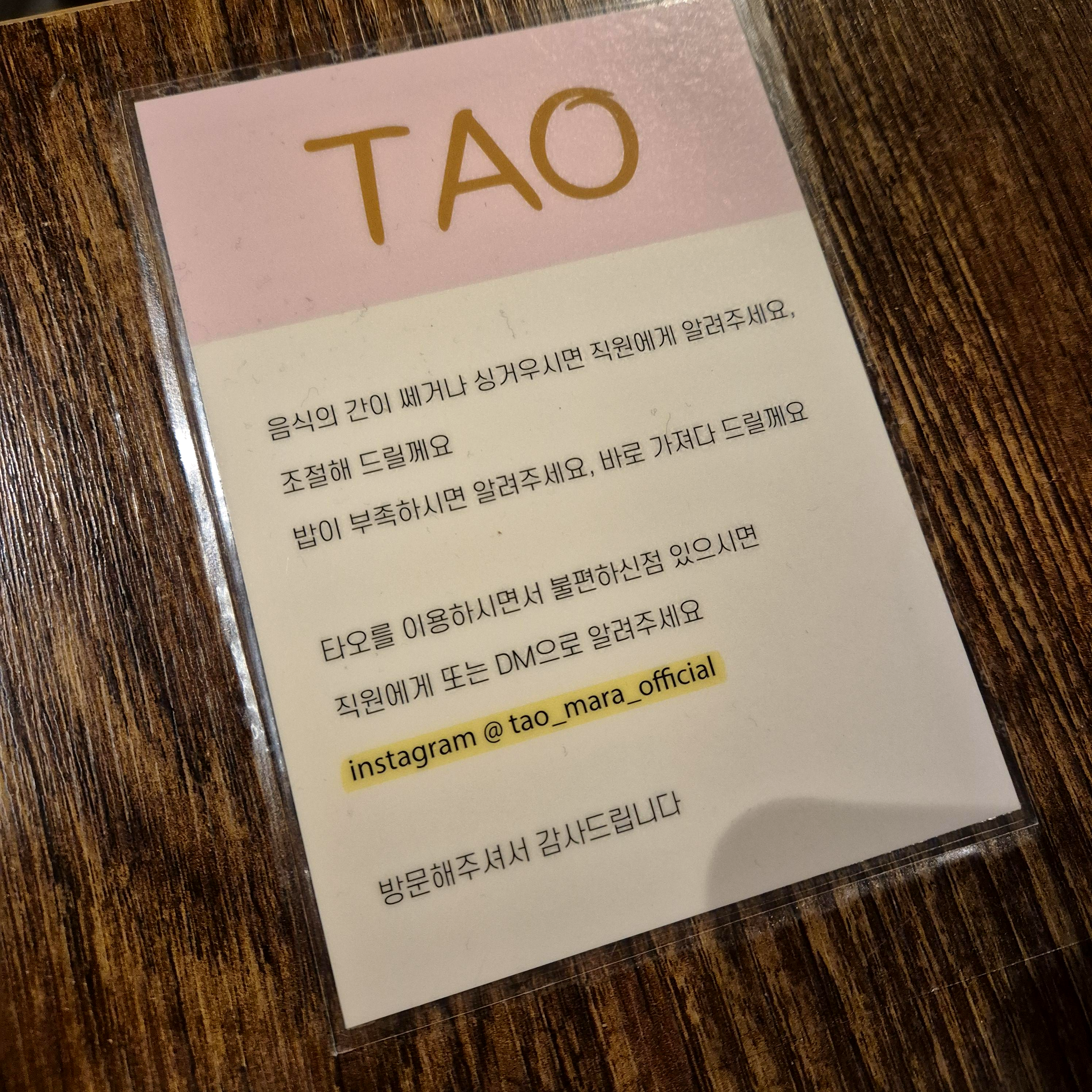 뭔가 마음에 드는 안내글(?)이다. 불편한 부분을 언제든지 수용하겠다는 'TAO'의 마음가짐이 보인달까. 살짝 감동받고, 이제 마라탕을 담으러 갔다 =)